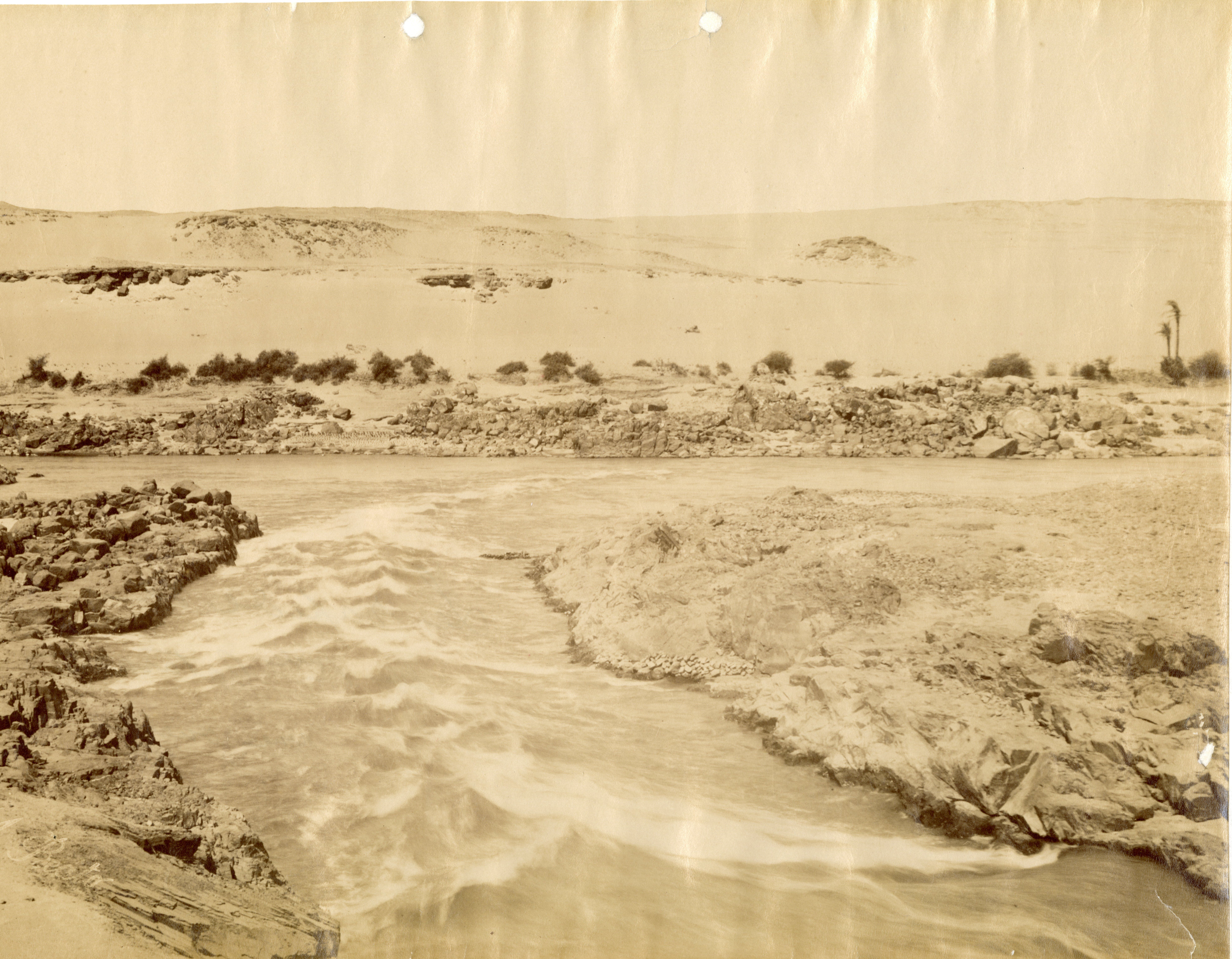 The photograph shows a view of the panorama and the rocks emerging from the Nile at the First Cataract, near Aswan. Today, the First Cataract has been submerged by Lake Nasser, which was created as a result of the construction of the Aswan Dam in the 1960s. The author's signature is visible at the bottom left.