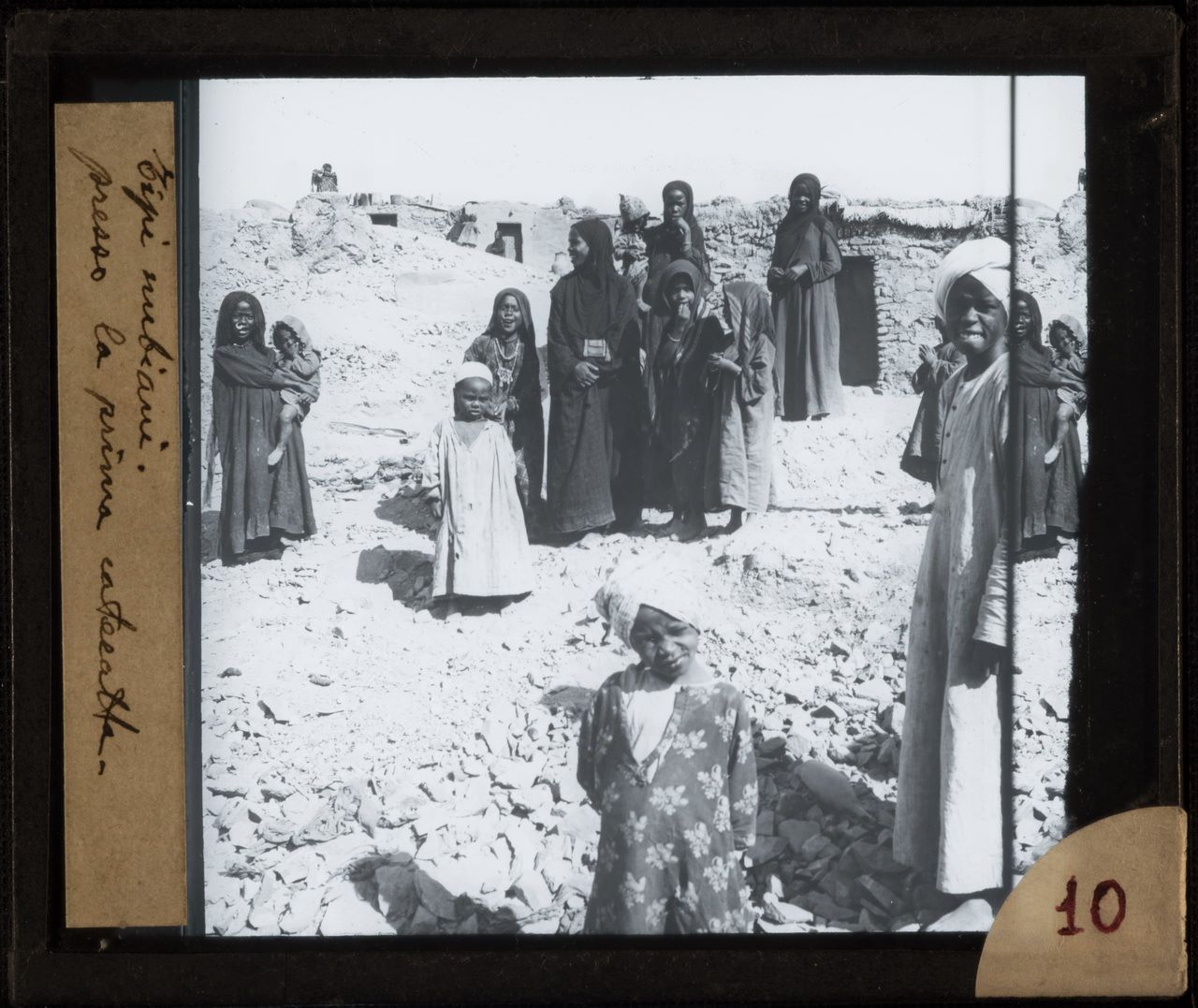 Group of Egyptians posing at the First Cataract in Aswan, with housing constructed of raw earth in the background.