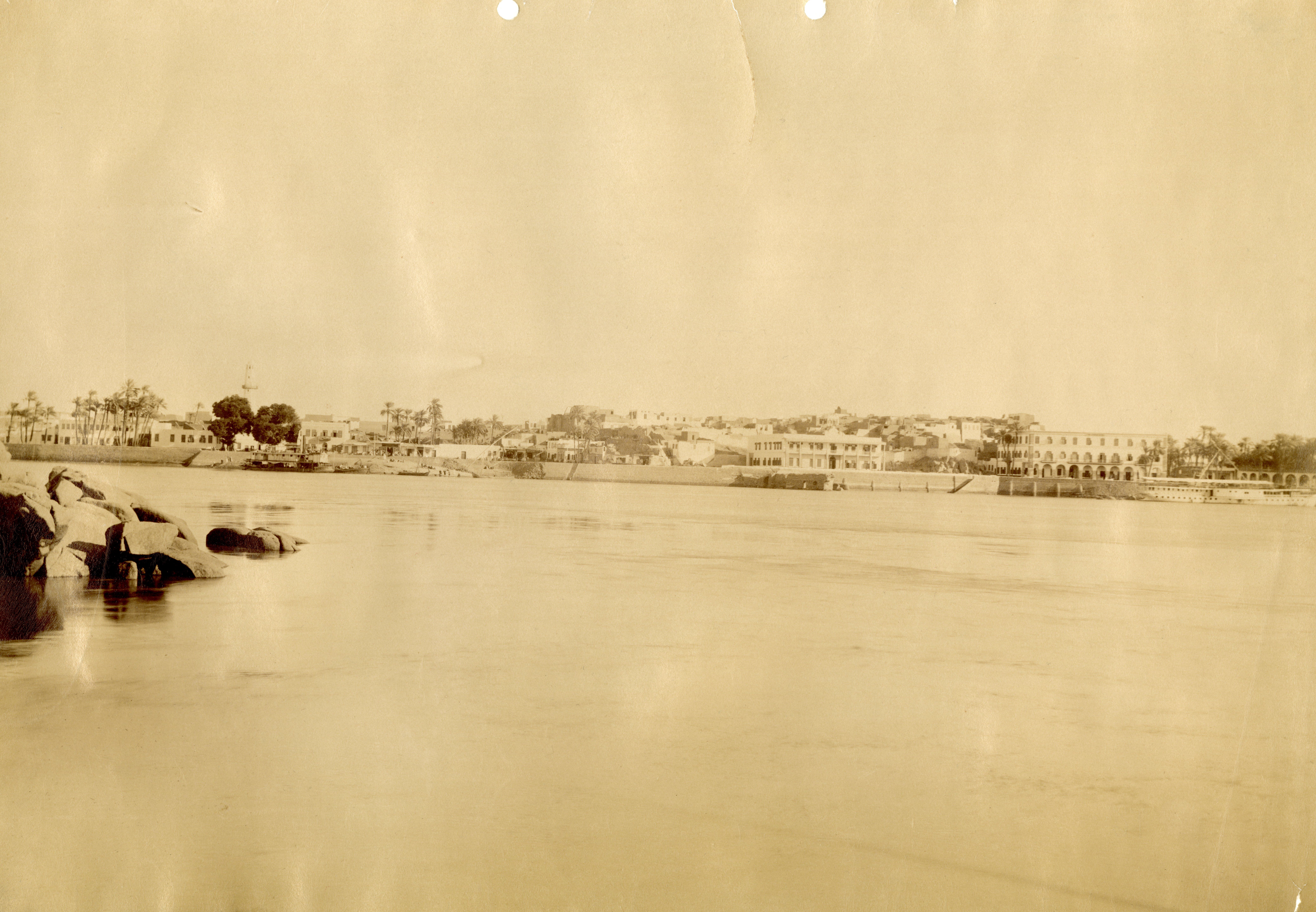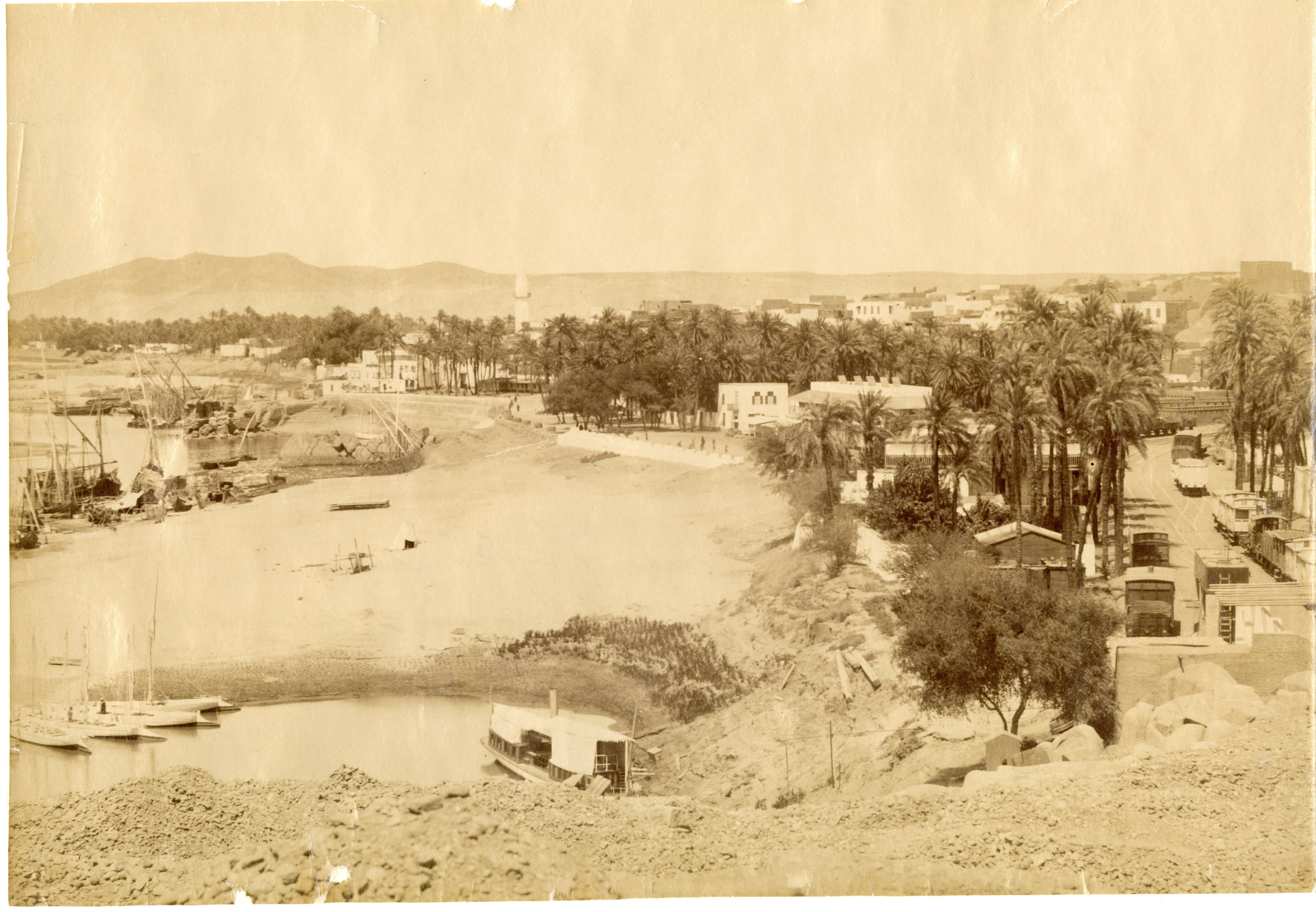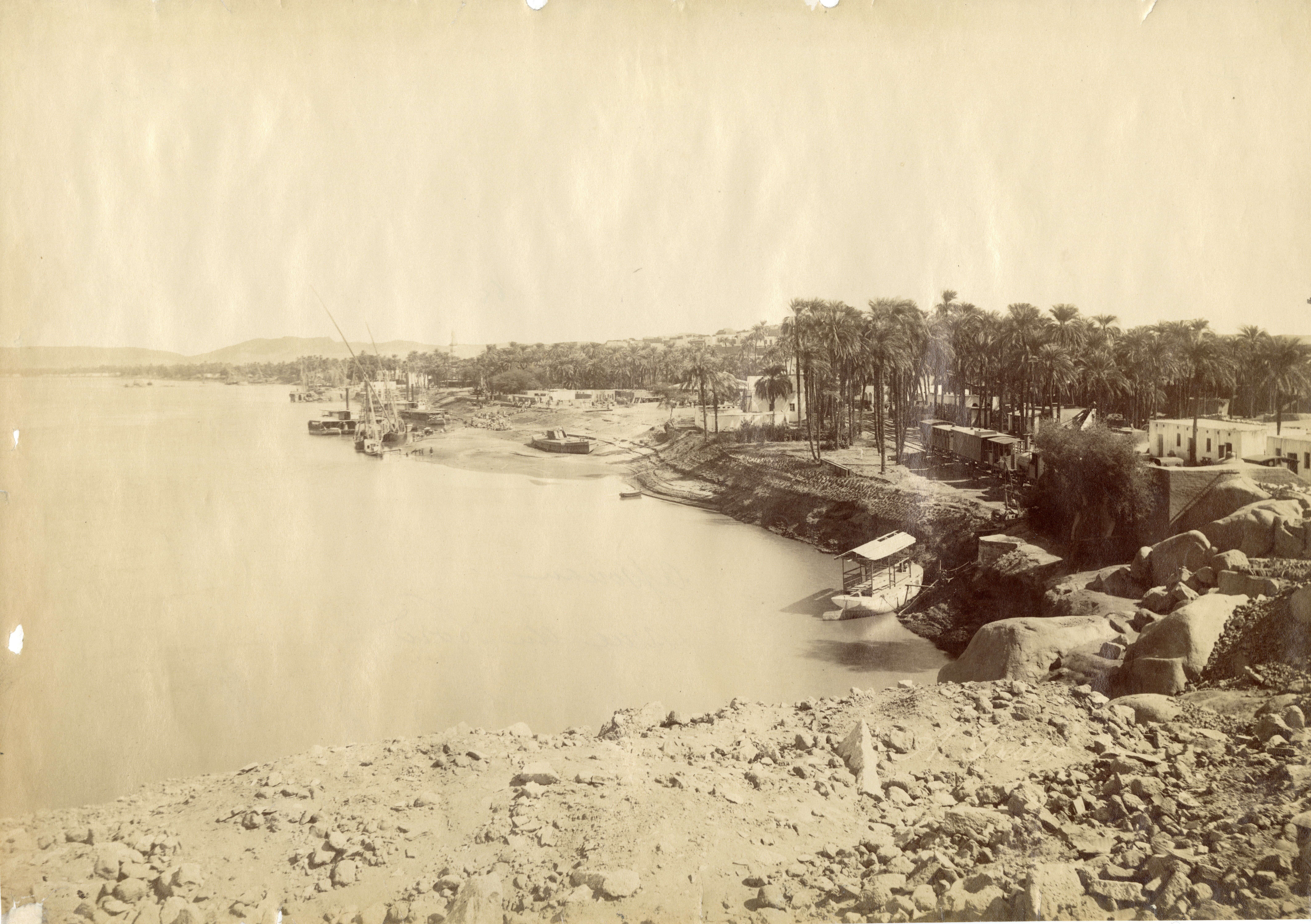 Panorama showing a small town on the banks of the Nile, probably Aswan. In the centre, a small island. Photograph taken from the west bank of the river. The author's signature (faded) is at the bottom right.