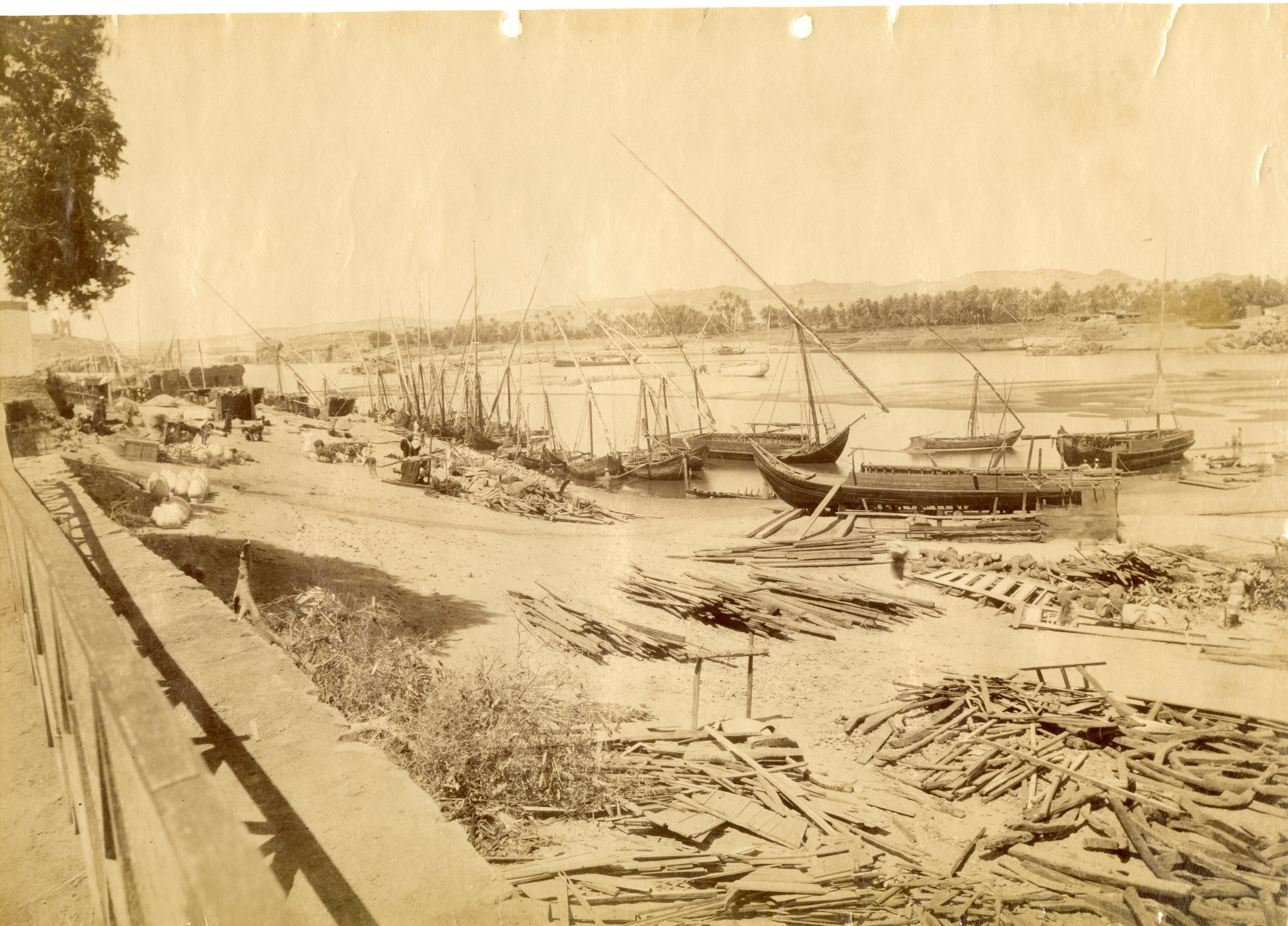 The photograph shows a panorama of the 19th century village of Aswan, photographed from the west bank of the Nile.