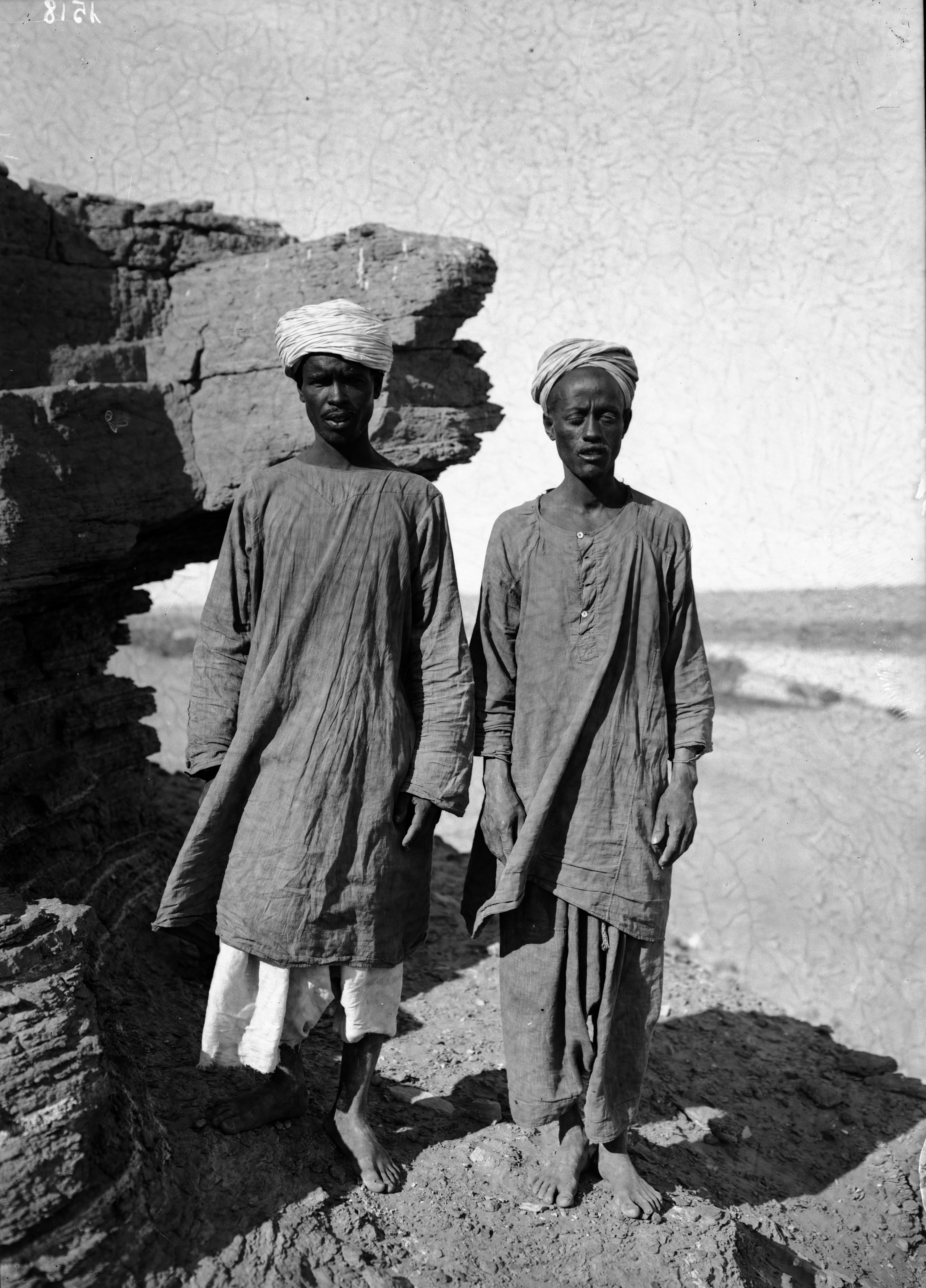 Egyptian couple photographed presumably near Qubbet el-Hawa, in the background, the Nile. Schiaparelli excavations.