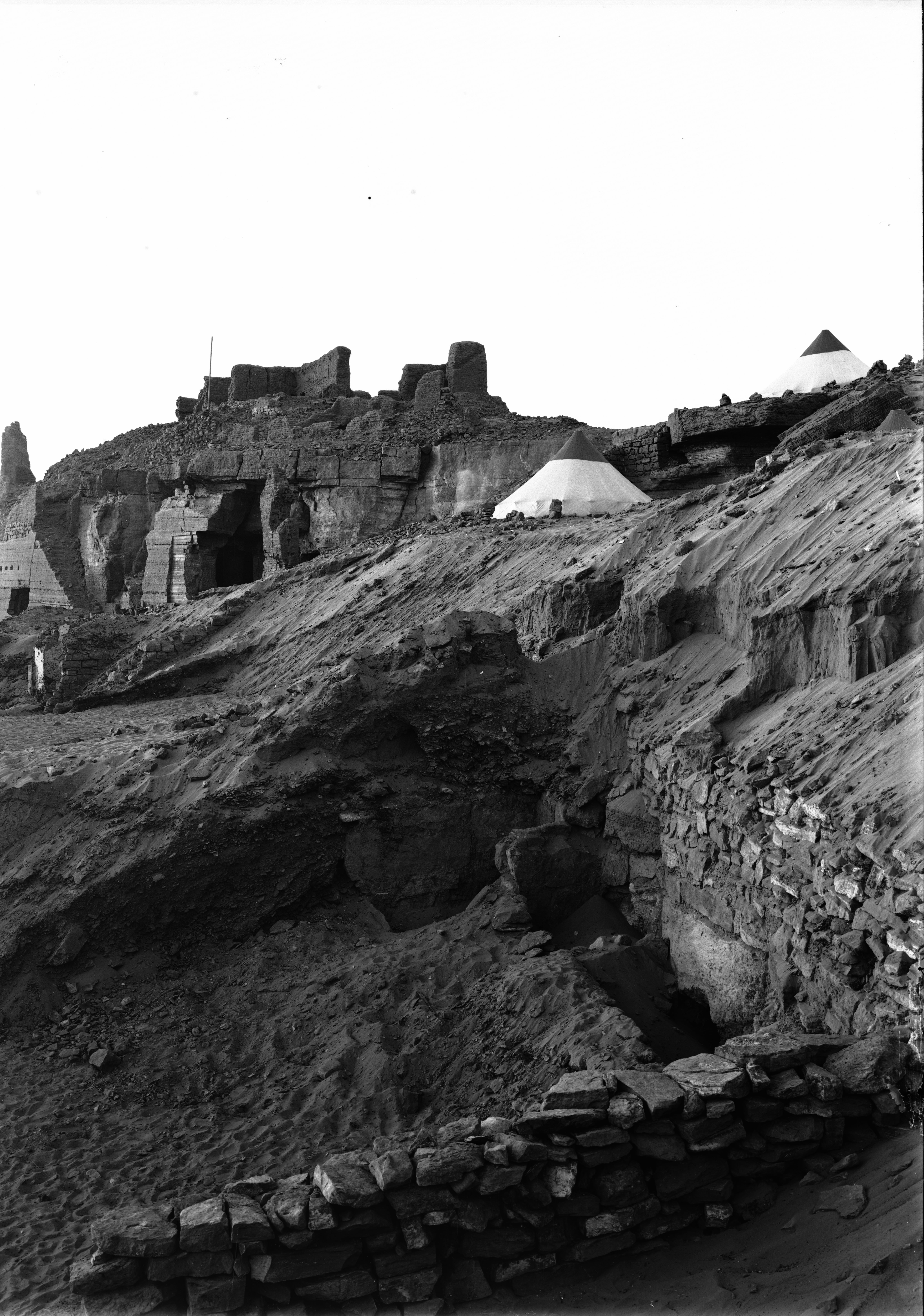 Excavating the rock-cut tombs of Qubbet el-Hawa. At the top, the dome of the tomb of sheik el-Hawa can be seen. Schiaparelli excavations.