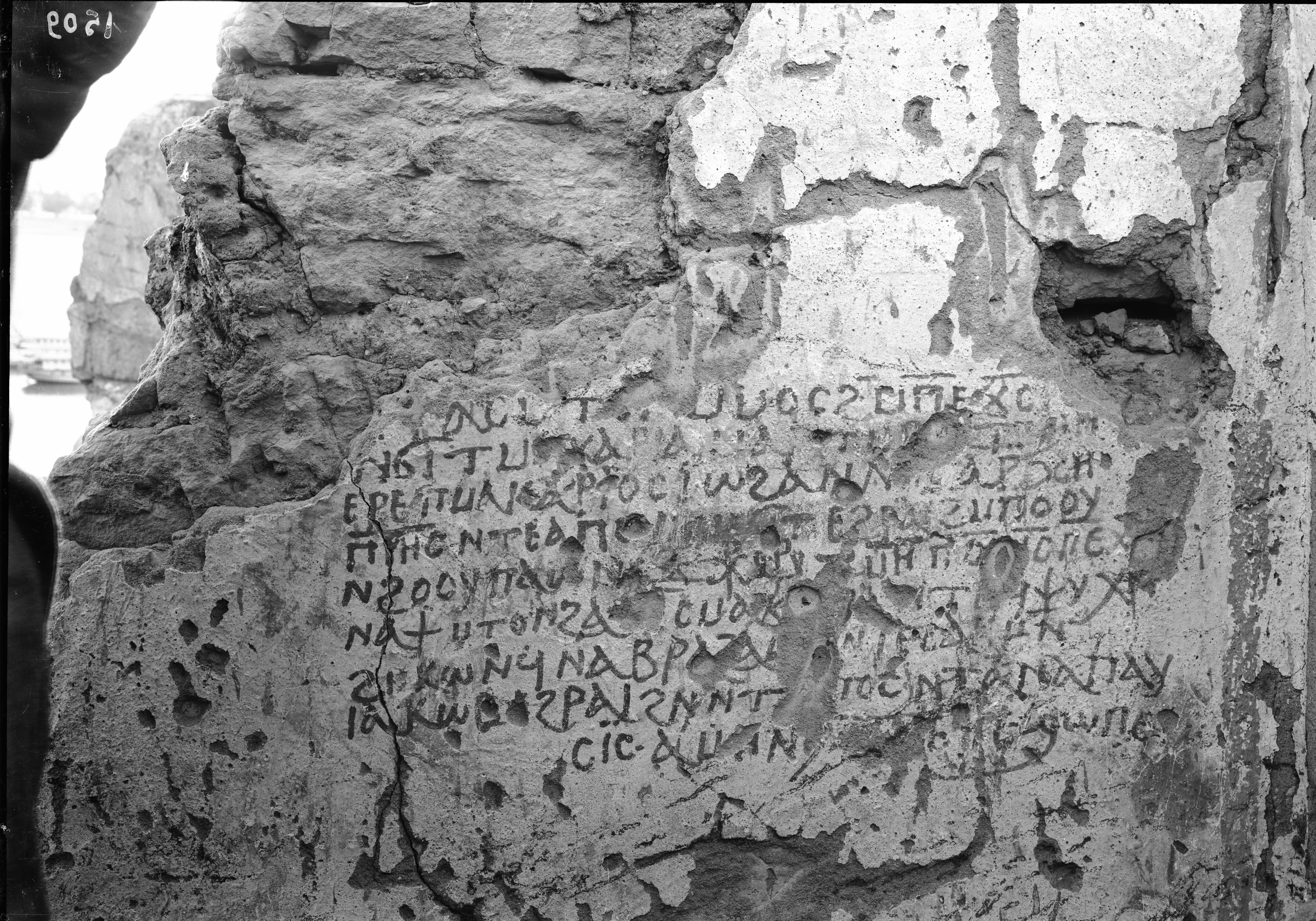 Coptic inscription photographed in Qubbet el-Hawa, in the background, the Nile and a boat. Schiaparelli excavations.
