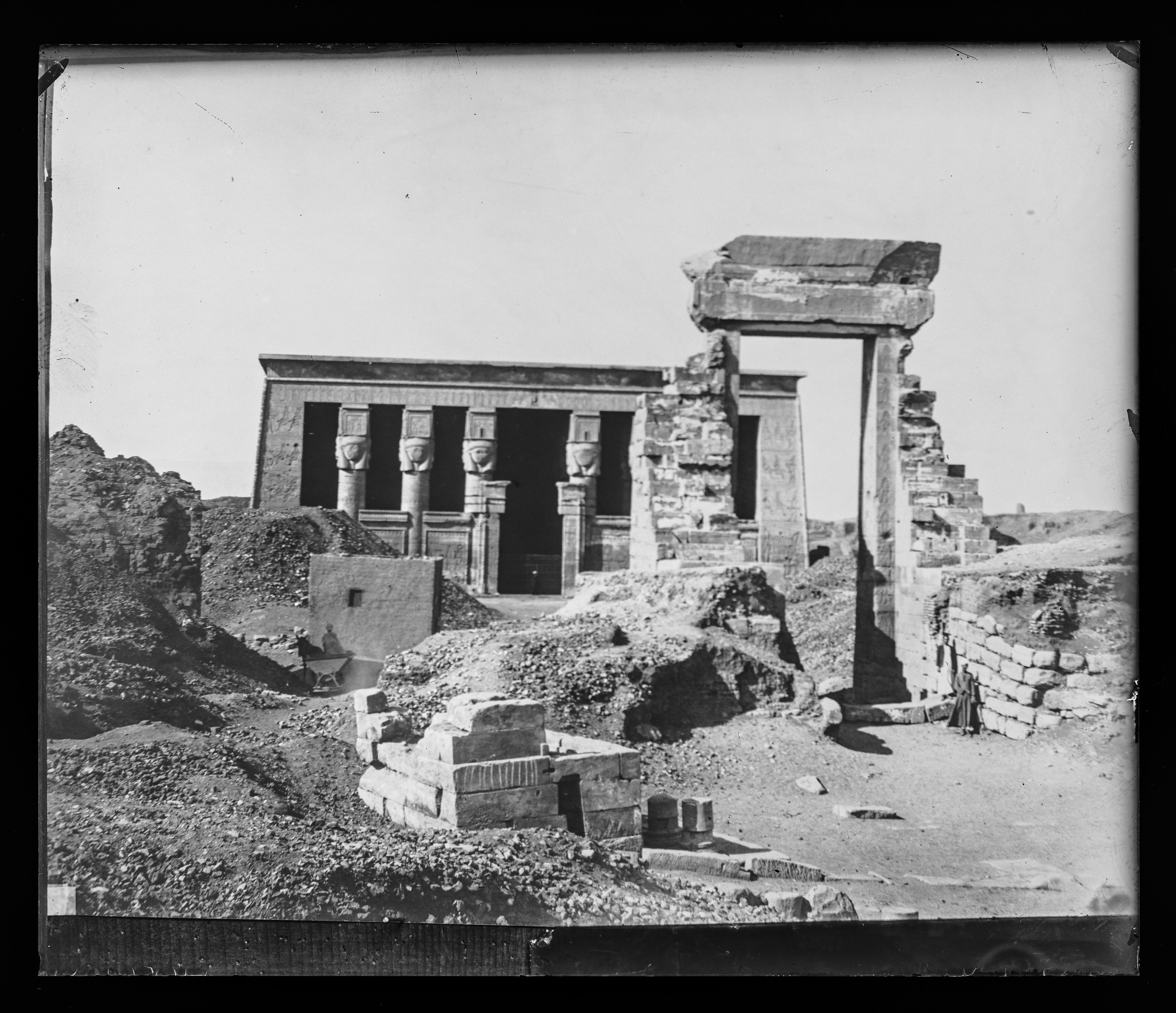Entrance pylon and columned pronaos with Hathor capitals from the Temple of Hathor at Dendera. Probably a 19th century photograph.