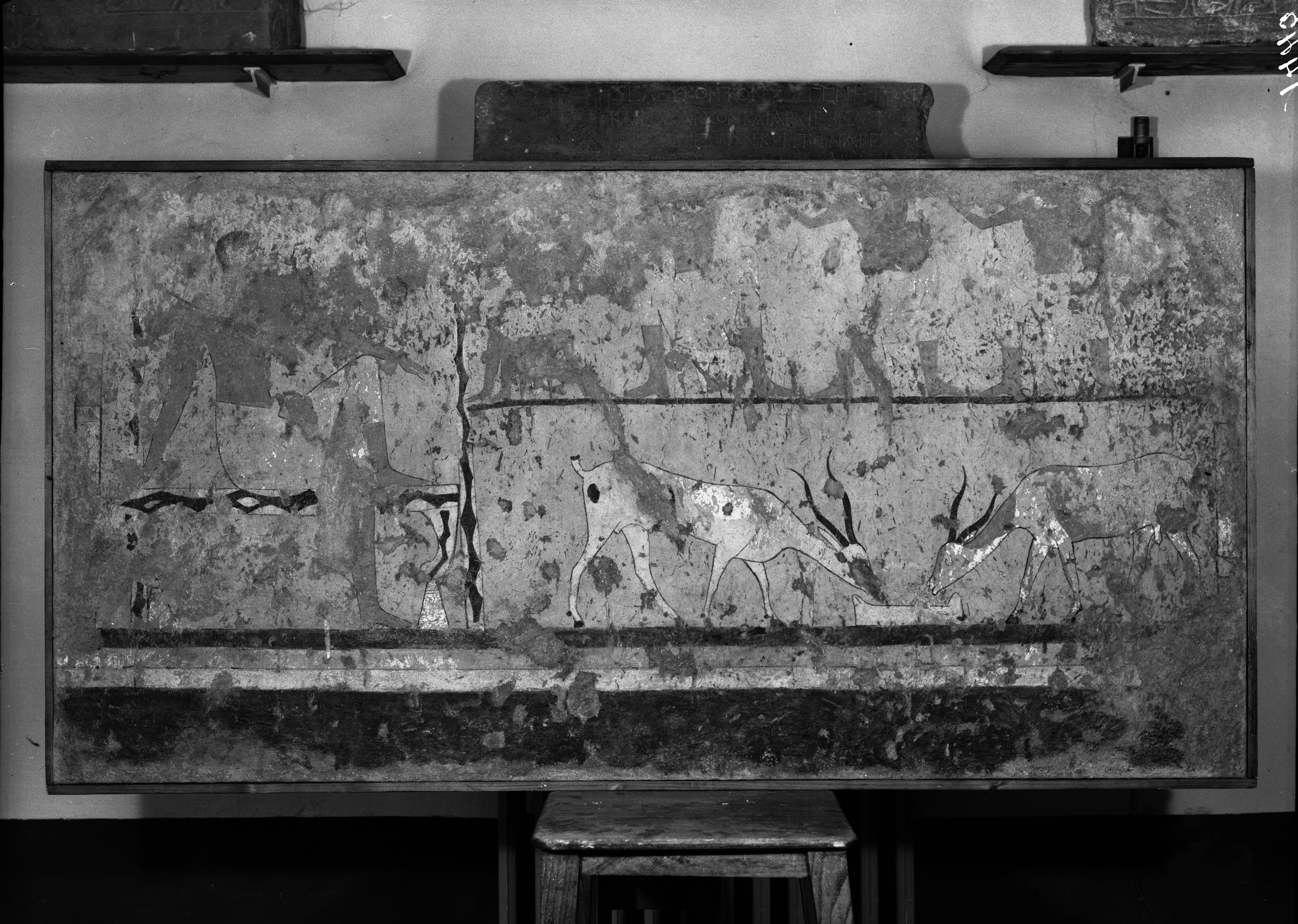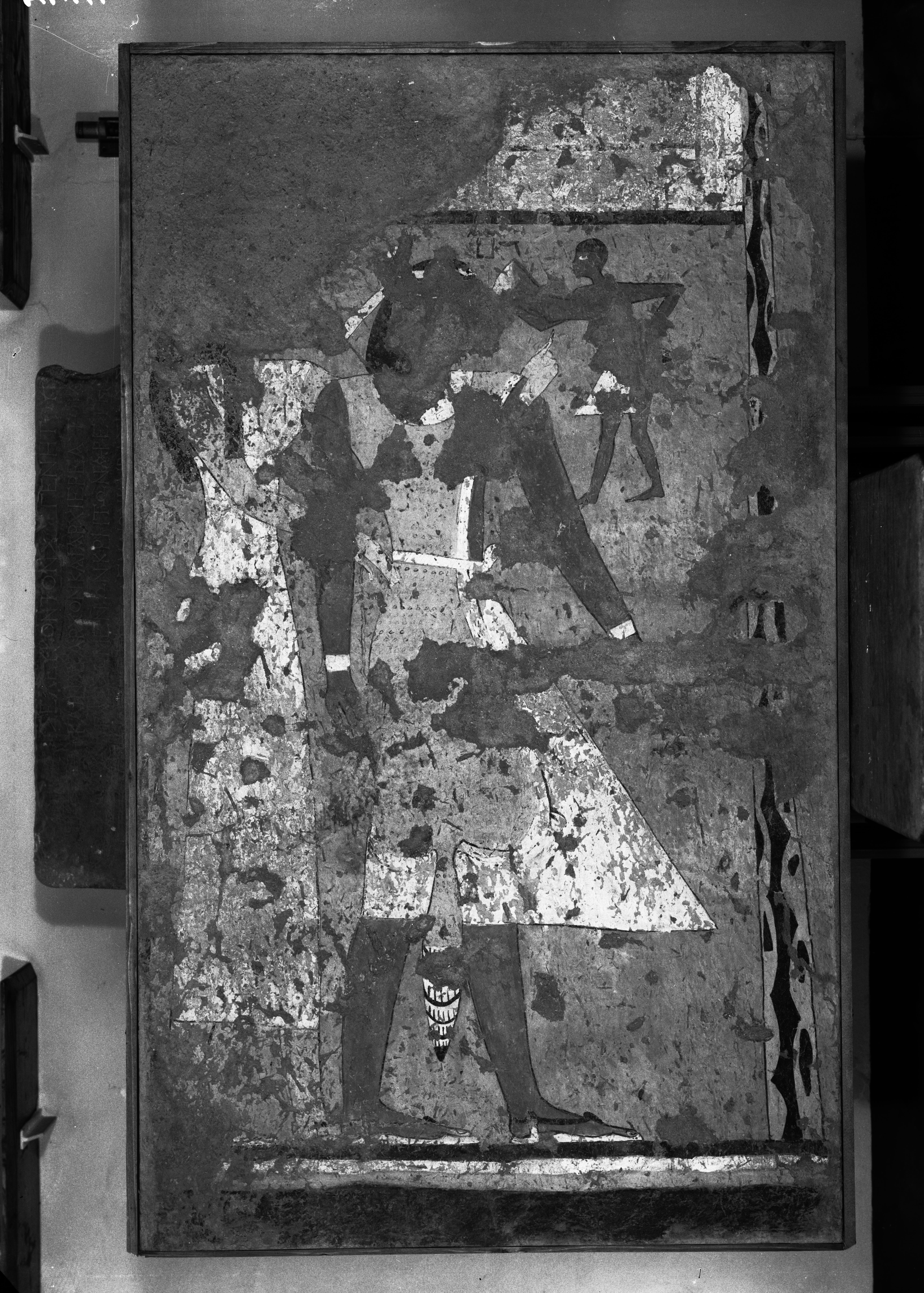 Tomb of Iti and Neferu. Museum display. During the 1911 excavation campaign. While excavating the tomb, precious tempera paintings were brought to light. In addition to their funerary context, they also document tasteful scenes related to daily life in an agricultural setting. The paintings were then detached and brought to the Museum during the campaign of 1913-14, as documented by these pictures. The photograph shows the back wall, right side, of the deceased’s cult chapel, depicting the couple in an affectionate pose wearing white ceremonial clothes. Schiaparelli excavations.(S.14354/10)