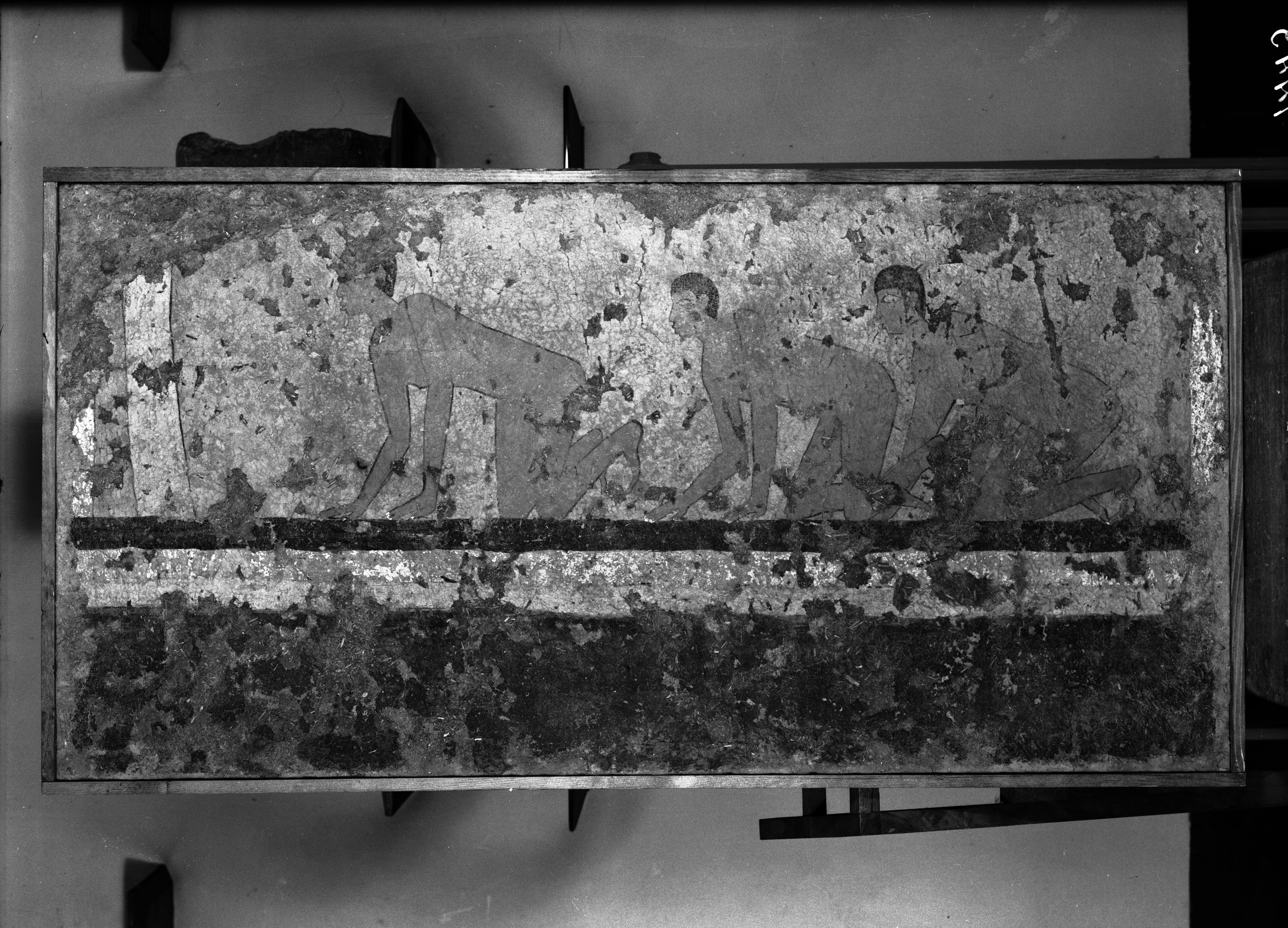 Tomb of Iti and Neferu. The painting depicts three male figures with short kilts, each accompanied by women wearing long white dresses. The central figure, with slightly larger proportions could possibly be Iti. For unknown reasons this painting did not reach Turin, perhaps it was damaged during its detachment. In addition to this image, there are notes from Virginio Rosa, placing the painting on the stretch of wall between the eighth and ninth rooms. Schiaparelli excavations.