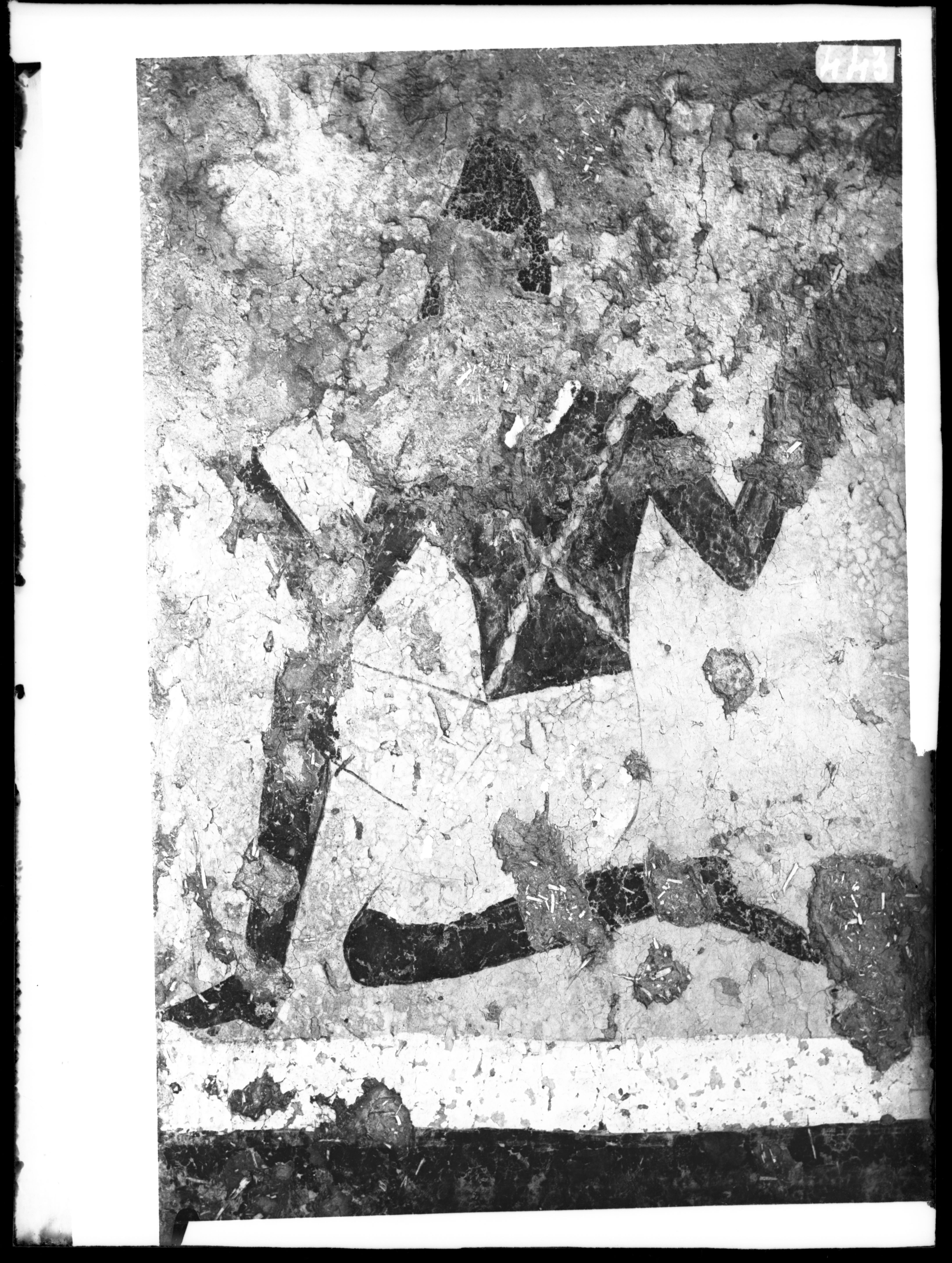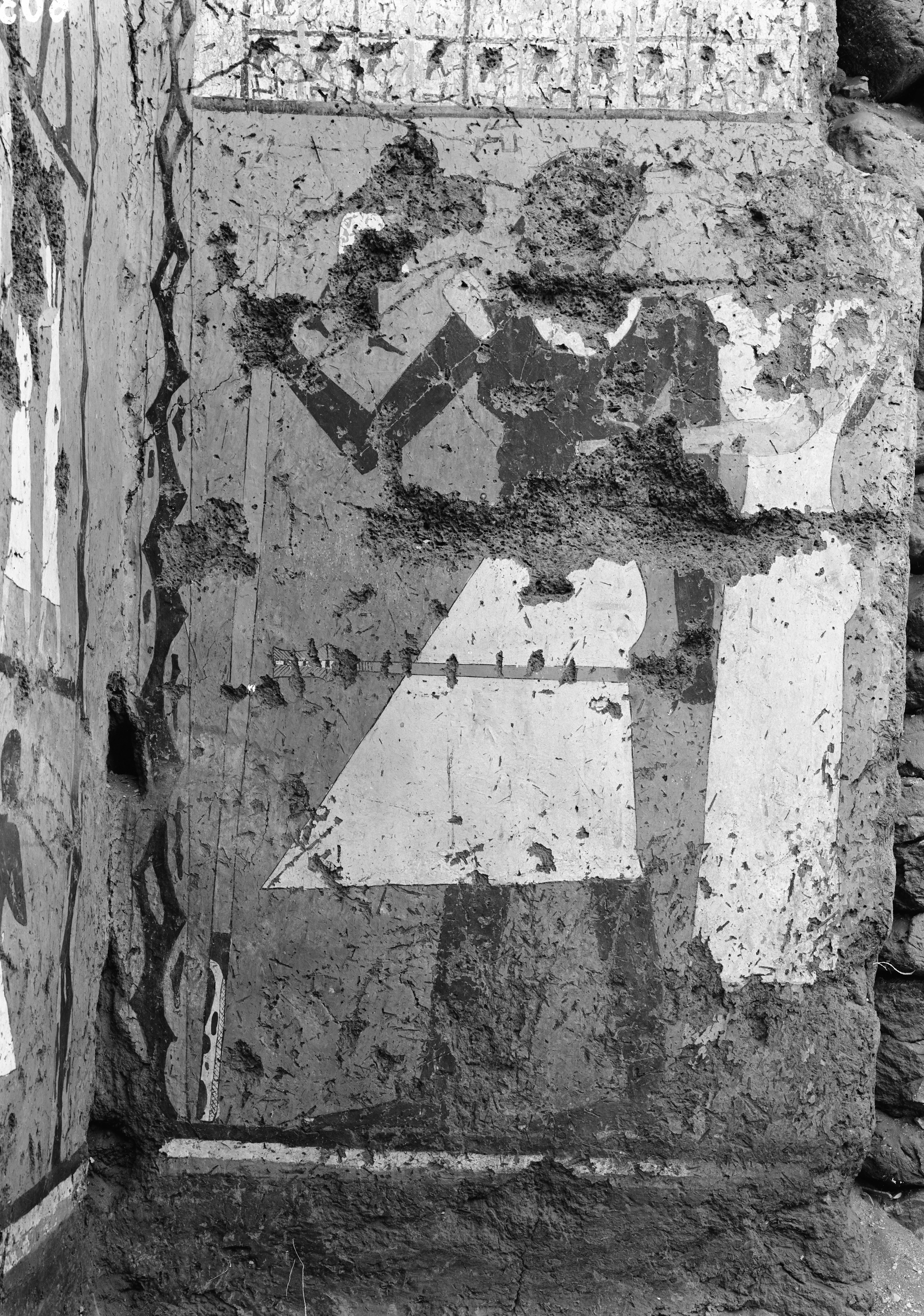 Tomb of Iti and Neferu. The facade of the tomb, protected by the long portico, had 11 openings that led into as many rooms; the stretches of wall between each opening were decorated. This photograph documents the first fragmentary painting (starting from the south), depicting some cranes. Schiaparelli excavations.