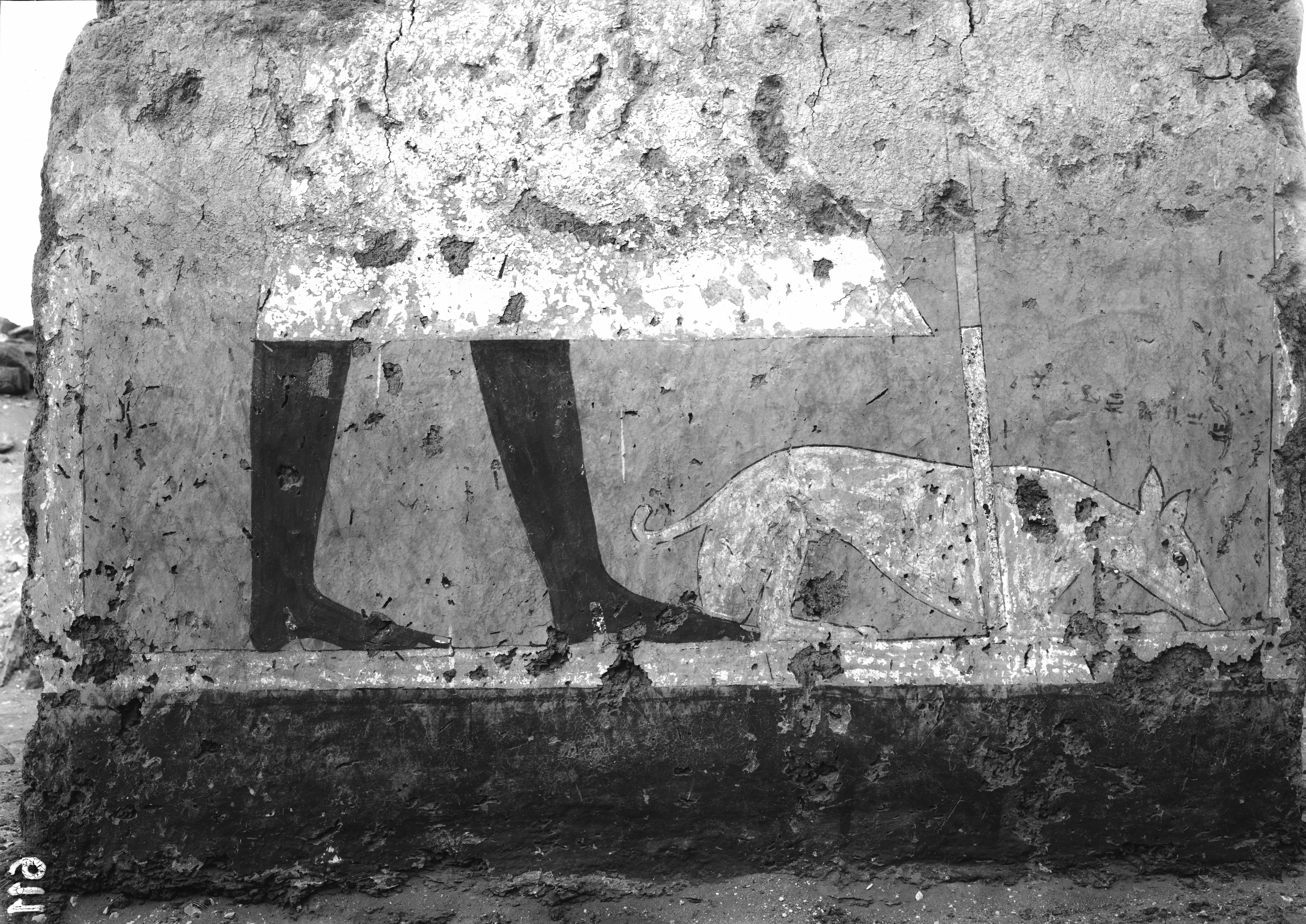Tomb of Iti and Neferu. This photograph, showing only the left side of the painting, depicts one of two male figures followed by a pair of greyhounds, probably in the presence of Iti.