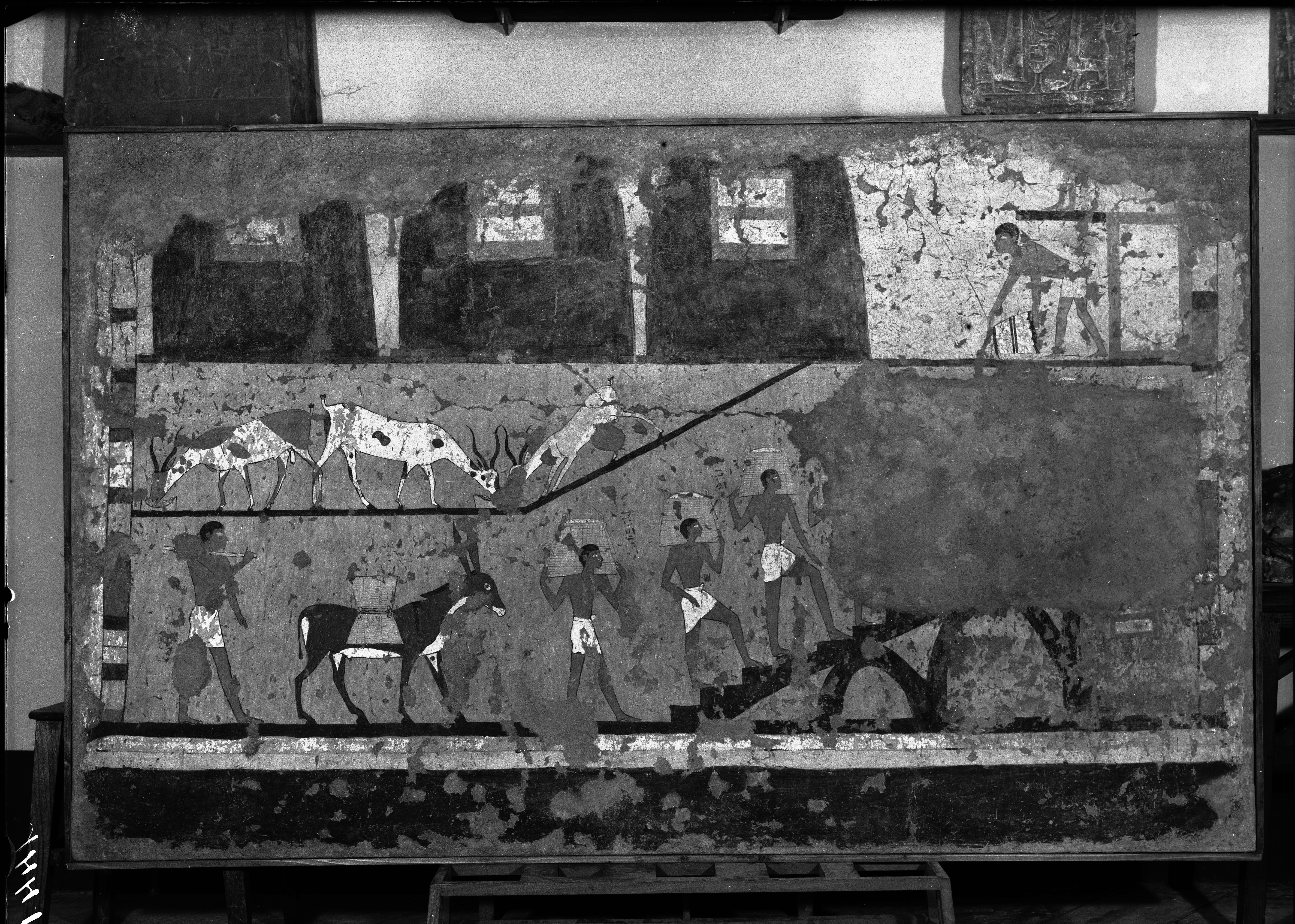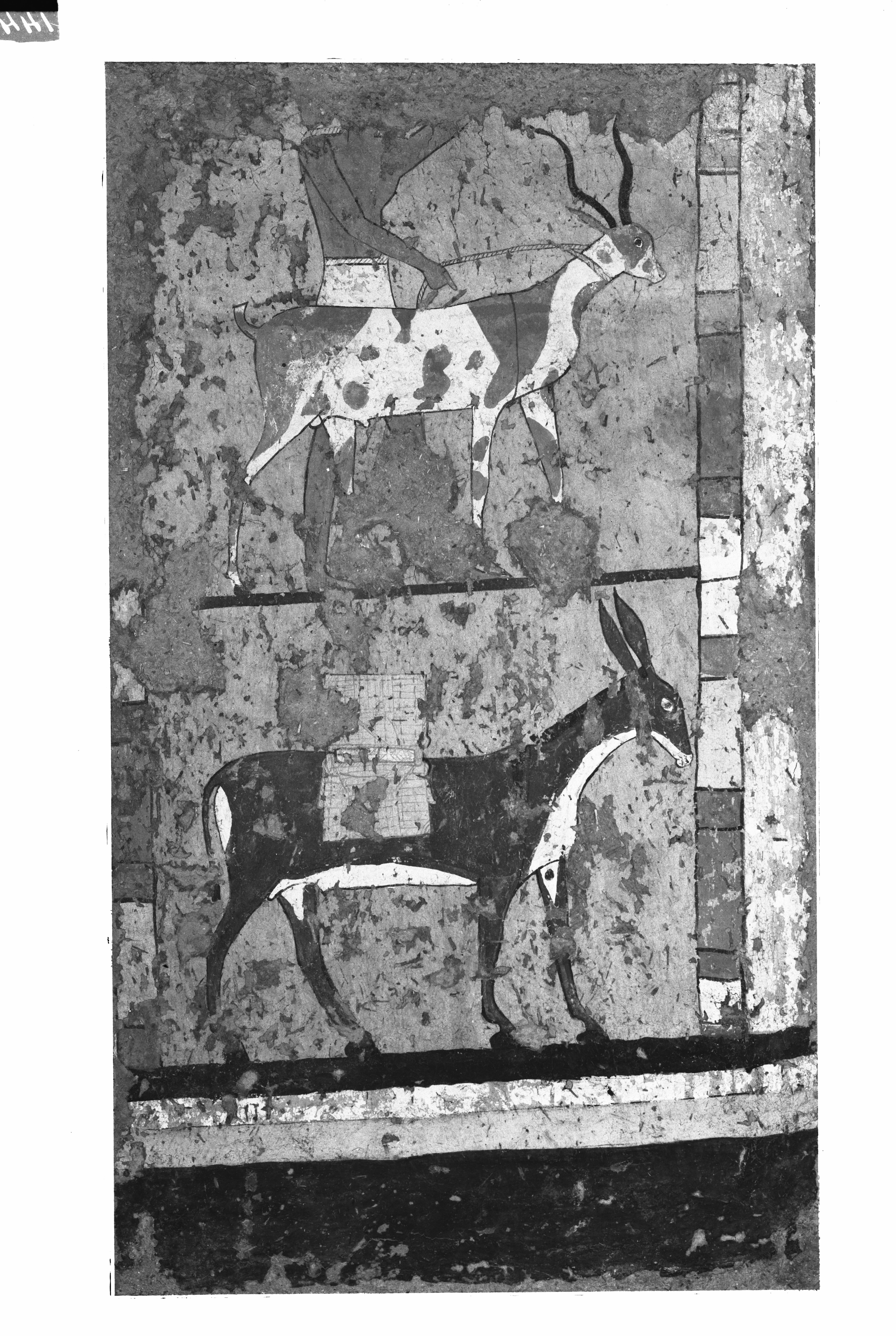 Tomb of Iti and Neferu. End wall of the south-facing facade. This scene is divided into two panels. At the top, an antelope is shown held on a leash by a man. At the bottom, one of the many donkeys loaded with grain is about to reach the granary; depicted on the back wall of the portico. Schiaparelli excavations. (S.14354/22)