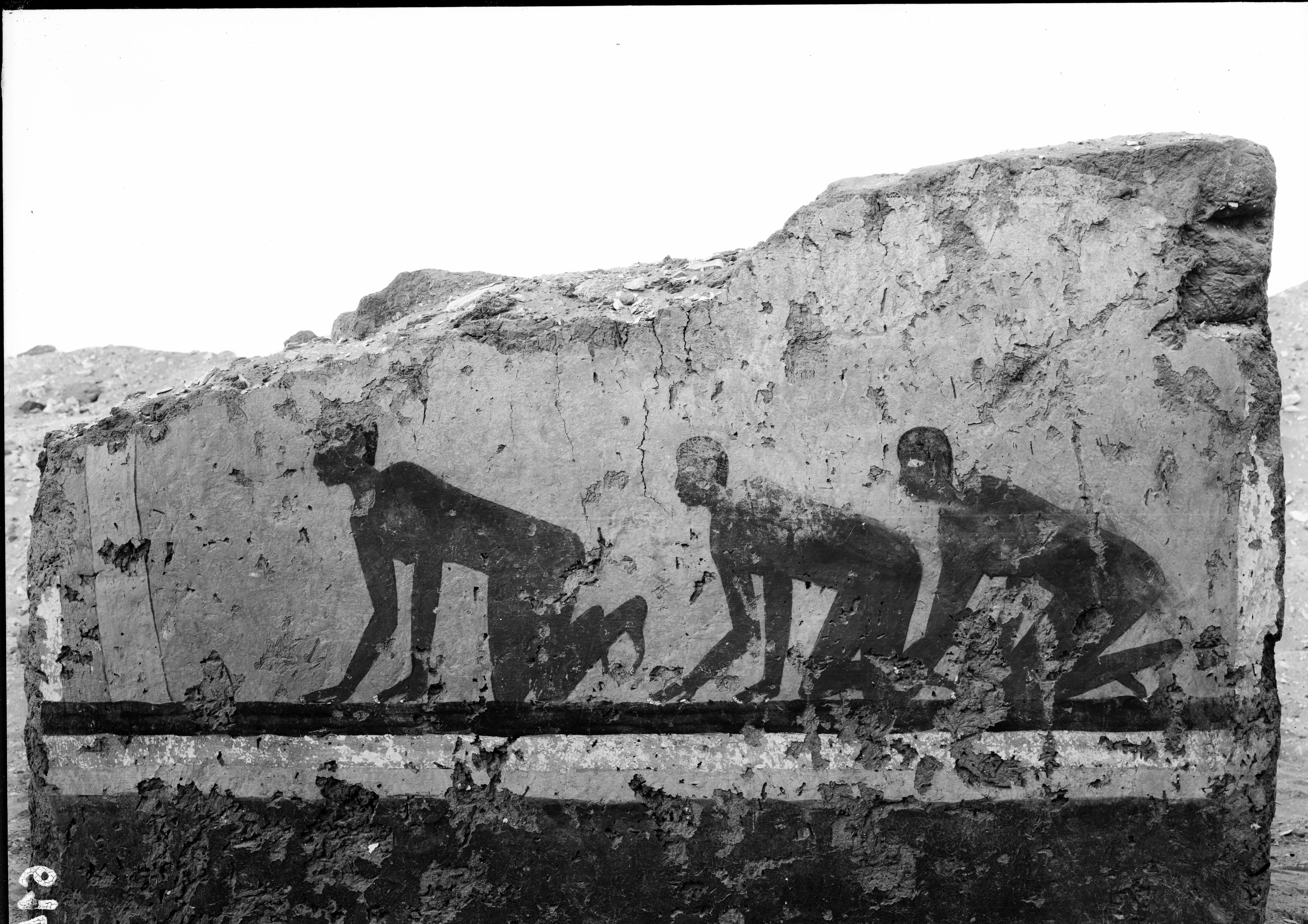 Tomb of Iti and Neferu. Pillar number 11. Three young male figures are depicted kneeling, their nudity suggests that they are war captives. Schiaparelli excavations.