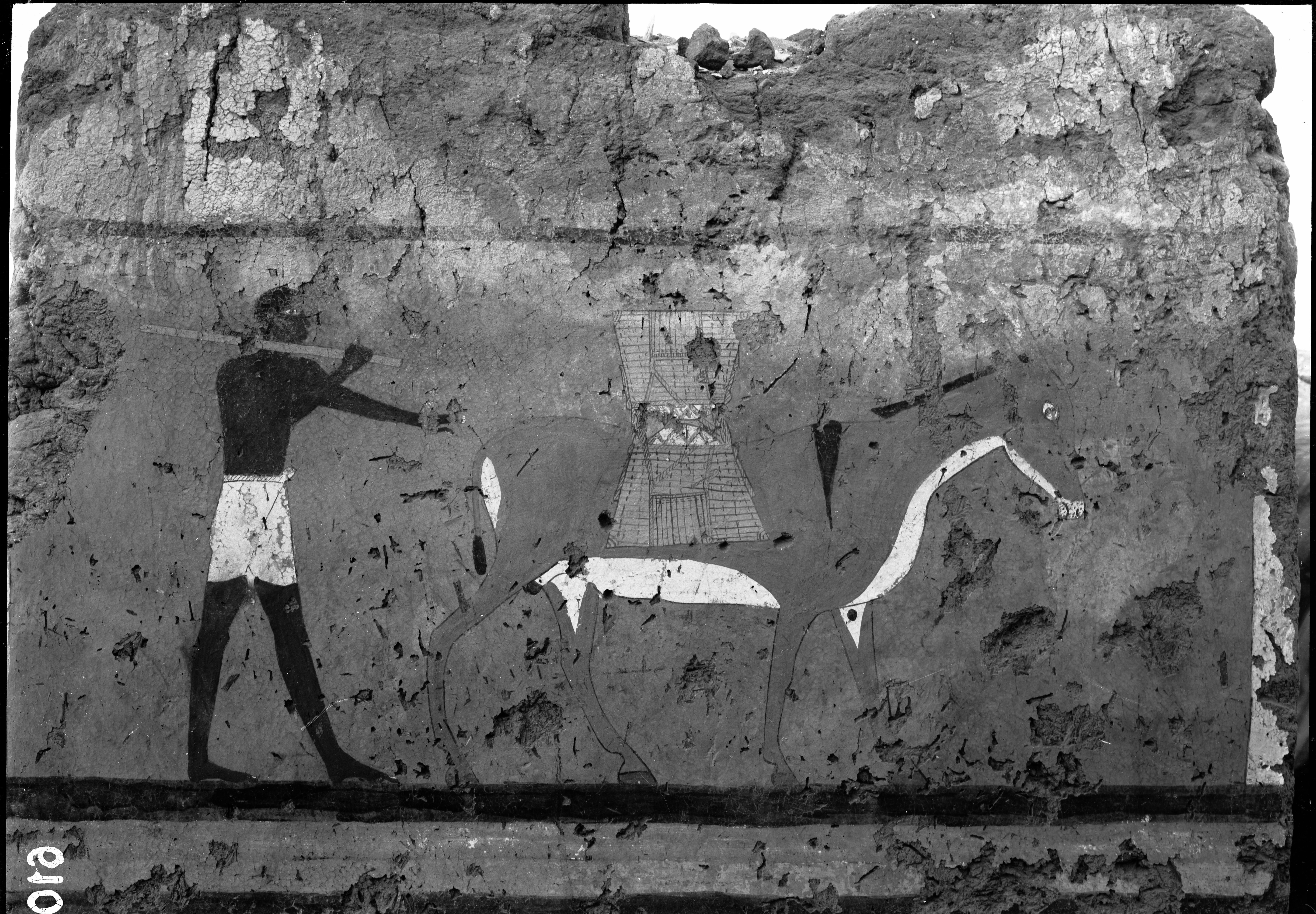 Tomb of Iti and Neferu. Pillar number 13. A scene showing one of the donkeys in the troop on its way to the granary. The donkey, preceded by its young, carries two baskets tied together; the one on its left side (usually not seen) is drawn above the other in order to make it visible. Schiaparelli excavations. (S.14354/20)