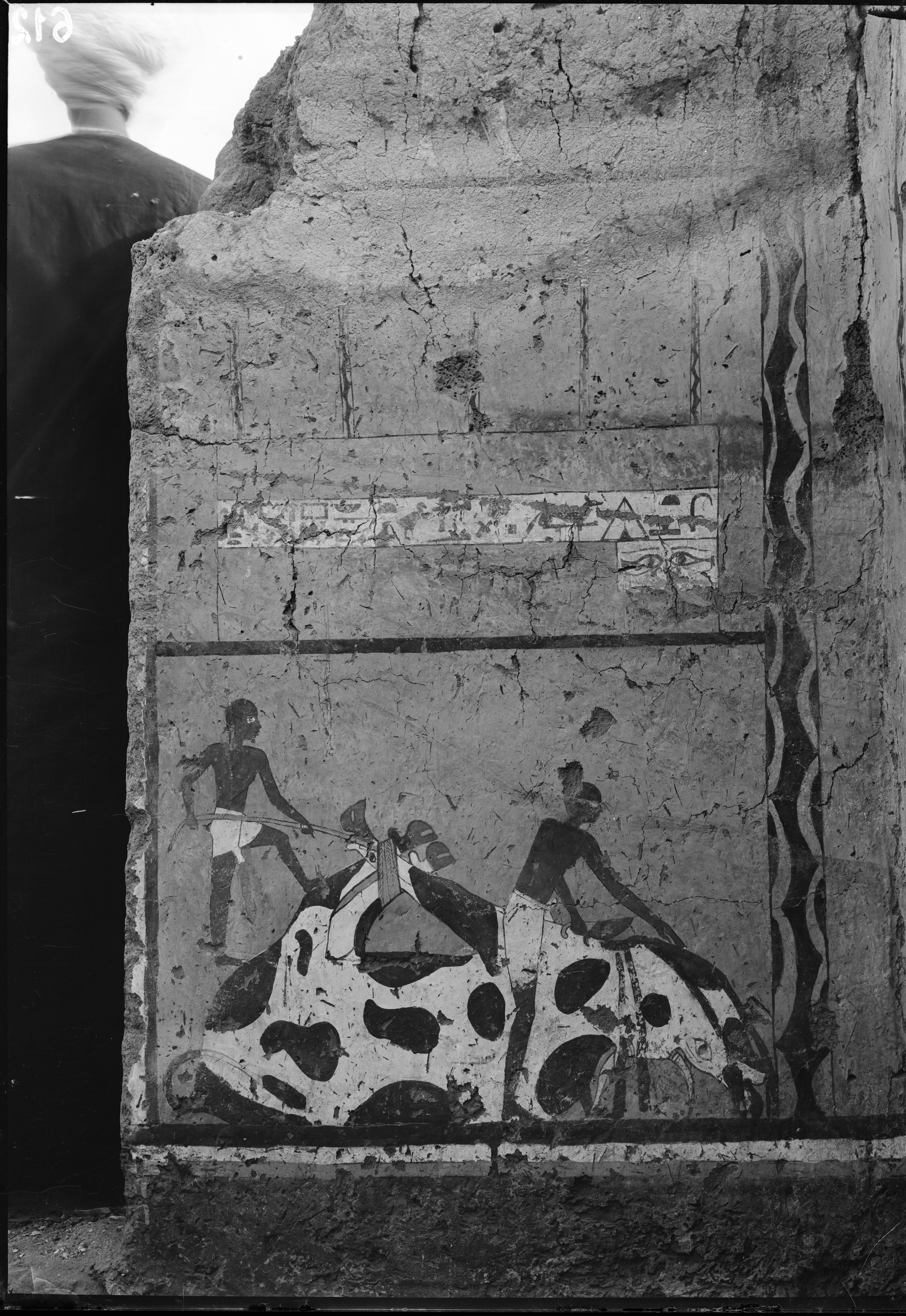 Tomb of Iti and Neferu. View of the left side-wall from the deceased’s cult chapel. At the top, women are depicted with their hands raised in what appears to be a funeral send-off. At the bottom, a herdsman leads two cows towards the interior of the chapel, to demonstrate the availability of food for the deceased. Schiaparelli excavations.