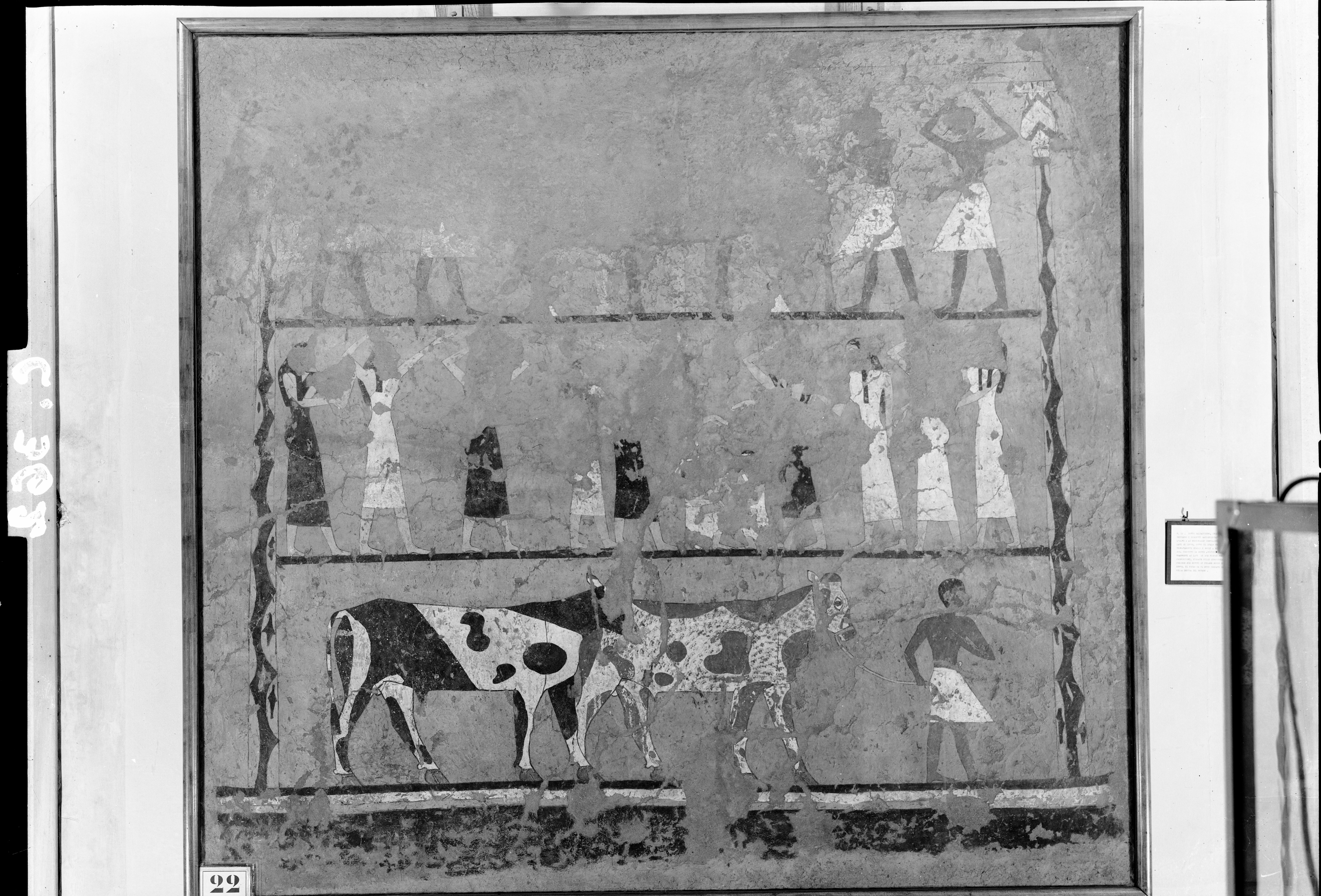 Tomb of Iti and Neferu. Museum display. In the two upper registers men and women are depicted with raised hands, probably in the act of mourning. At the bottom, a herdsman leads two different types of cattle. Schiaparelli excavations. (S.14354/9)