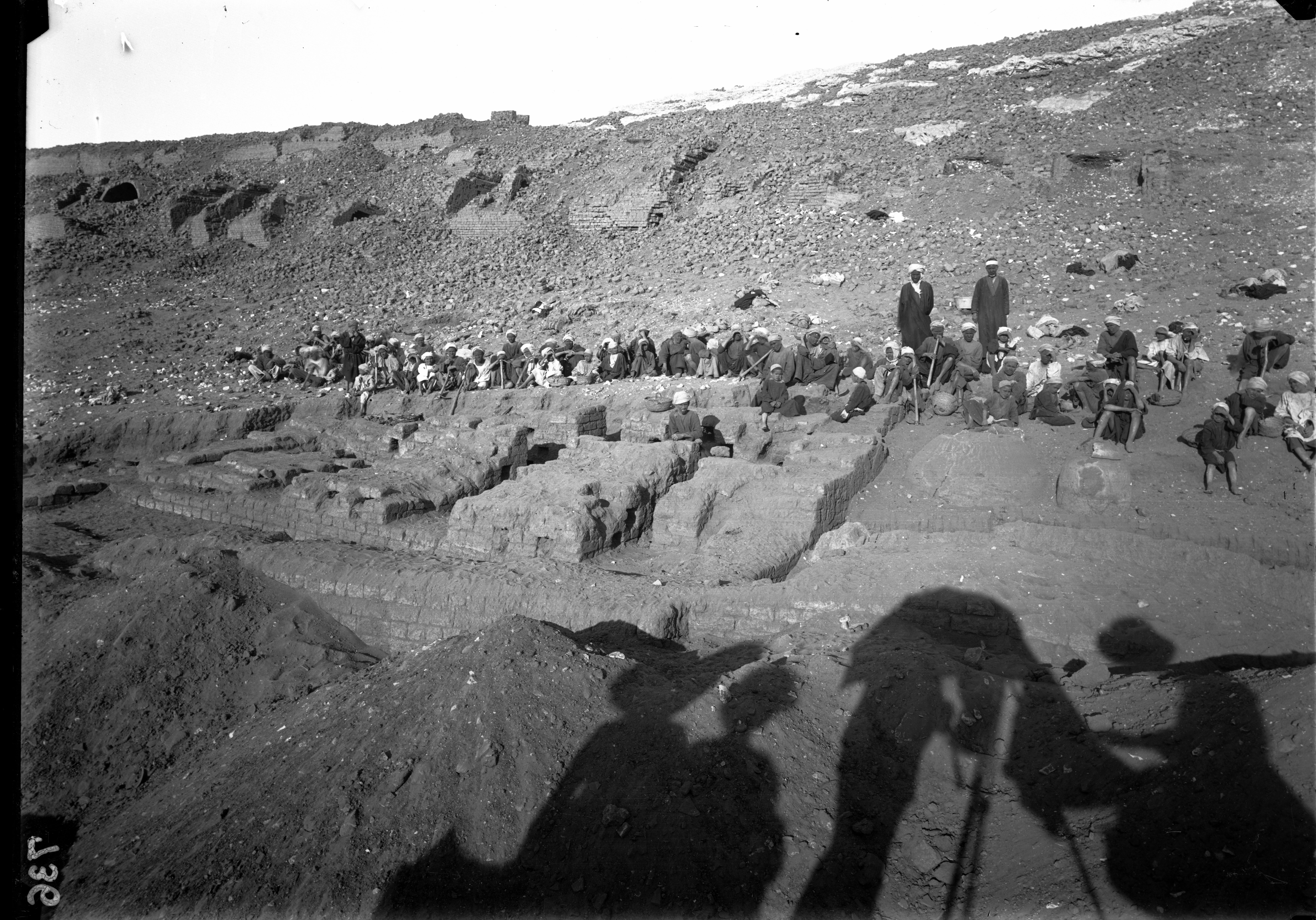 Excavations at the foot of the southern hill, western side. The workers (many of them very young) are on a break in order to photograph the site without their presence, and to avoid the inconvenience caused by dust clouds when excavating. Whilst taking the photo, the sun has projected the shadows of the people close to the camera onto the ground, including the figure of Ernesto Schiaparelli who is under a parasol. Schiaparelli excavations.