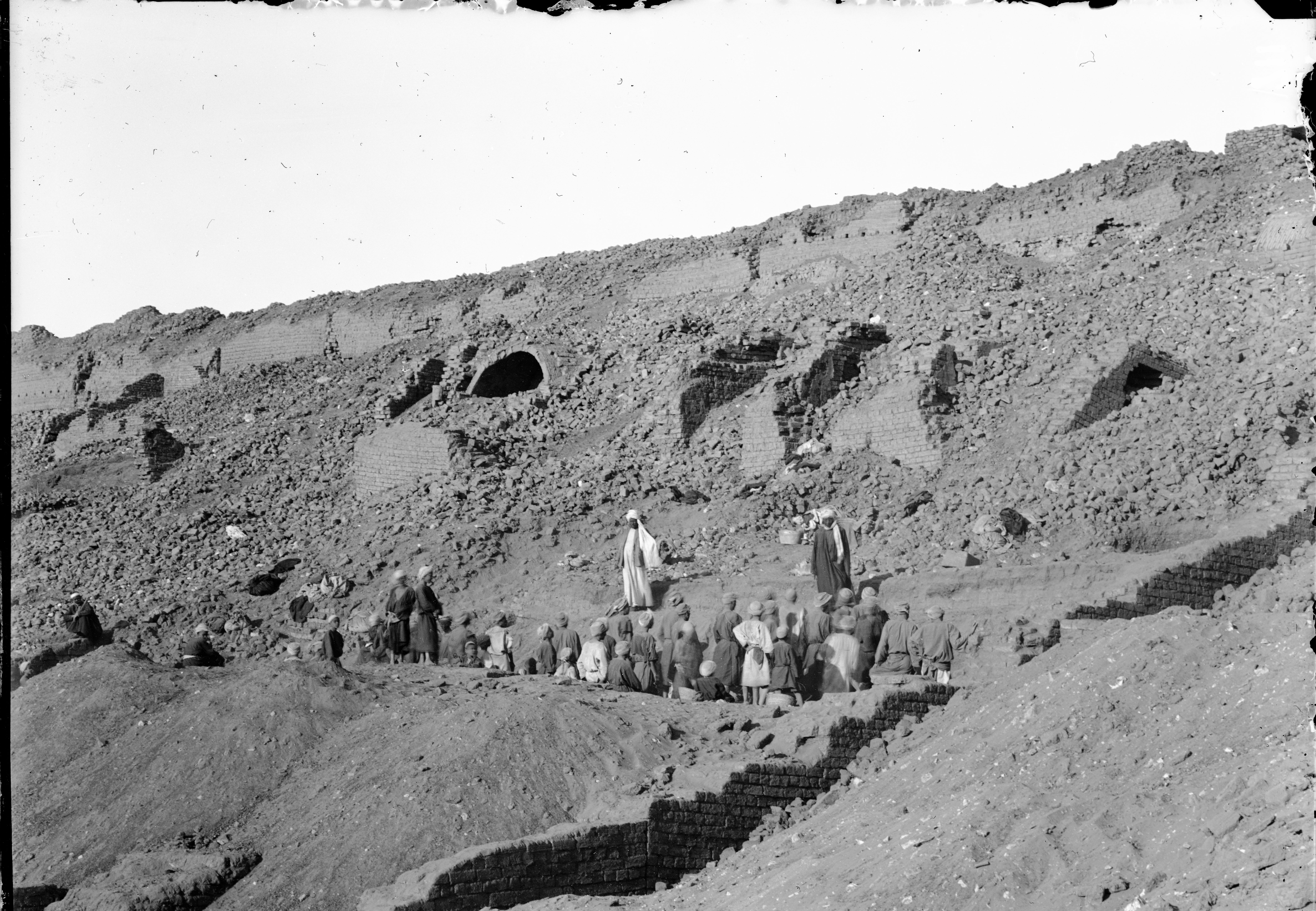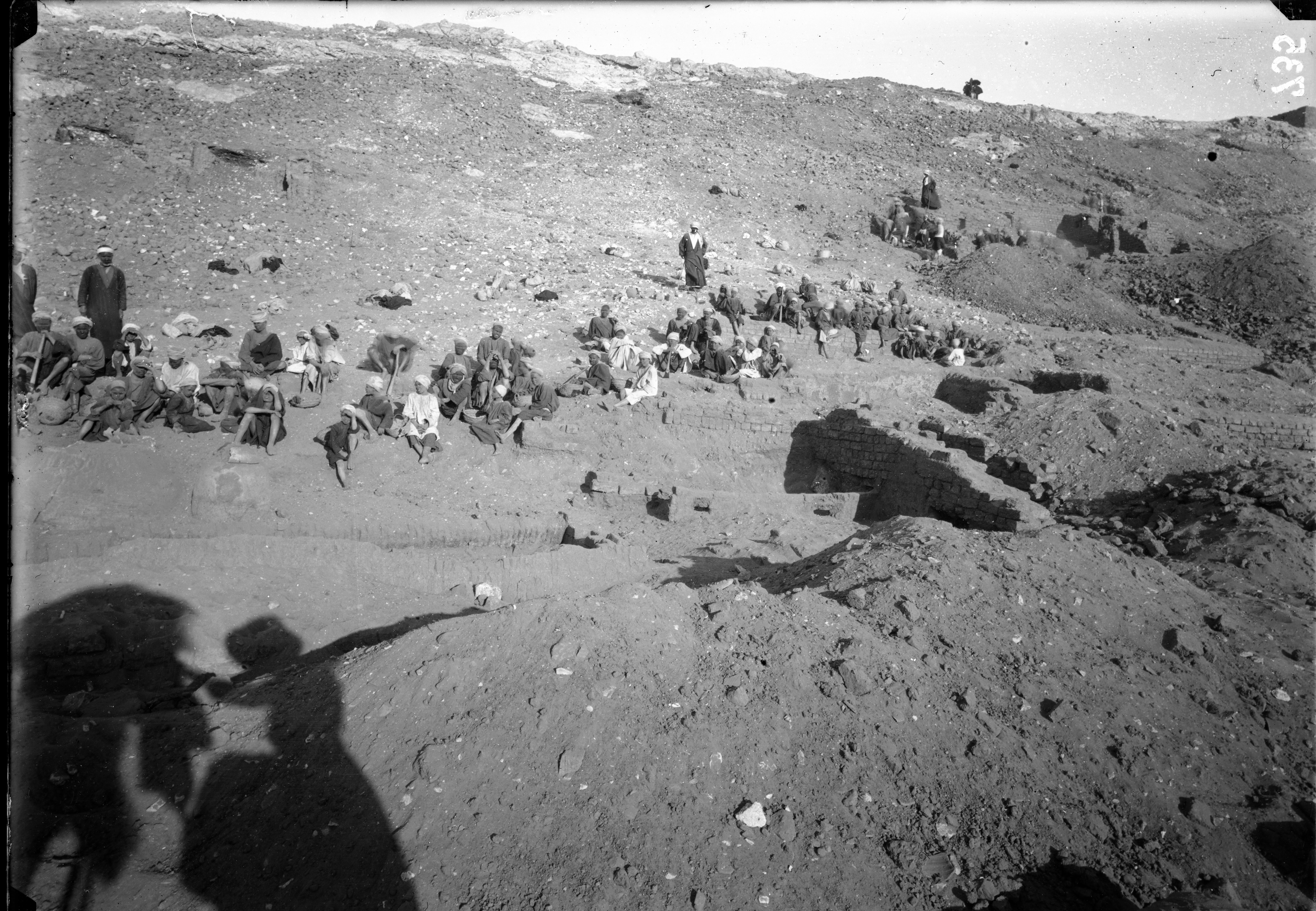 Excavations at the foot of the southern hill, western side. The workers (many of them very young) are on a break in order to photograph the site without their presence, and to avoid the inconvenience caused by dust clouds when excavating. Whilst taking the photo, the sun has projected the shadows of the people close to the camera onto the ground, including the figure of Ernesto Schiaparelli who is under a parasol. Schiaparelli excavations.
