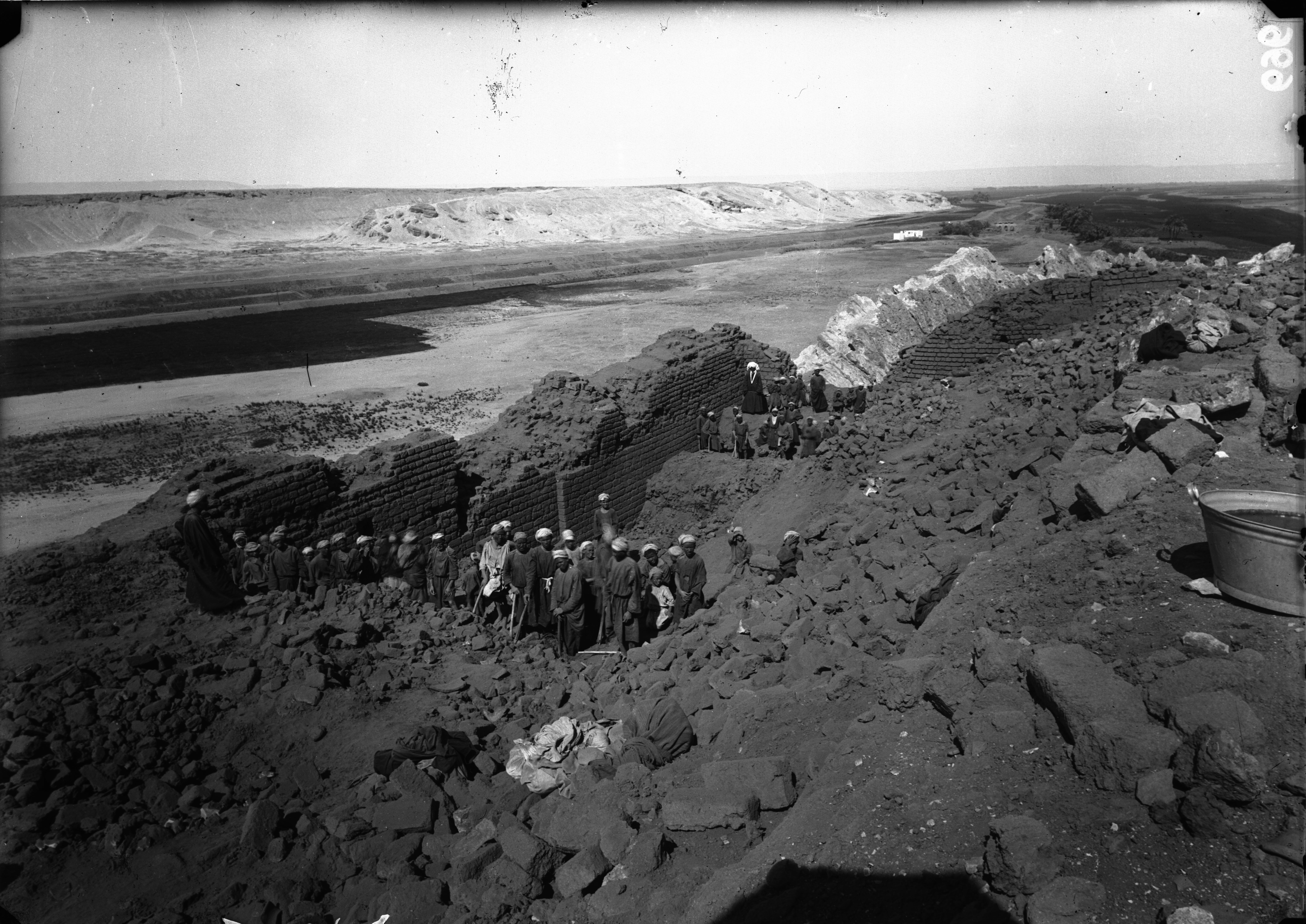 General view of the western side of the southern hill. The workers engaged in the excavation at the bottom of the valley are visible. In the background, are the impressive mud-brick retaining structures. Schiaparelli excavations.