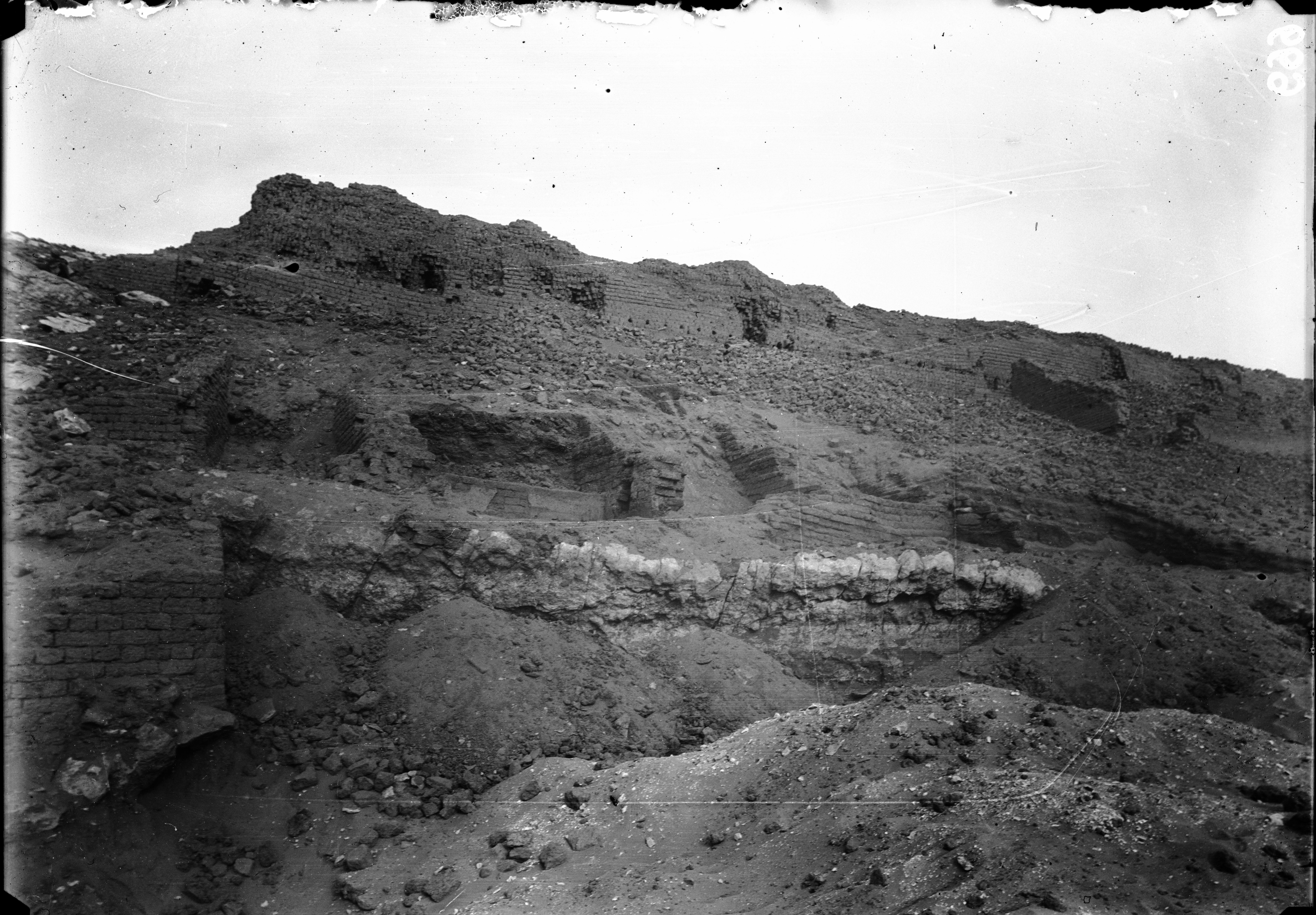 Southern hill, western side. Excavations among the impressive mud-brick structures at the foot of the fortress. The image is affected by a second photographic impression that can be traced back to image C00725. Schiaparelli excavations.