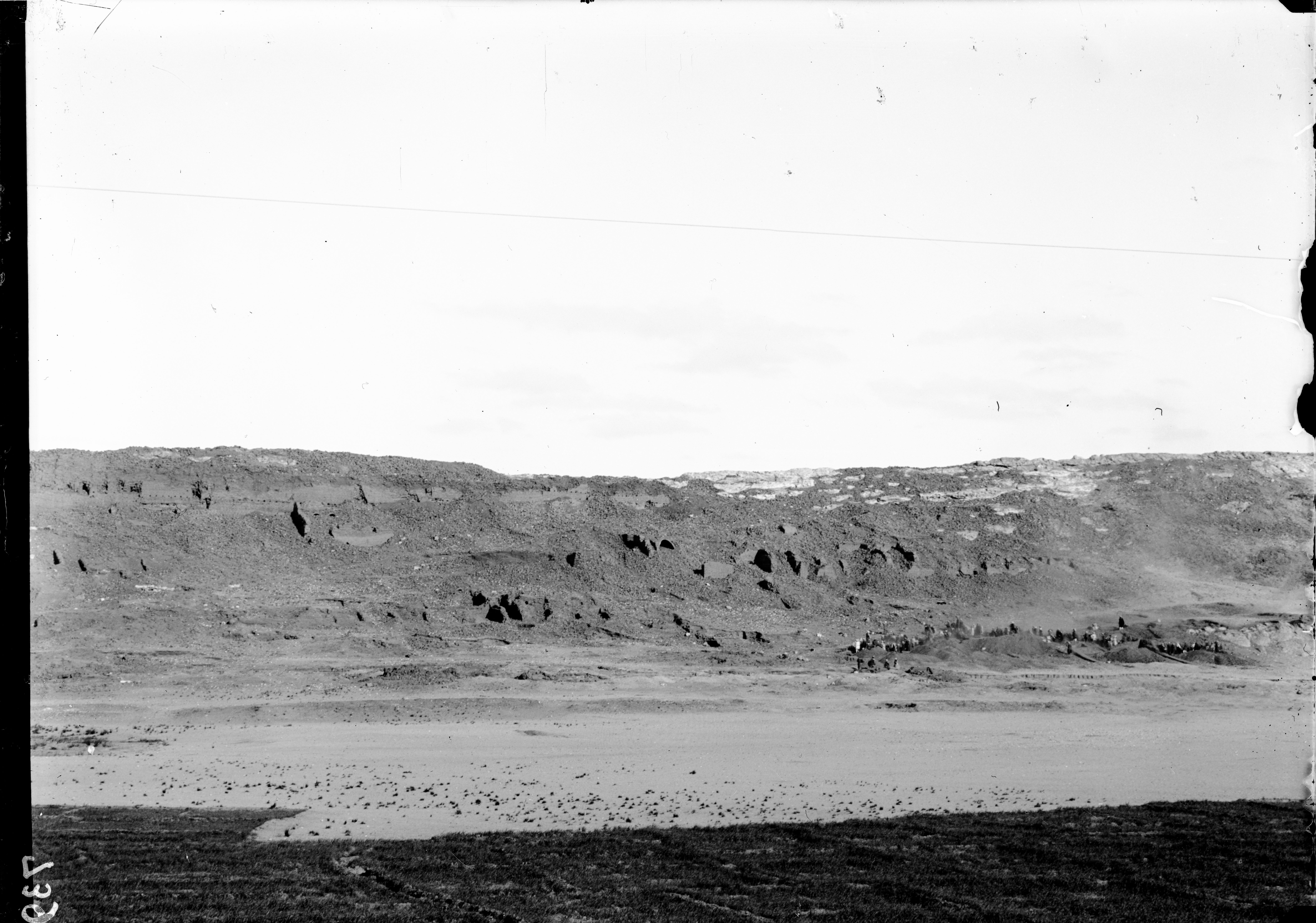Southern hill, western side, plain from the area below the hill. Remains of significant mud-brick structures, prior to the start of excavations. Visible in the background, beyond the telegraph line is the northern hill. Schiaparelli excavations.
