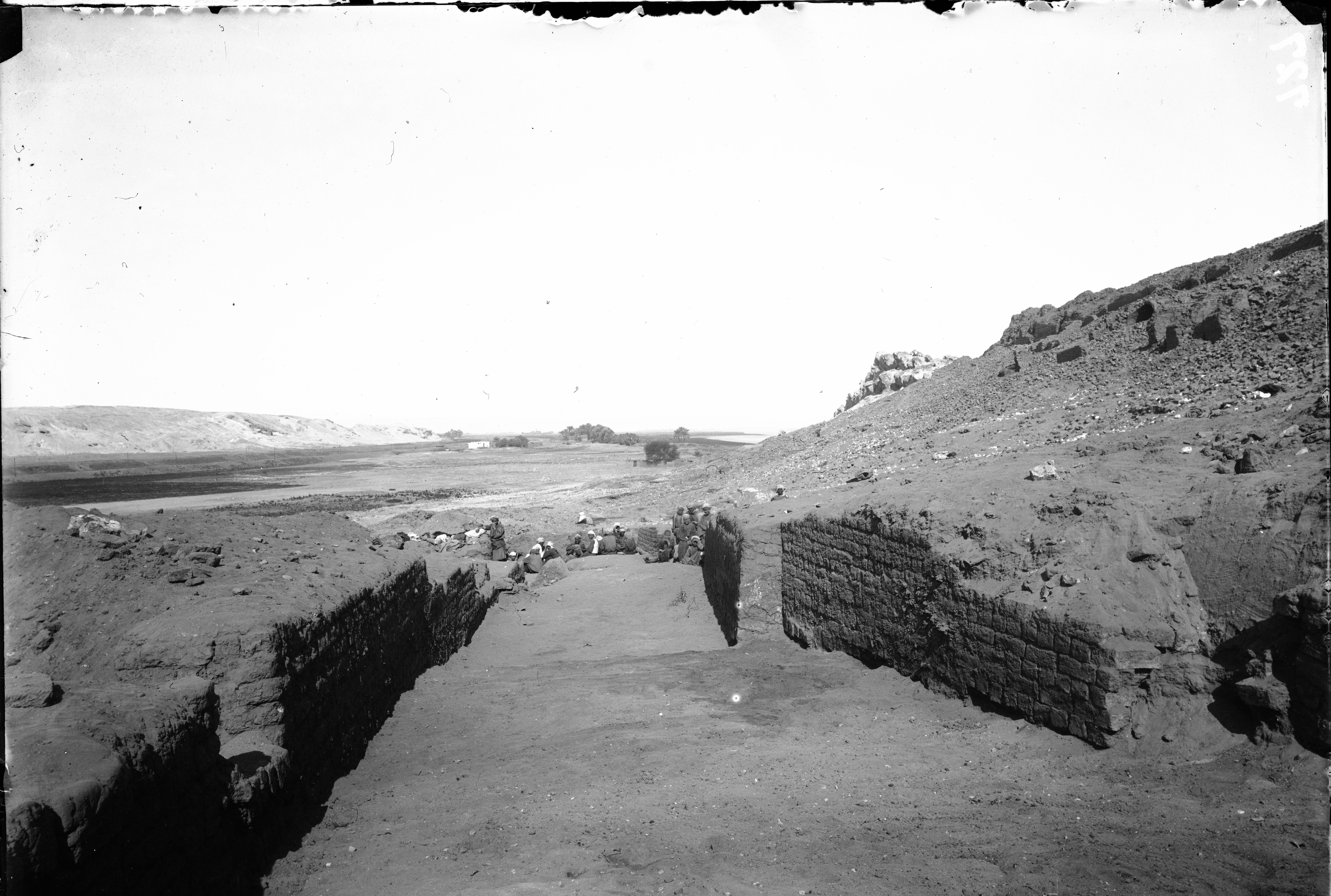 Excavations along the slopes on the western side of the southern hill. Three figures who are guests of Ernesto Schiaparelli, are visible on the top of the hill, allowing the photograph to be dated to 1910. Schiaparelli excavations.