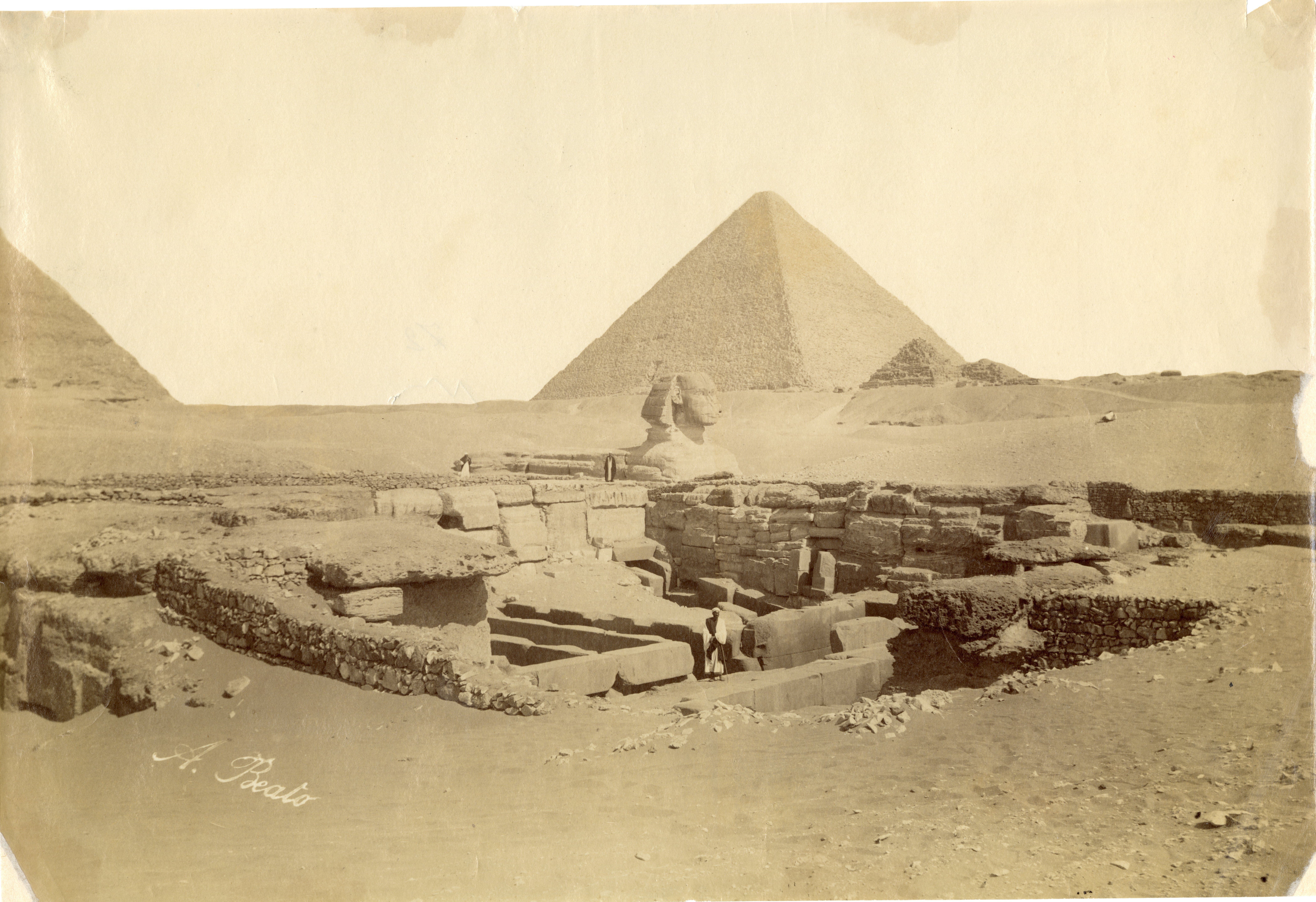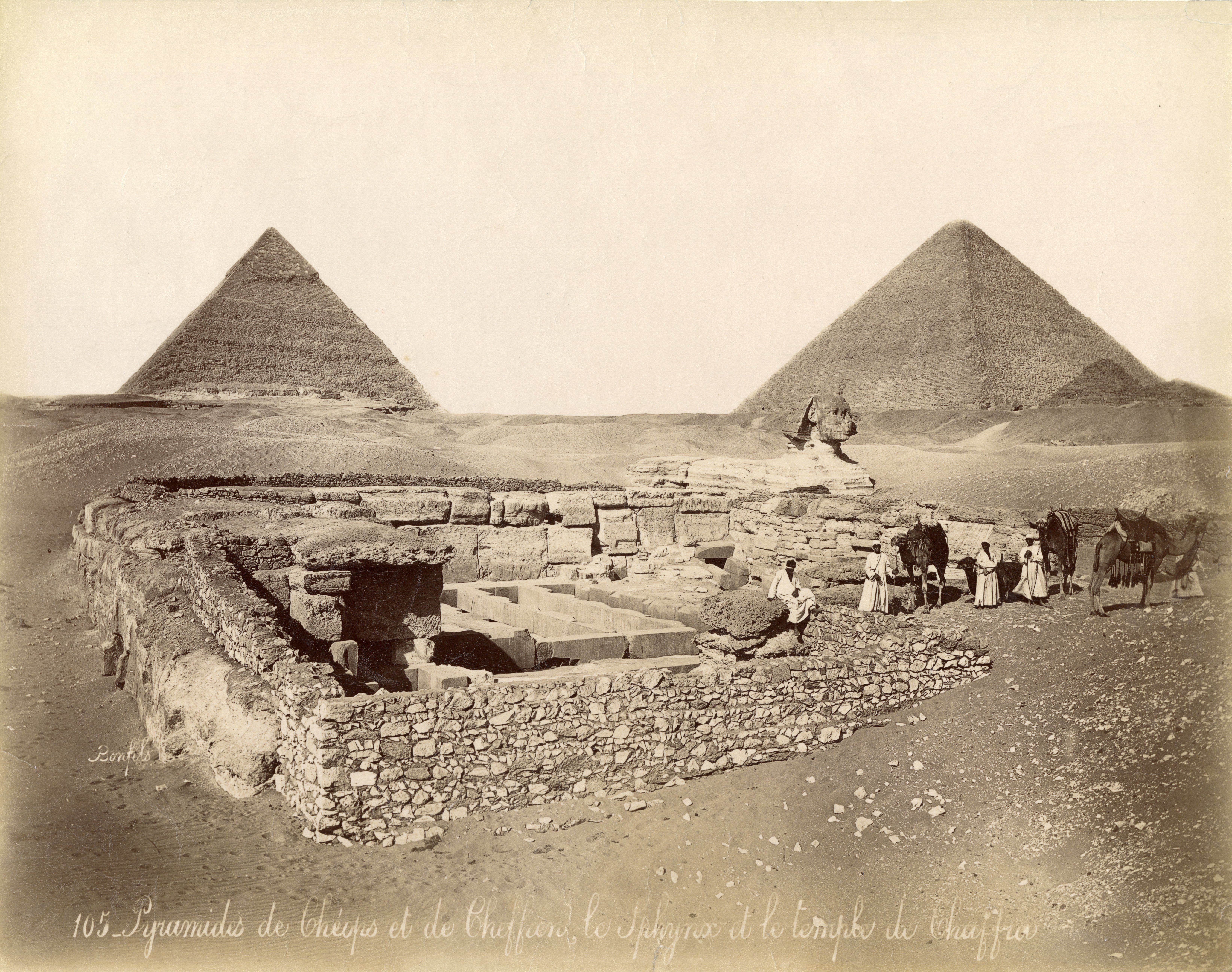The photograph shows, in the foreground, some Egyptians resting with four camels at the Valley Temple of the pyramid complex of Khafre. In the background the sphinx is visible and already partially cleared of sand, it is thought to be commissioned by Pharaoh Khafre. In the background are the pyramids of Khafre (left) and Khufu (right), pharaohs of the 4th dynasty. The author's signature can be found at the bottom left.