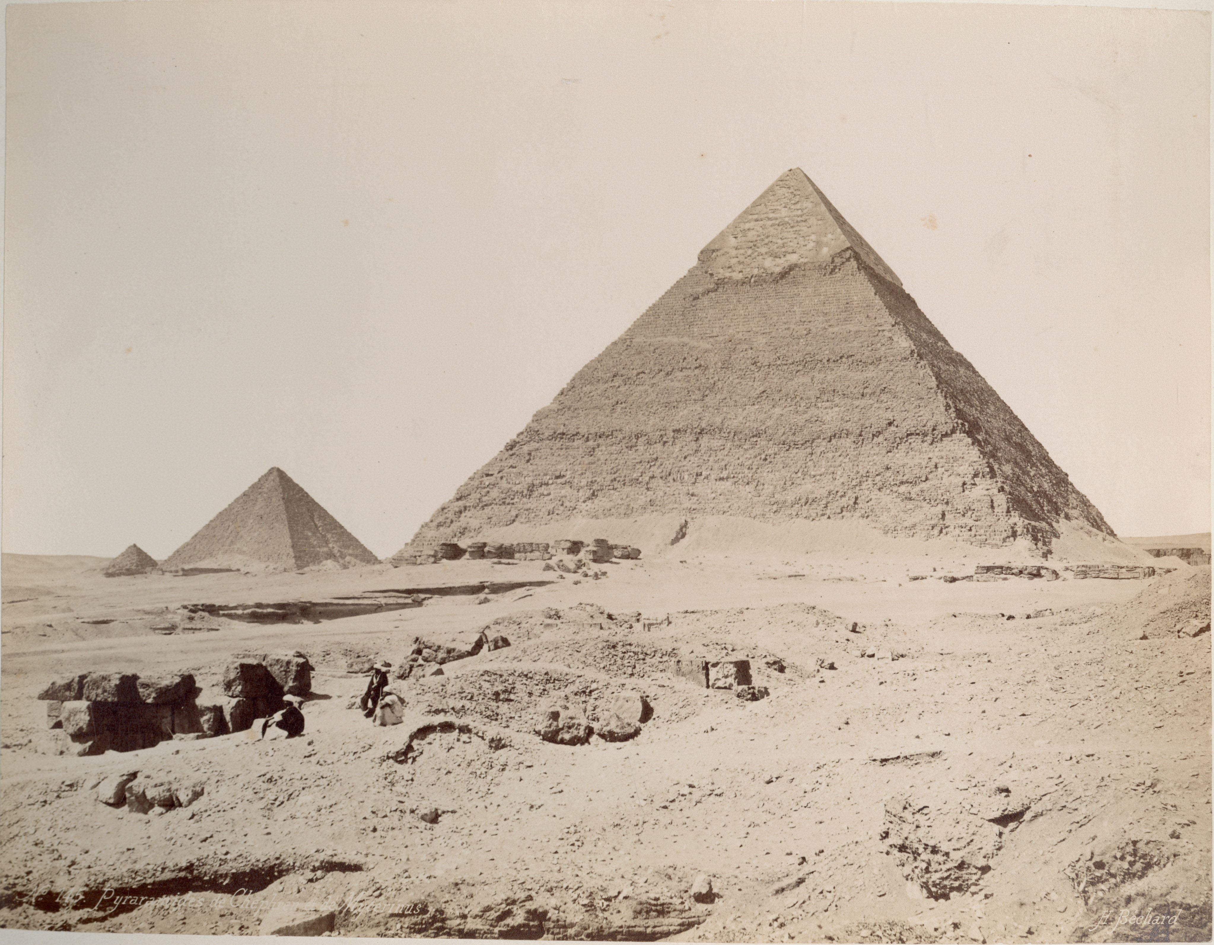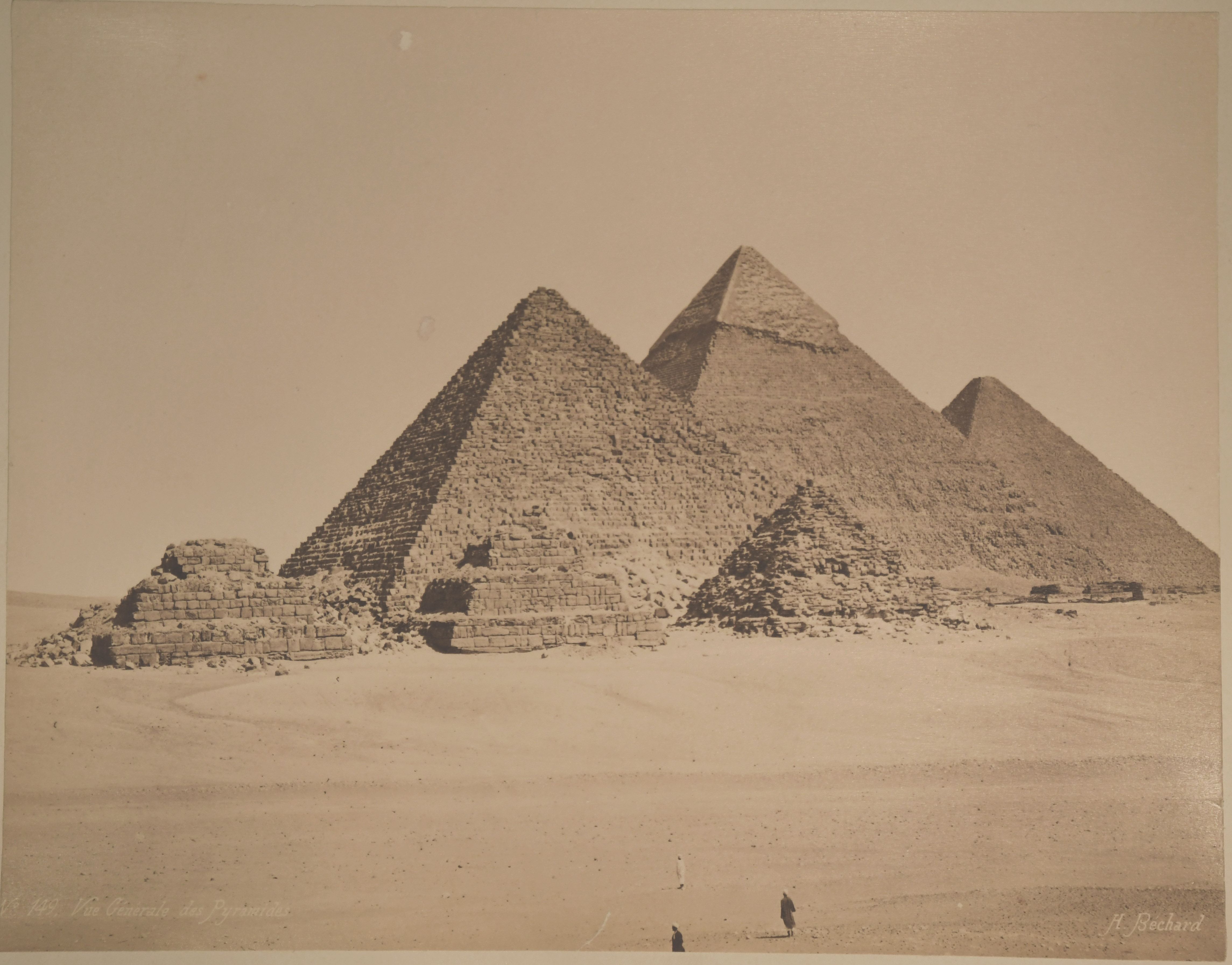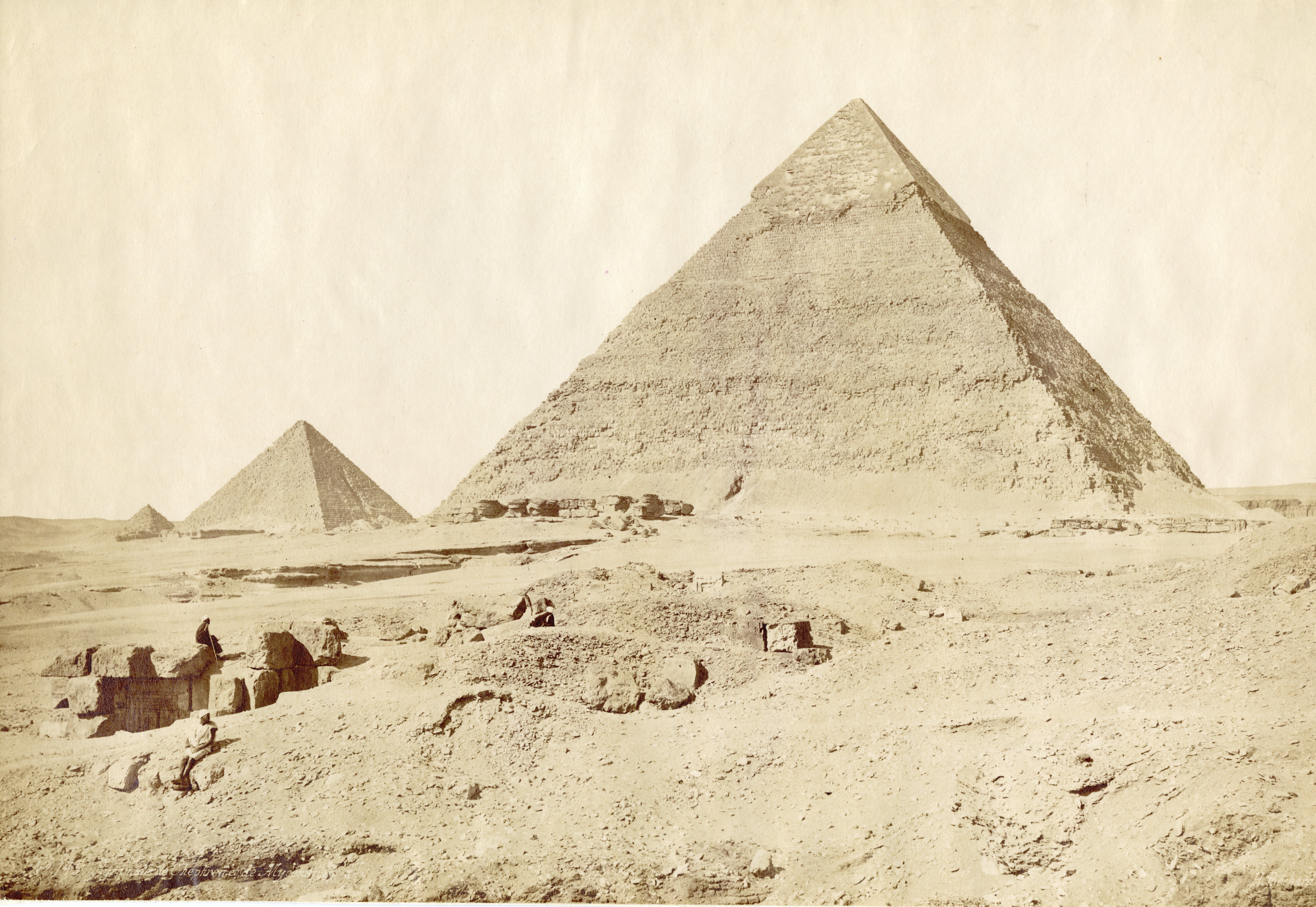 Photograph of the pyramid of Khufu, Pharaoh of the 4th dynasty, at Giza. At the foot of the pyramid are eight local inhabitants, some seated and others on camels. The author's signature can be seen at the bottom left.