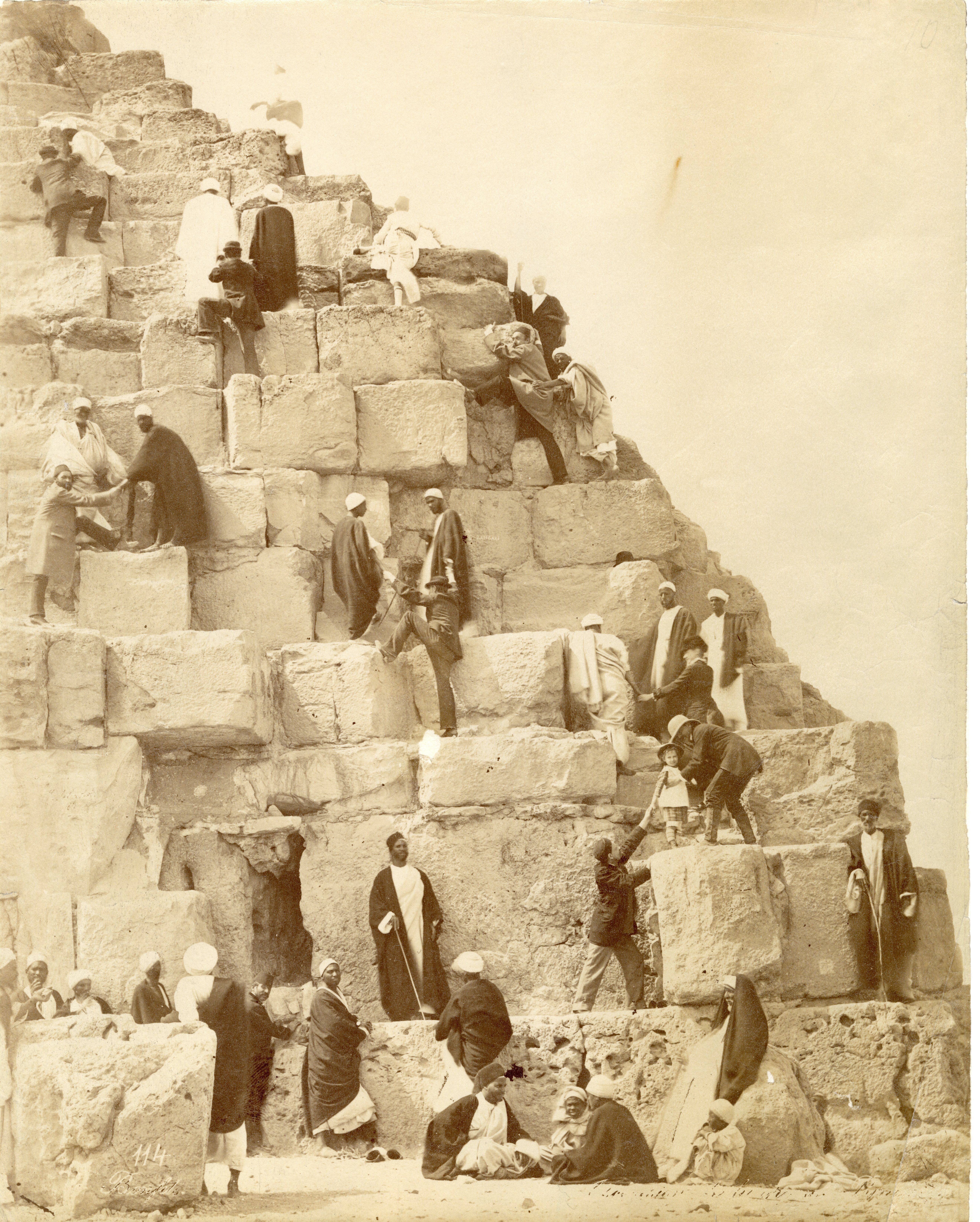 Three egyptian guides help a tourist climb the pyramid of Pharaoh Khufu, while a fourth egyptian is seated on the blocks higher up. There is no signature of the author, although the work could be attributed to F. Bonfils.