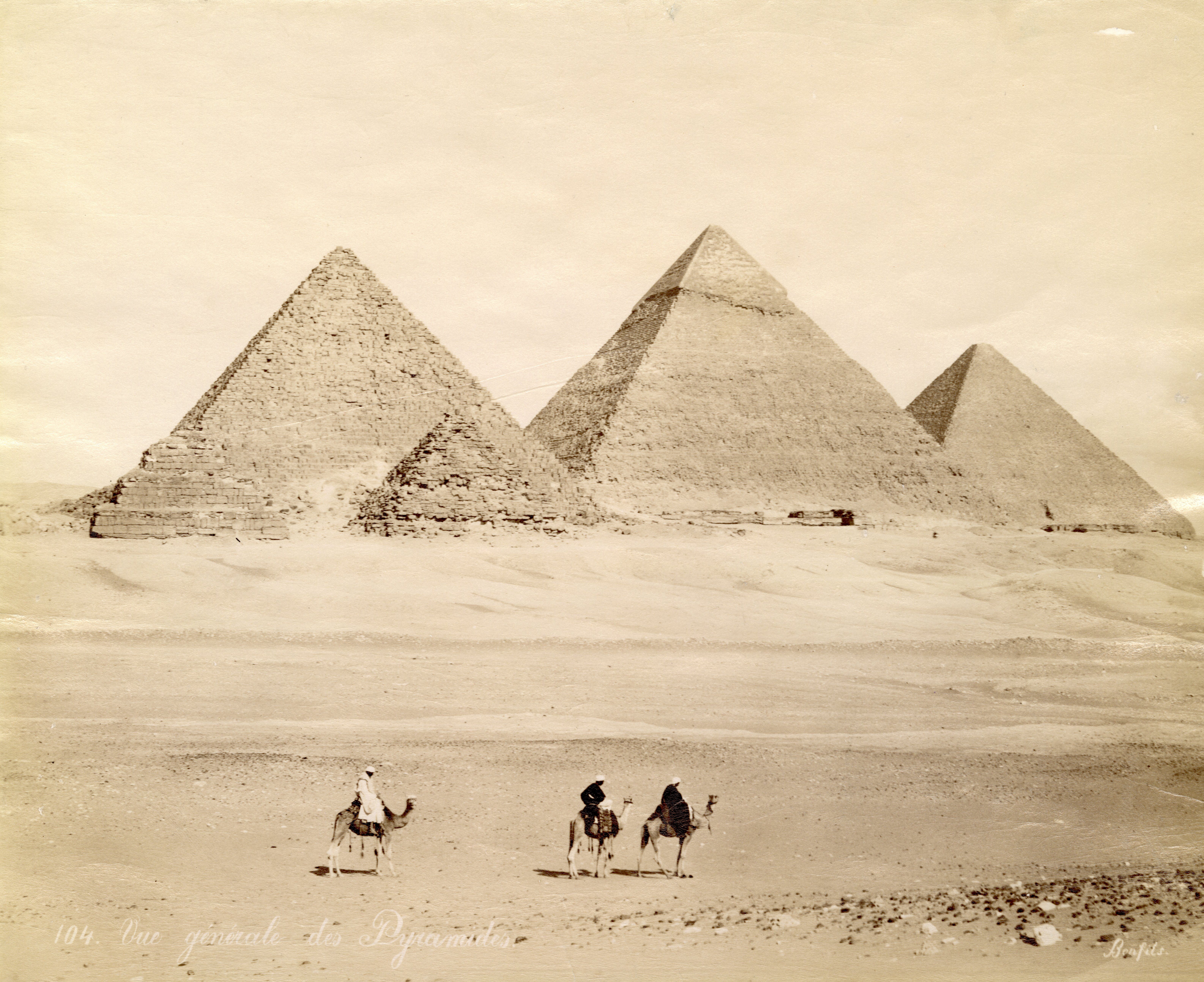 View of the pyramids of Giza with three Bedouins riding camels posing for the picture. On the left, the pyramid of Menkaure (the smallest of the three) with two satellite pyramids. In the centre, the pyramid of Khafre and on the right, the pyramid of Khufu. The photographer's signature is visible at the bottom right.