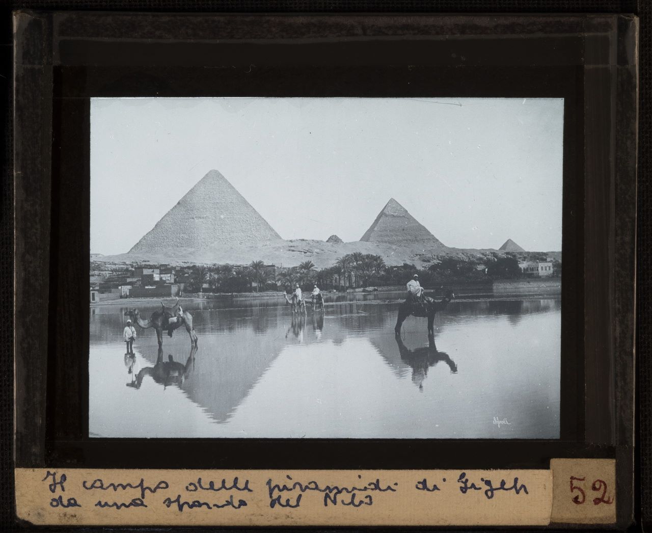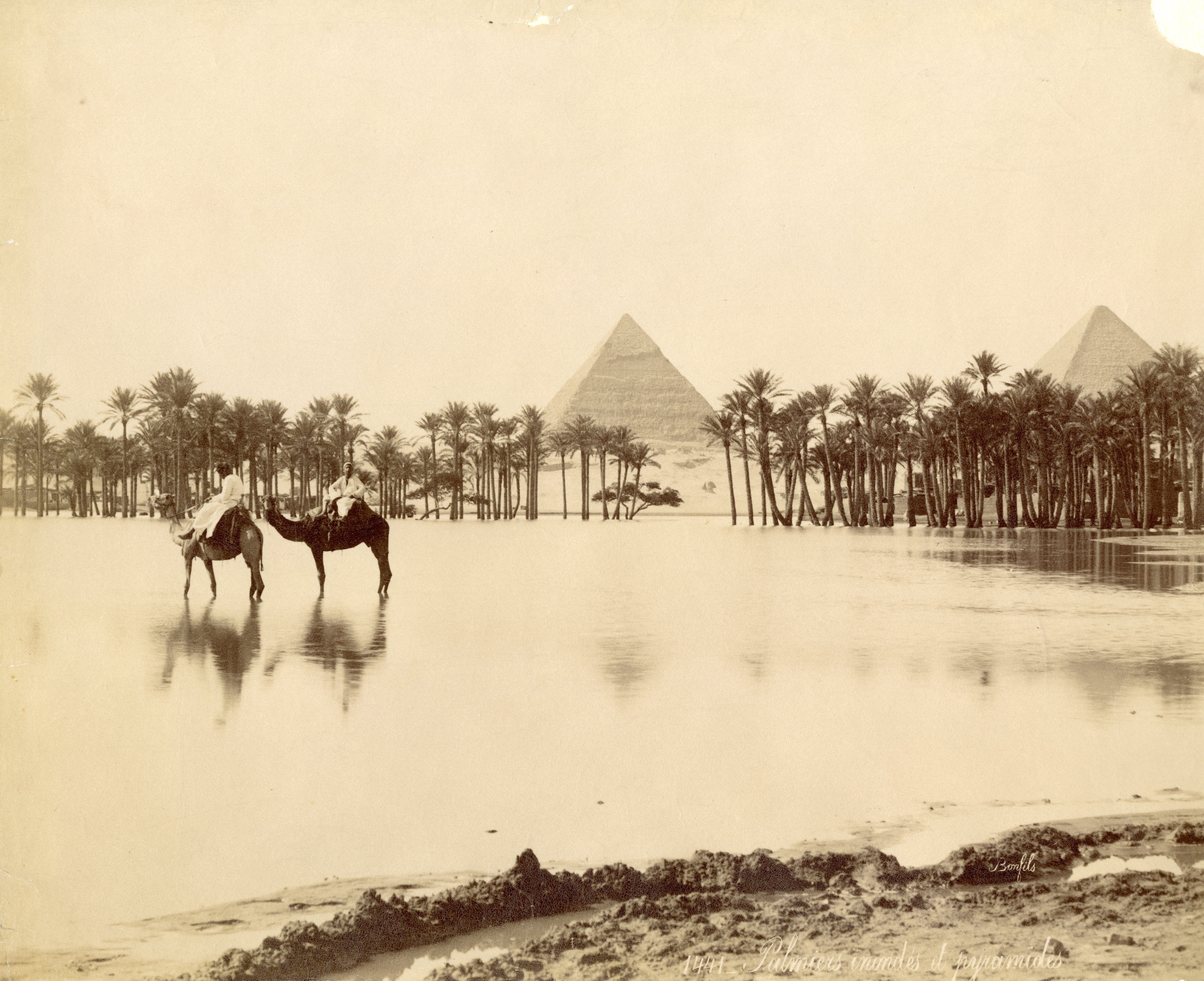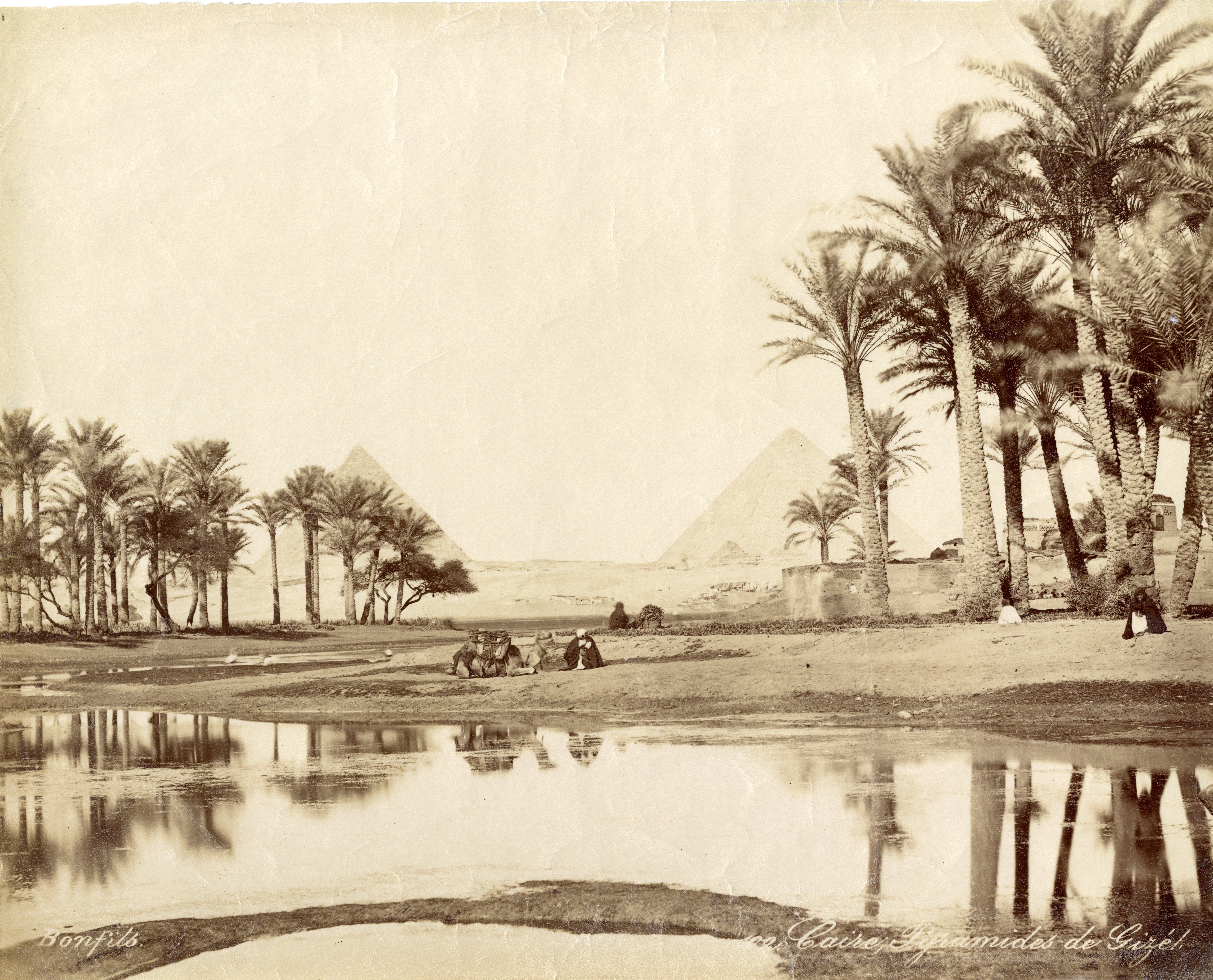 The photograph depicts two palm groves in the Giza Plateau with some Egyptians and two camels, near a body of water, possibly during a flood. In the foreground there are some residential structures behind the palm grove (right) and in the background, the pyramid of Pharaoh Khafre (left) and that of Pharaoh Khufu (right) with two smaller pyramids in front dominate the plain. The author's signature is visible at the bottom left.