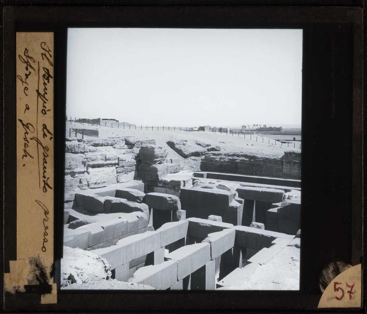 Remains of the Temple of Khafre, photographed with its back to the Sphinx (not in the shot) and facing towards the Nile River. Probably Schiaparelli excavations