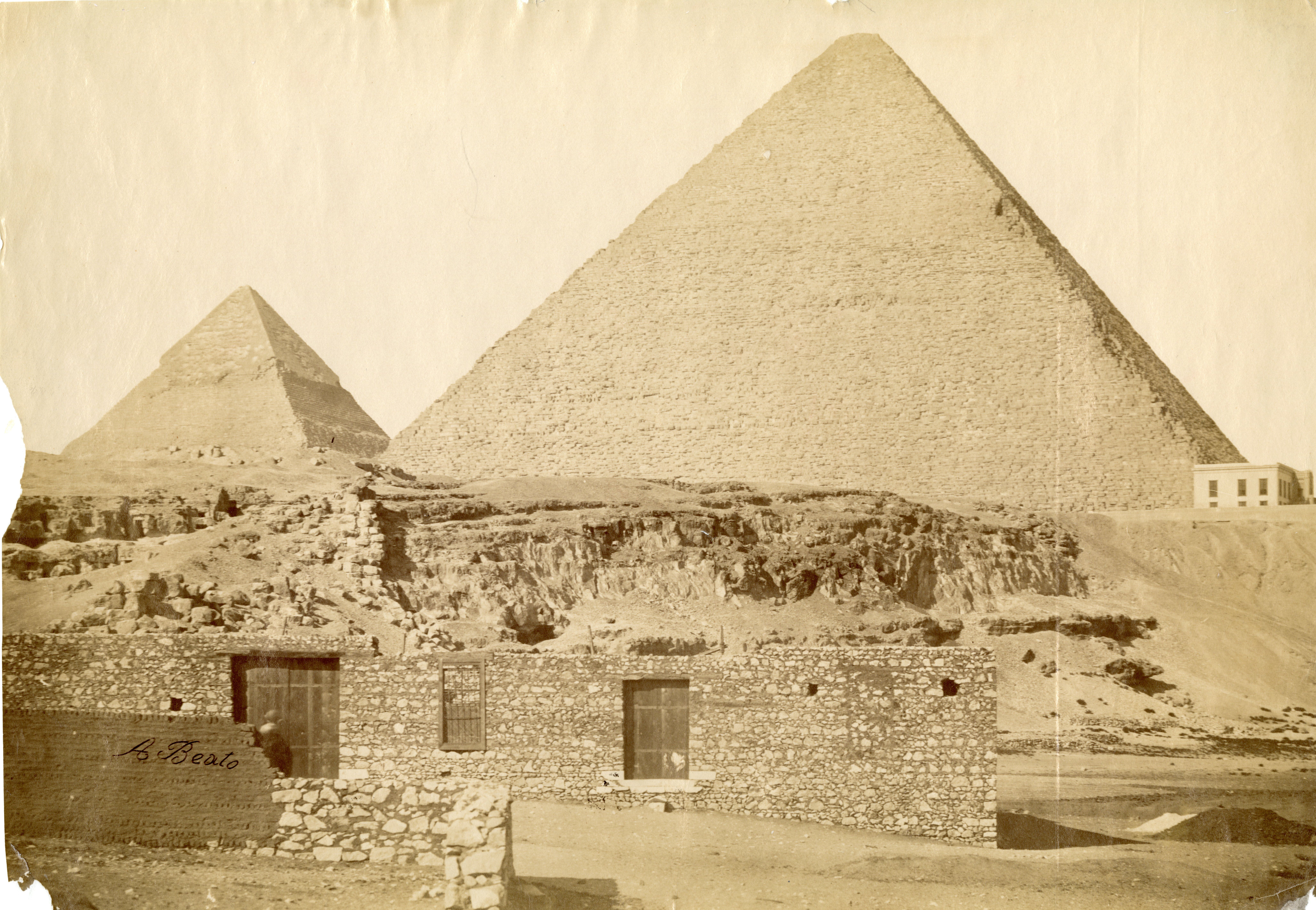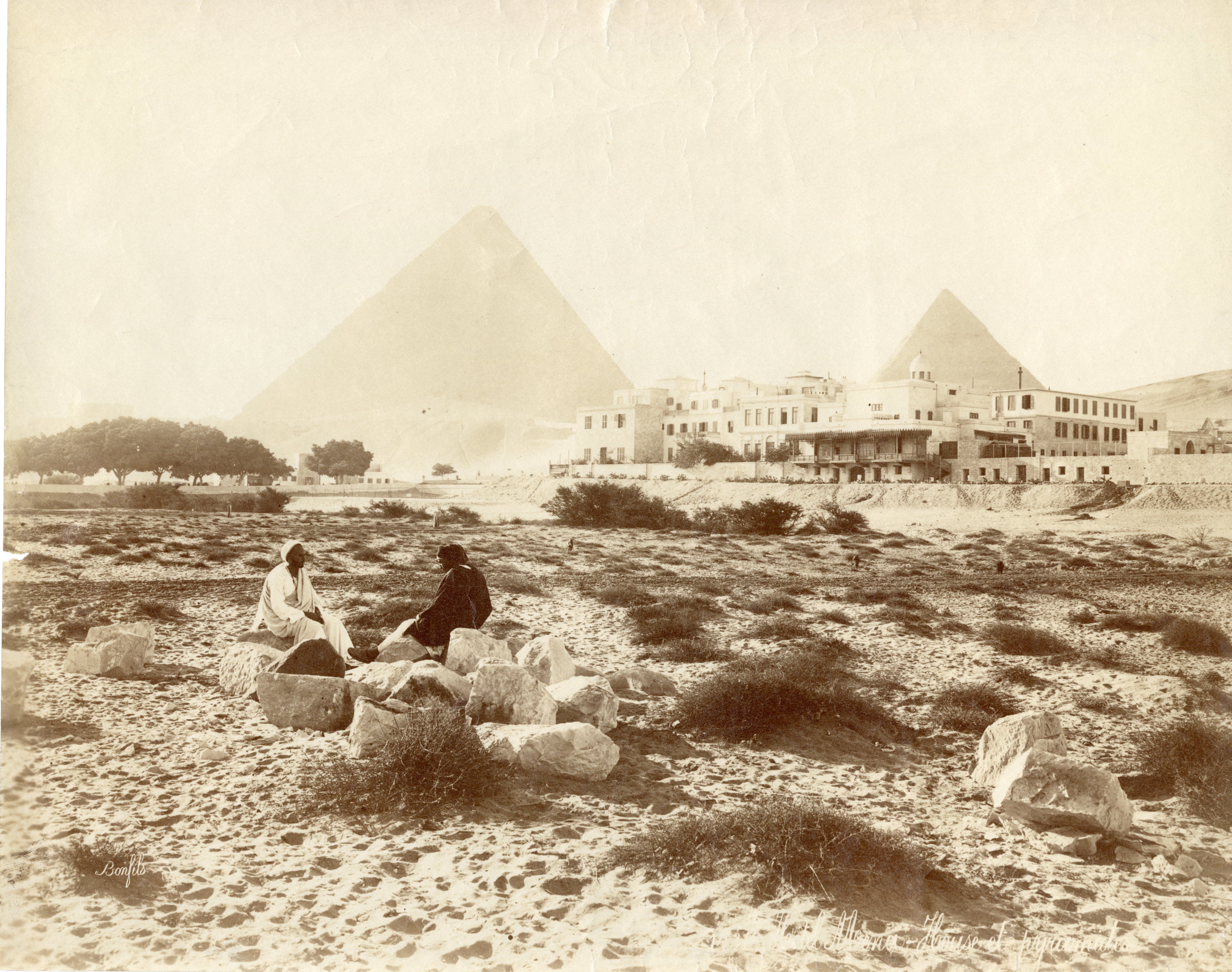The photograph depicts two Egyptians in the foreground sitting on some large boulders, possibly fragments from antiquity, in front of the Mena House Hotel, which had already been extended with its upper floors and dates the photograph to after 1883. In the background the pyramids of Khufu (centre) and Khafre (right) are visible. The author's signature can be seen at the bottom left.