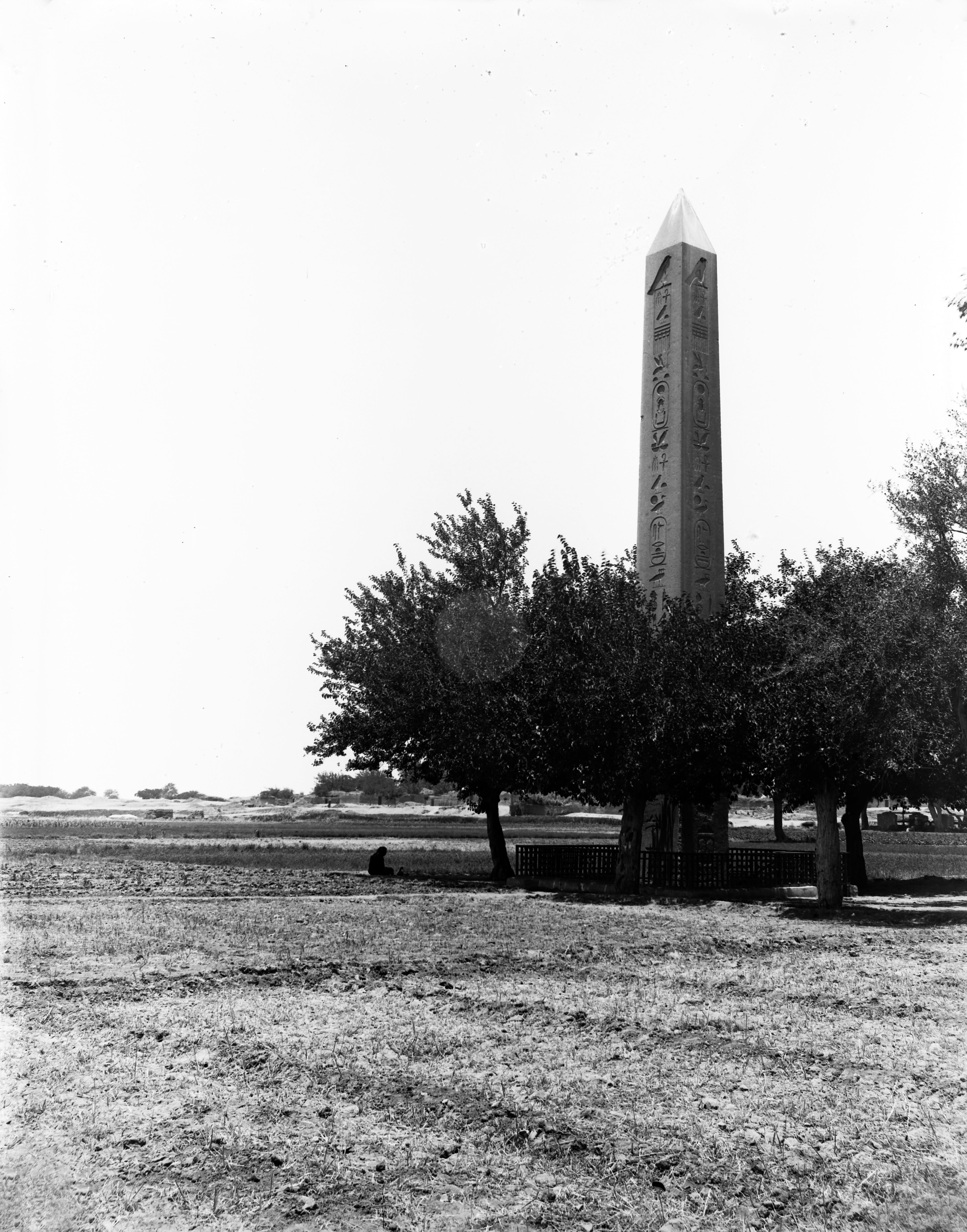 Central-eastern area of the sacred enclosure, the south side of the obelisk of Sesostris I can be seen from a distance. A saqiyah is visible, from the south-east. In the back, the houses of the Kom, also visible. Schiaparelli excavations.