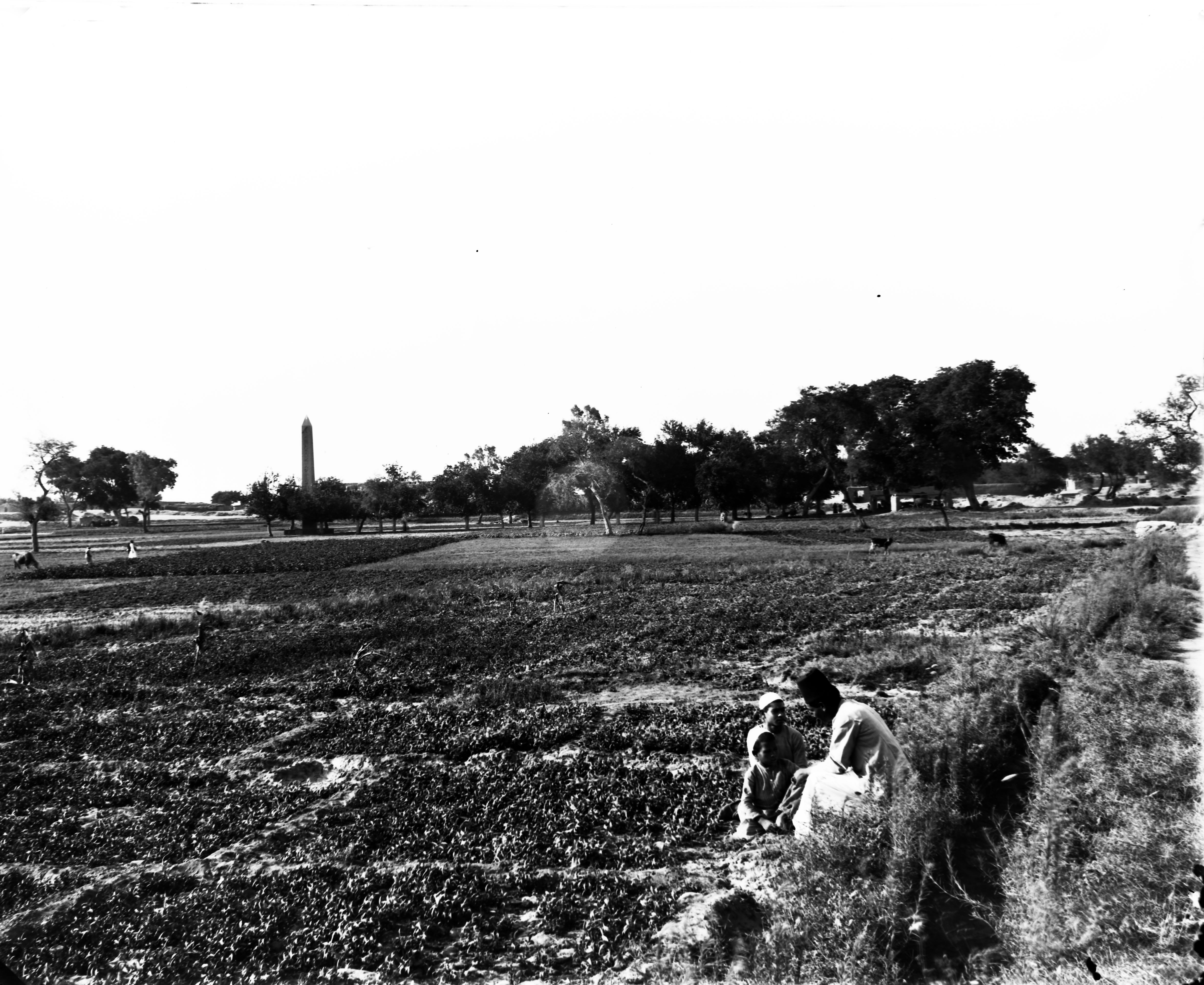 Area of the sacred enclosure, north and west sides of the obelisk of Sesostris I; a saqiyah is visible, from the north-east. In the foreground, we see cultivated fields. Schiaparelli excavations.