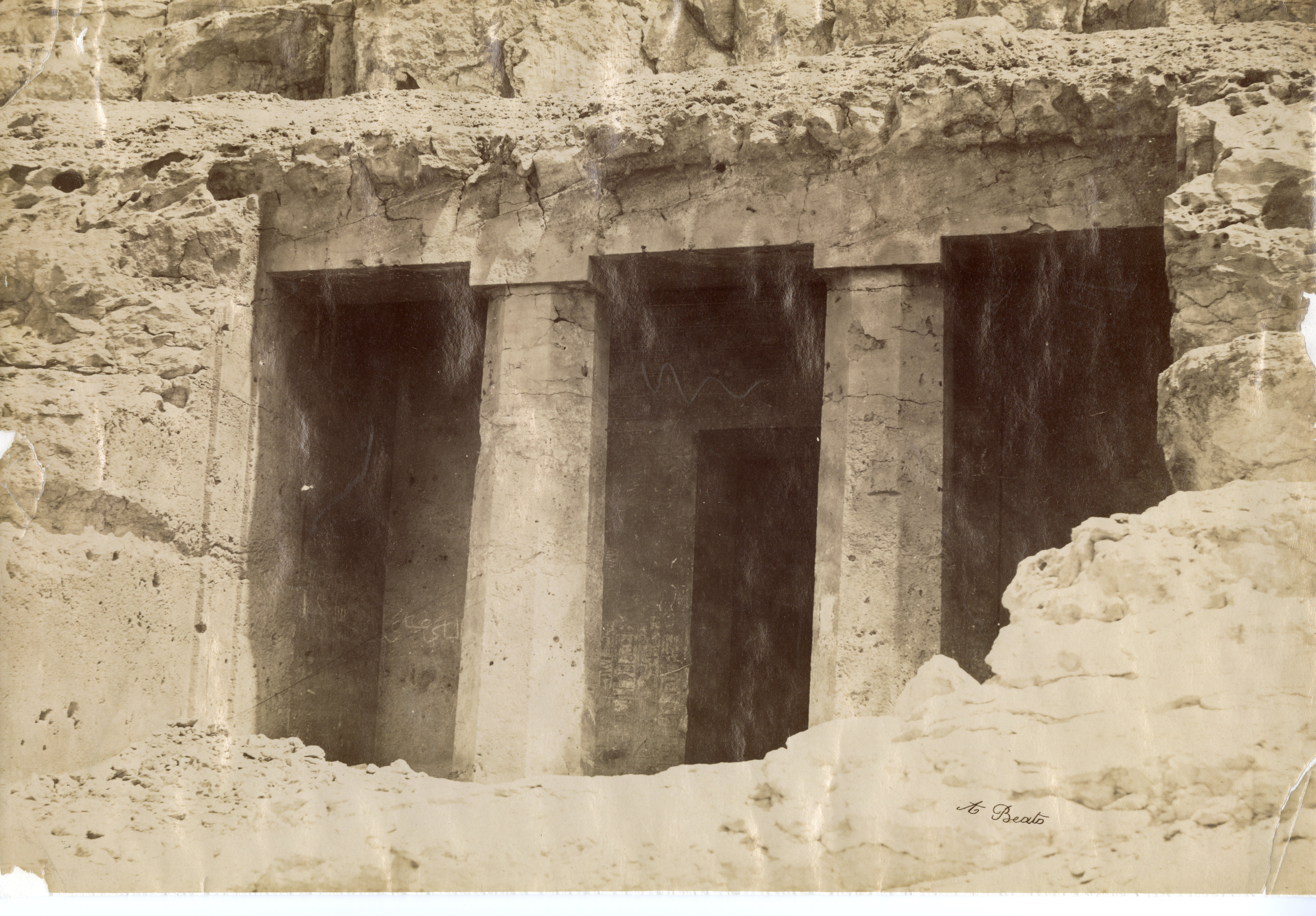The photograph shows a series of tombs excavated in the mountain near Beni Hassan, a location in the 16th nome of Upper Egypt. In the foreground, with modern graffiti is tomb No. 3 of Governor Khnumhotep II, and on the right, tomb No. 4 of Governor Khnumhotep IV. In the background, tomb No. 5. The author's signature is at the bottom right.