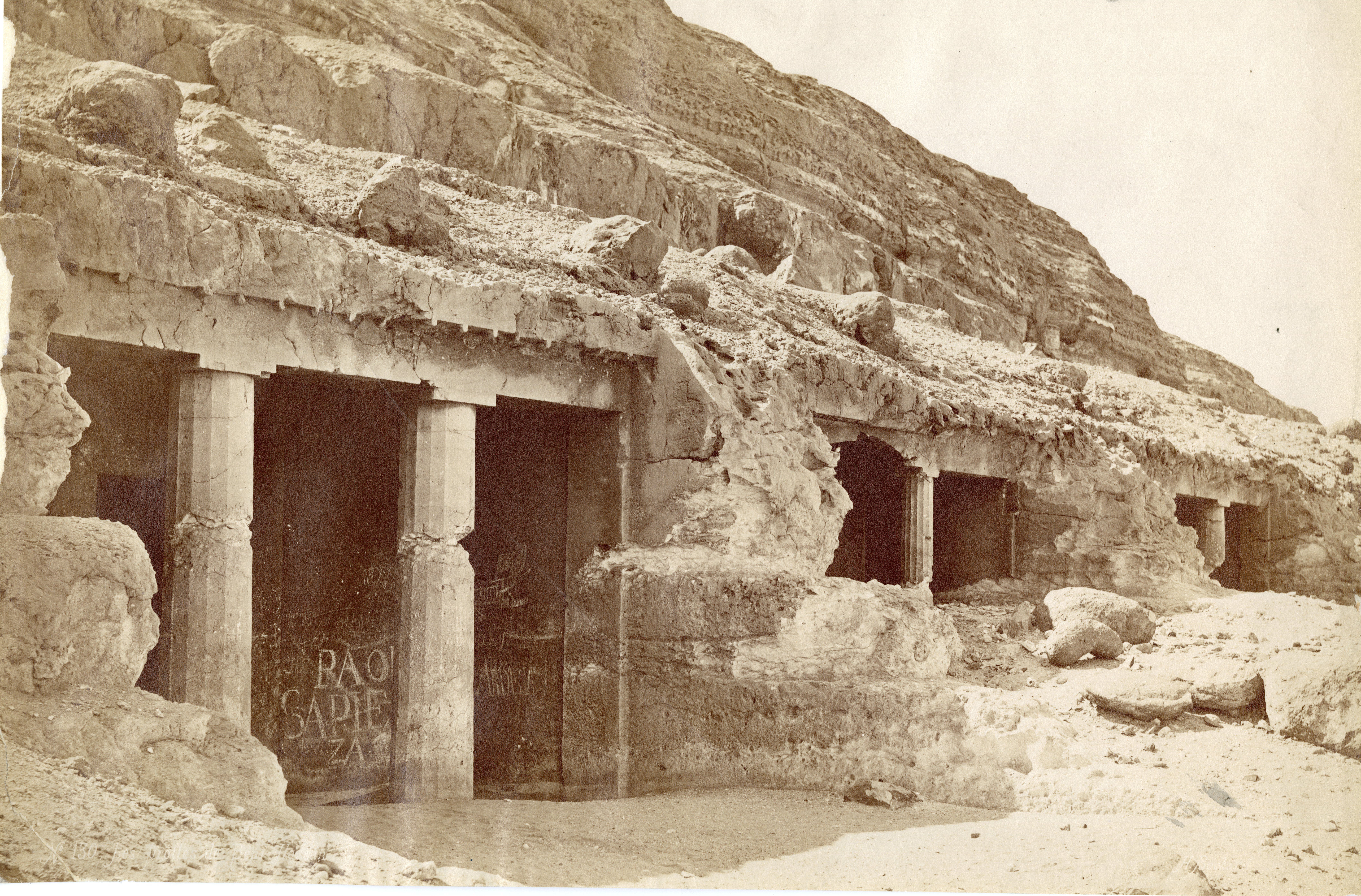 The photograph (like the previous one) shows a series of tombs excavated in the mountain near Beni Hassan, a location in the 16th nome of Upper Egypt. In the foreground, with modern graffiti is tomb No. 3 of Khnumhotep II, and to the right, tomb No. 4 of Khnumhotep IV. In the background, Tomb No. 5. Photograph taken a few metres away from the point of the previous photograph. The author's signature is at the bottom right.