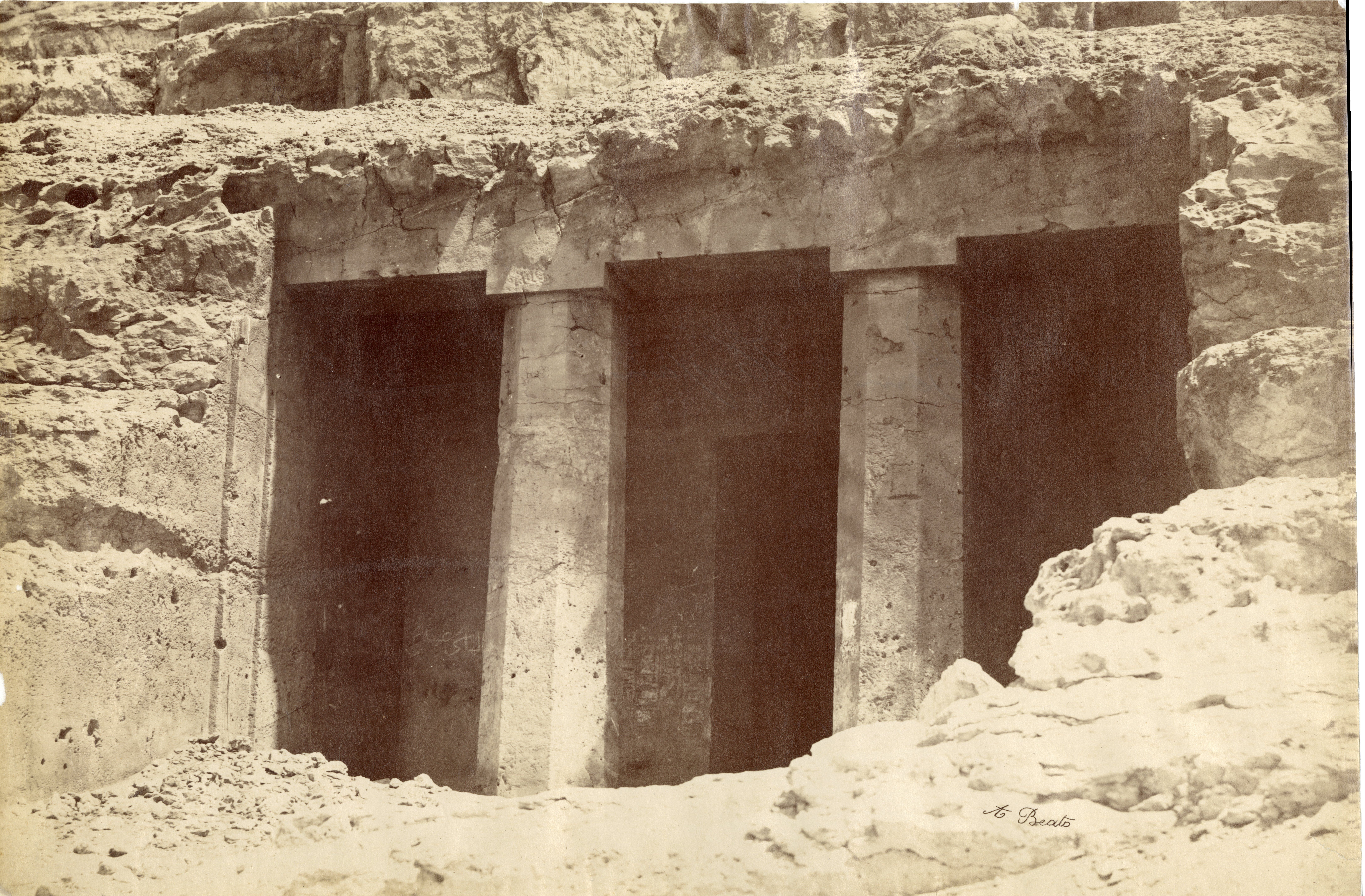 The photograph shows the access to the rock-cut tomb (no. 2) of the governor Amenemhat known as Ameny, in the necropolis of Ben Hassan. The author's signature is at the bottom right.