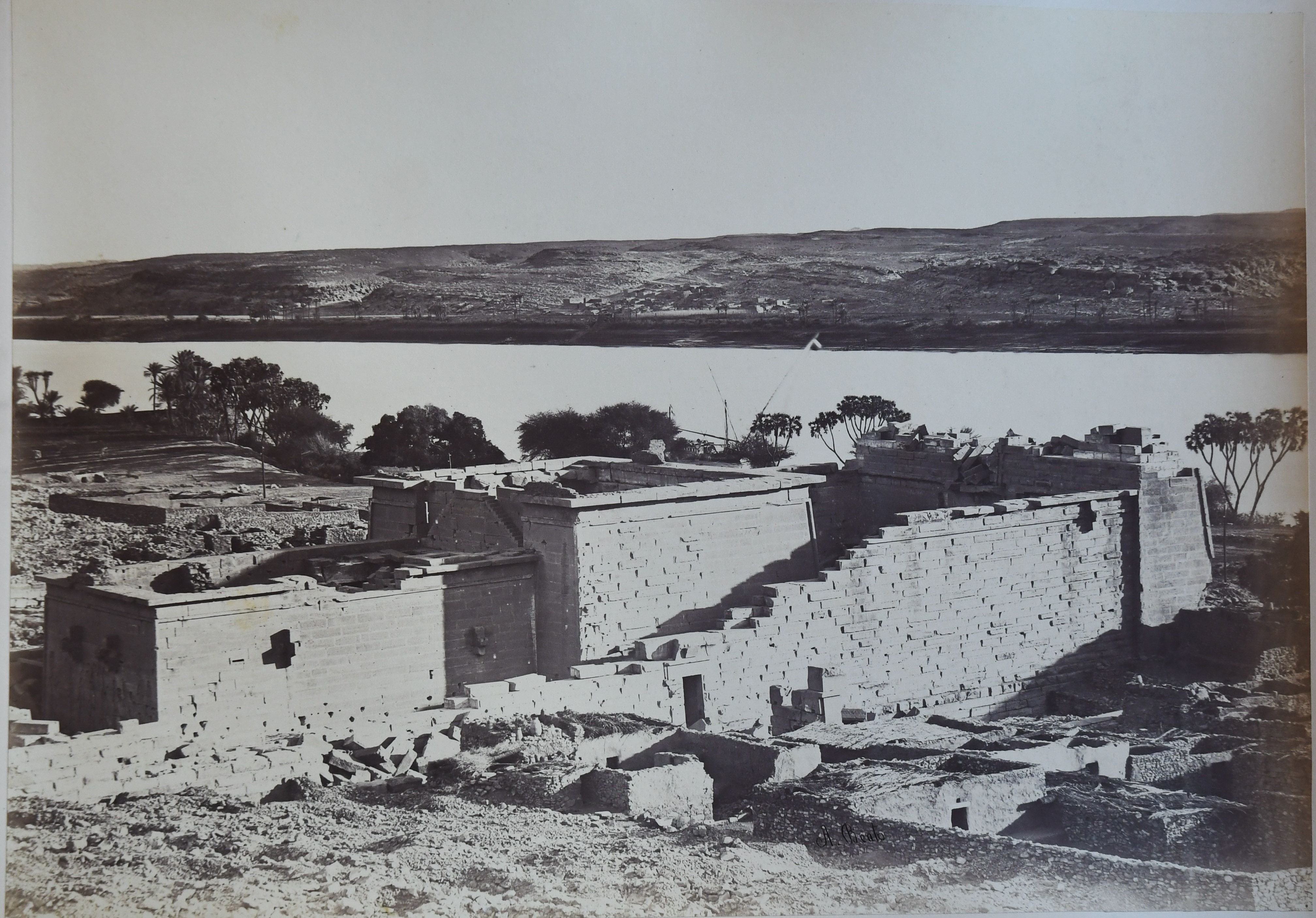 Photograph of the Temple of Kalabsha in its original location in Nubia. Behind the temple stretches the Nile. The author's signature is at the bottom right of the image. The temple was moved following the construction of the Aswan Dam and the resulting formation of Lake Nasser, which would have submerged it. The temple was then re-erected in the late 1960s at New Kalabsha, a location on higher ground not far from Aswan. The author's signature is visible at the bottom right.