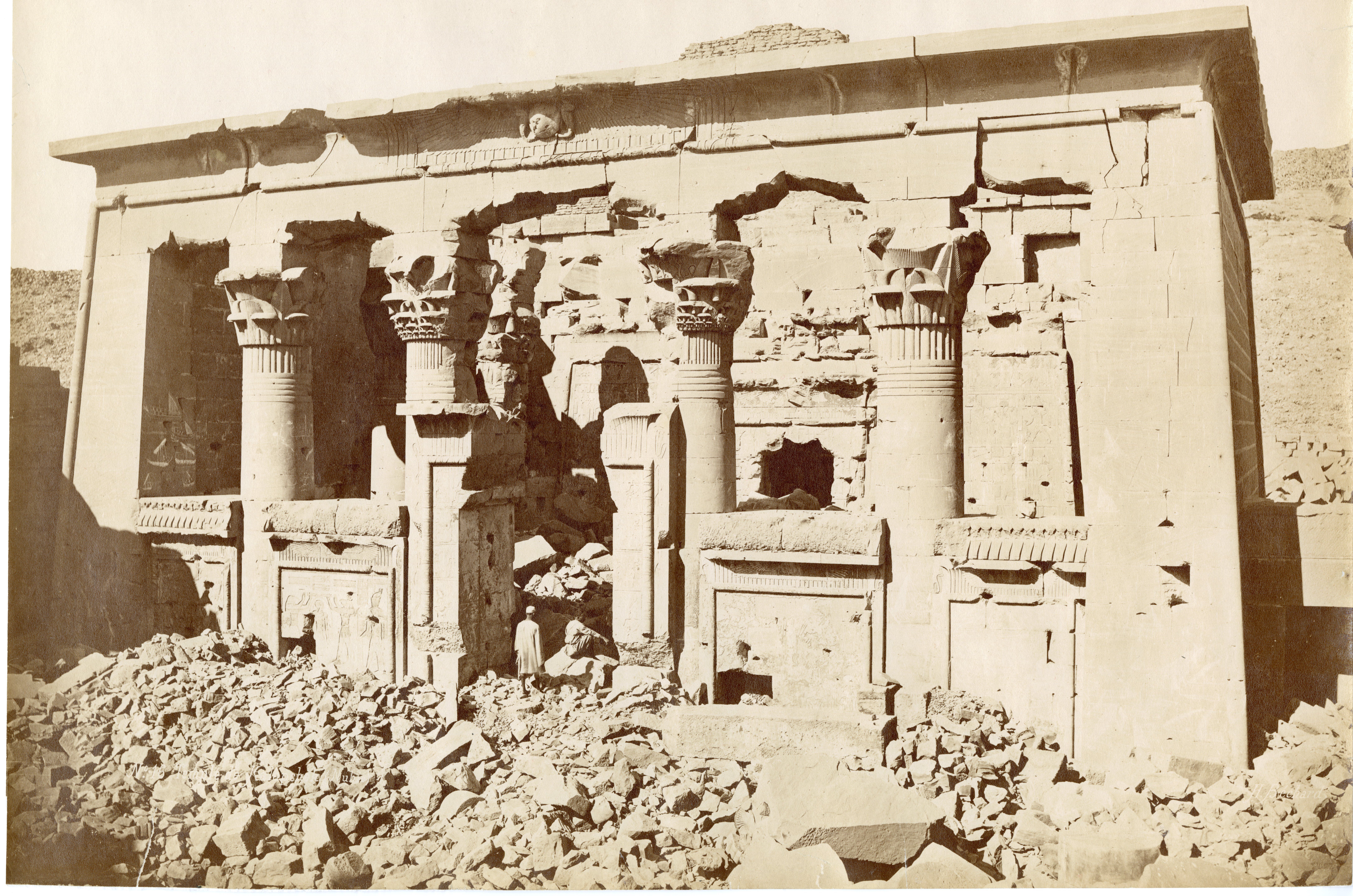 View of the Temple of Kalabsha built in honour of the god Mandulis, in its original position, and not yet restored. The top of the entrance pylon is in fact not fully stabilised. The temple was moved following the construction of the Aswan Dam and the resulting formation of Lake Nasser, which would have submerged it. The temple was then re-erected in the late 1960s at New Kalabsha, a location on higher ground not far from Aswan. The author's signature is visible at the bottom right.