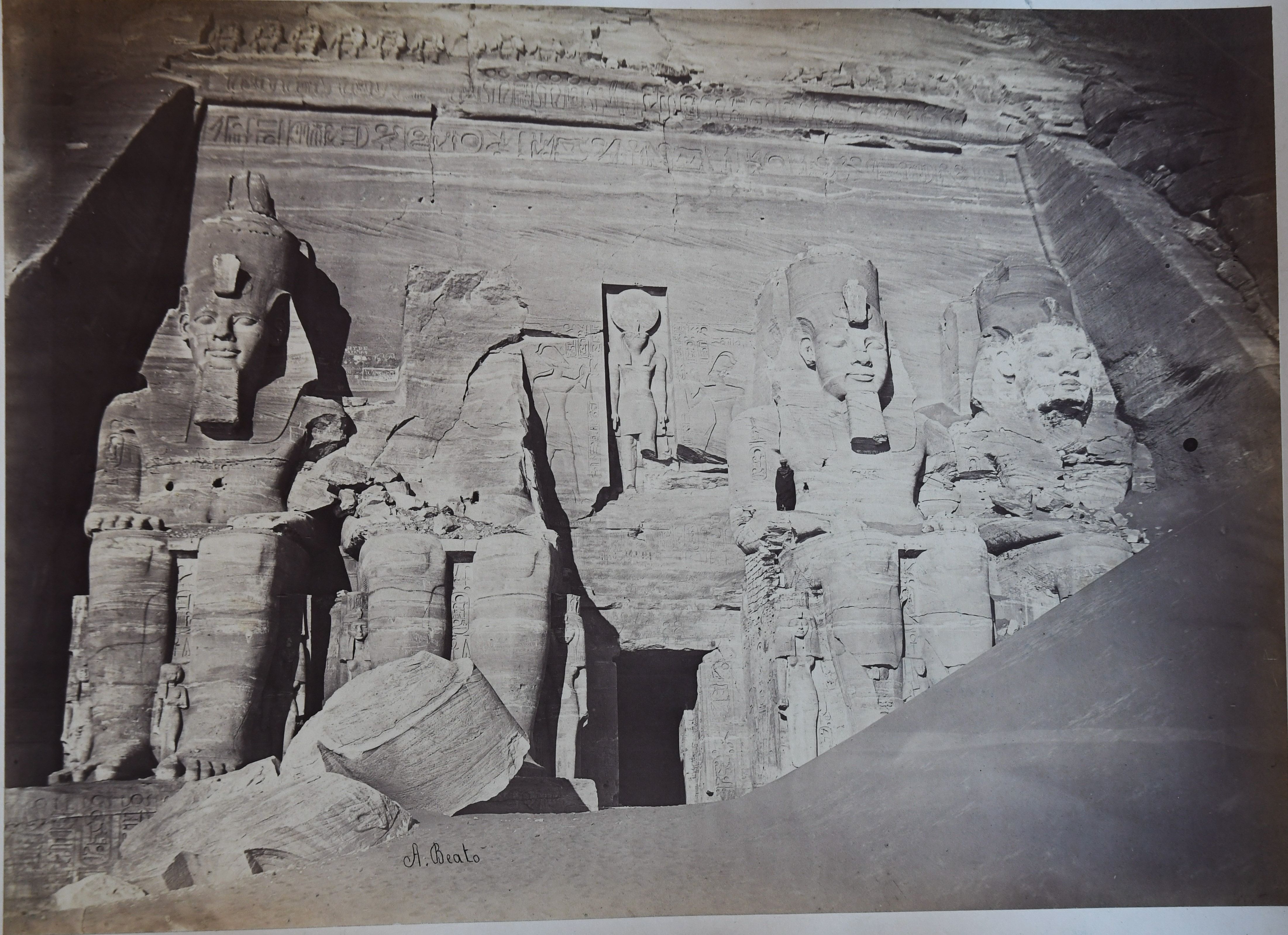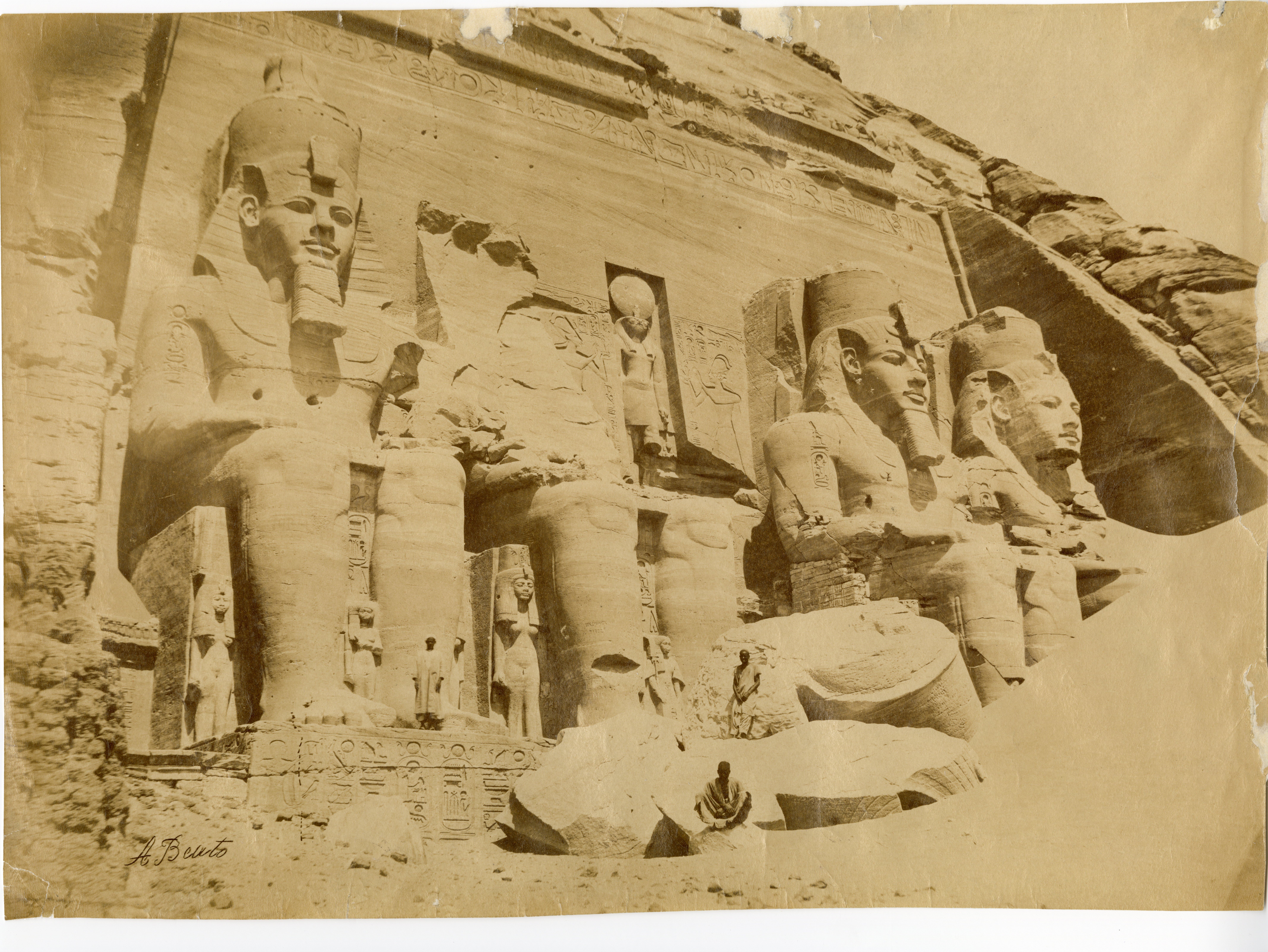 View of the monumental entrance to the Great Temple of Abu Simbel, built by Pharaoh Ramesses II. On the right is a mound of sand, partially covering the fourth colossal statue carved into the rock. Some inhabitants of the area are posing for the picture. In the 1960s, the temple became the symbol of the rescue campaign of the Nubian temples, threatened by the rising waters of Lake Nasser following the construction of the Aswan Dam. The two temples of Abu Simbel were in fact cut in to blocks and reassembled on a nearby hill. The author's signature is at the bottom left.