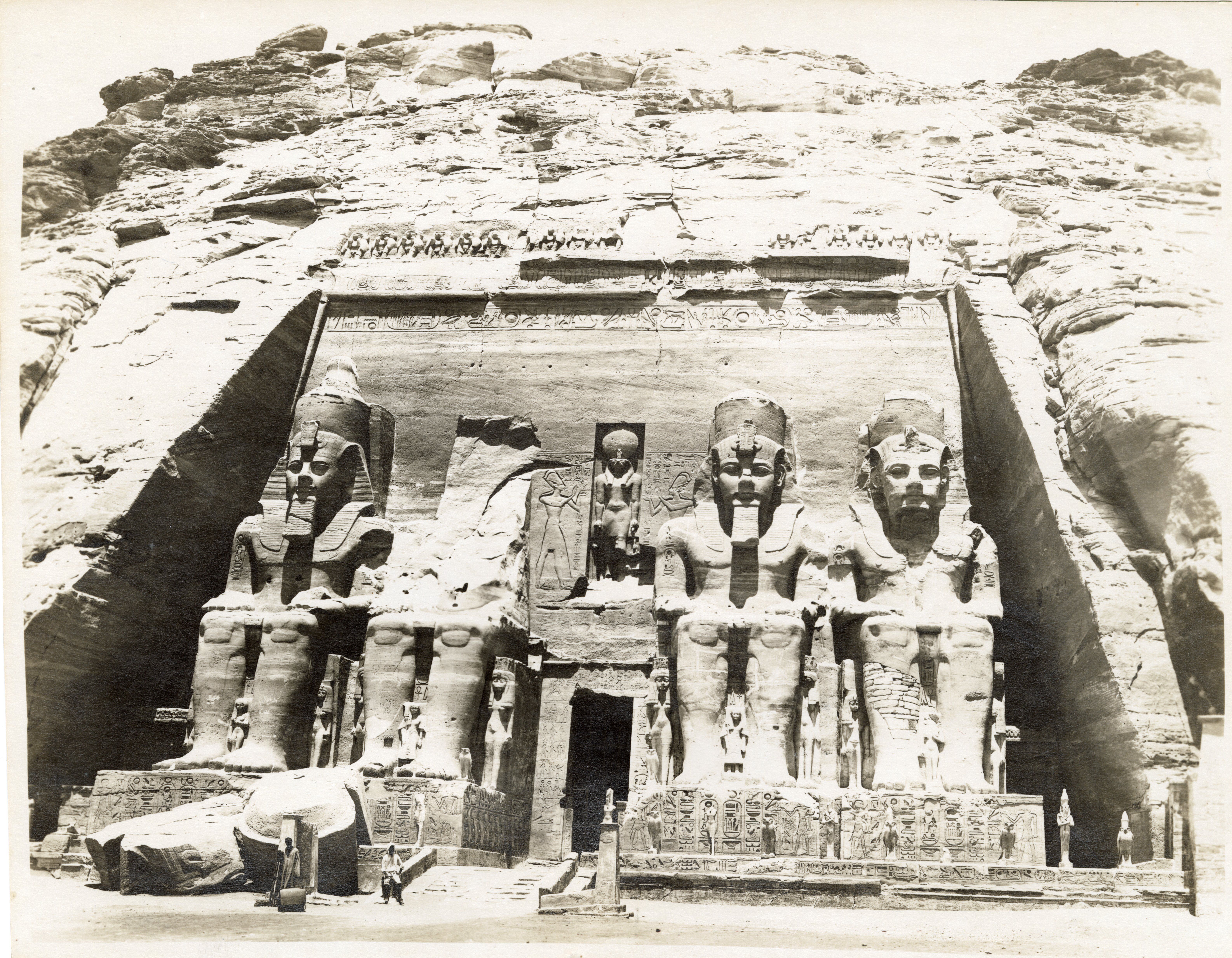 19th century colour photograph of the Temple of Ramesses II at Abu Simbel.