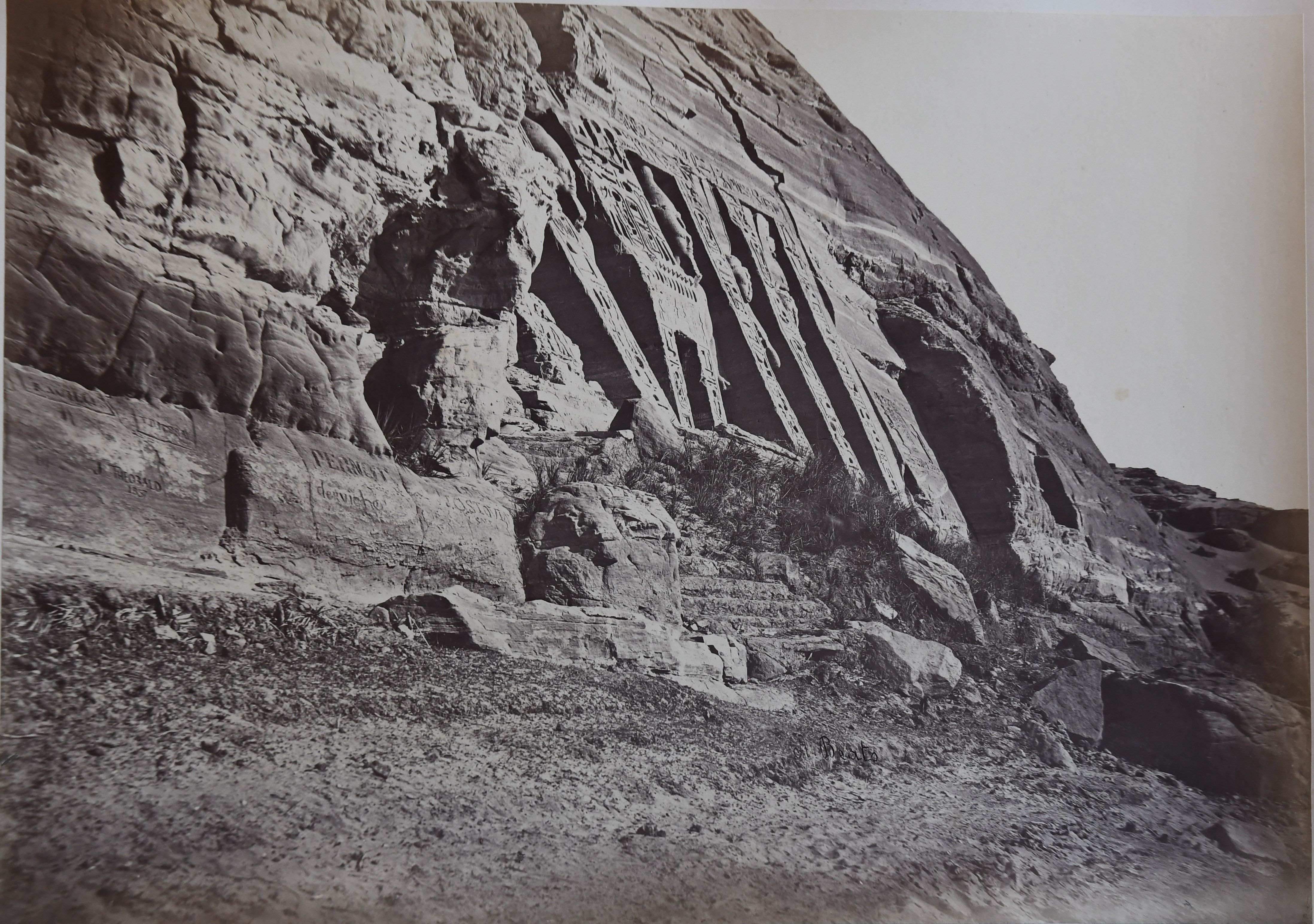 View of the façade of the Small Temple of Abu Simbel, with the colossal statues depicting the deified Pharaoh Ramesses II and Queen Nefertari. In the 1960s this temple, together with the Great Temple, were moved and placed on higher ground, as they were threatened by the rising waters of Lake Nasser following the construction of the Aswan Dam. Below, the signature of the author.