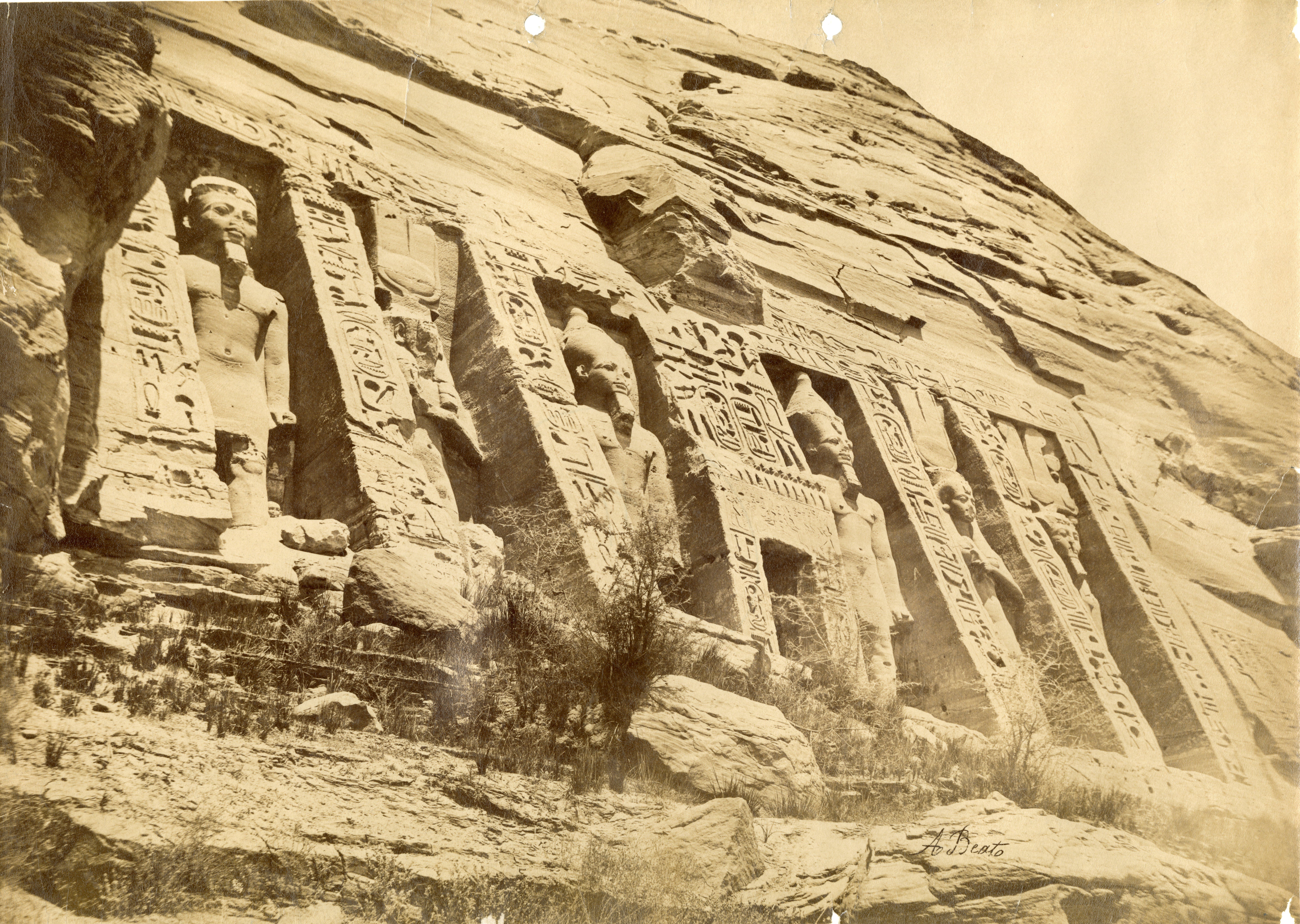 19th century colour photograph of the Temple of Ramesses II at Abu Simbel.