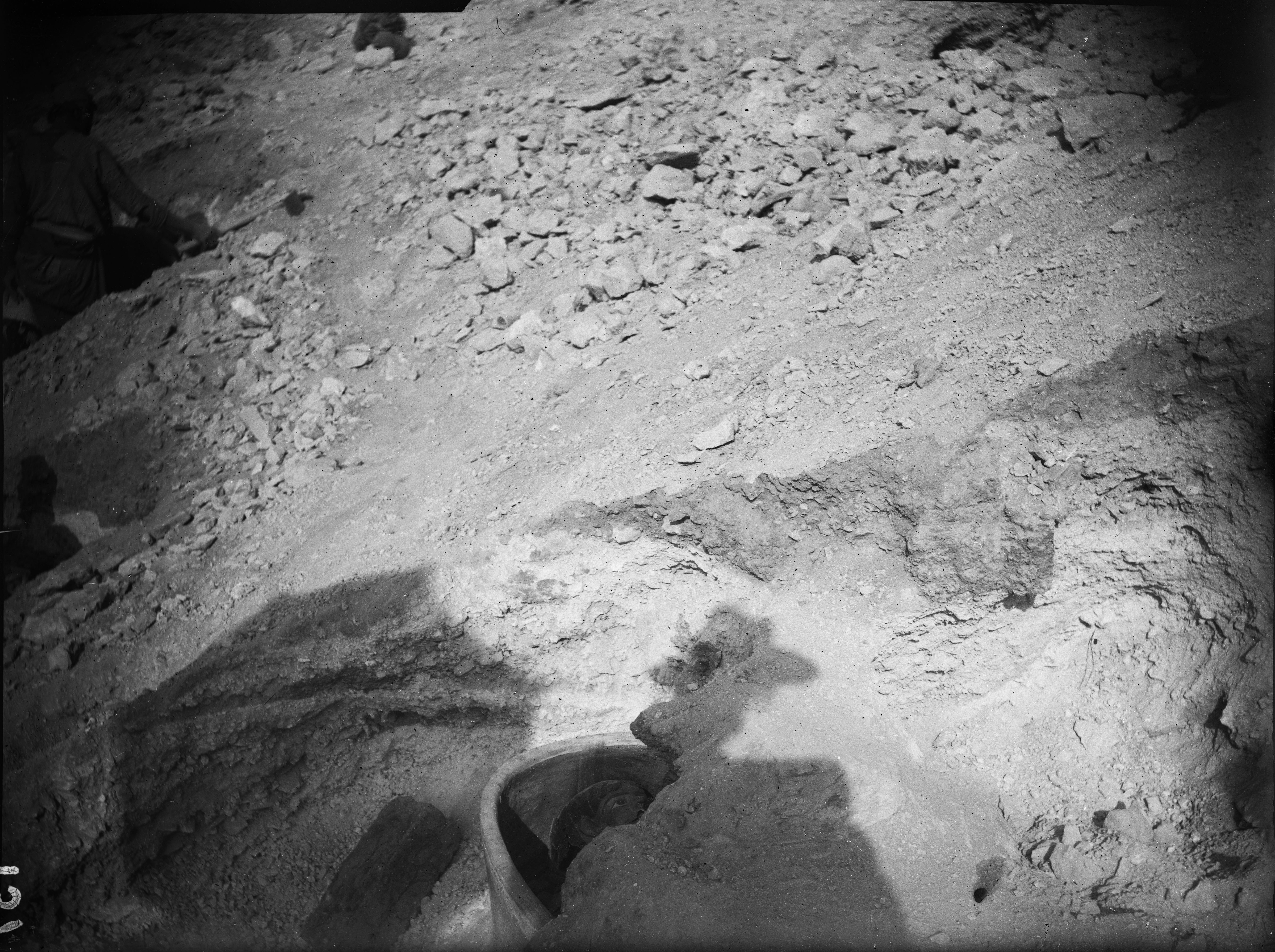 Scene of excavation near the rock-cut tombs, remains of textiles and fragments of vases can be glimpsed. Schiaparelli excavations.
