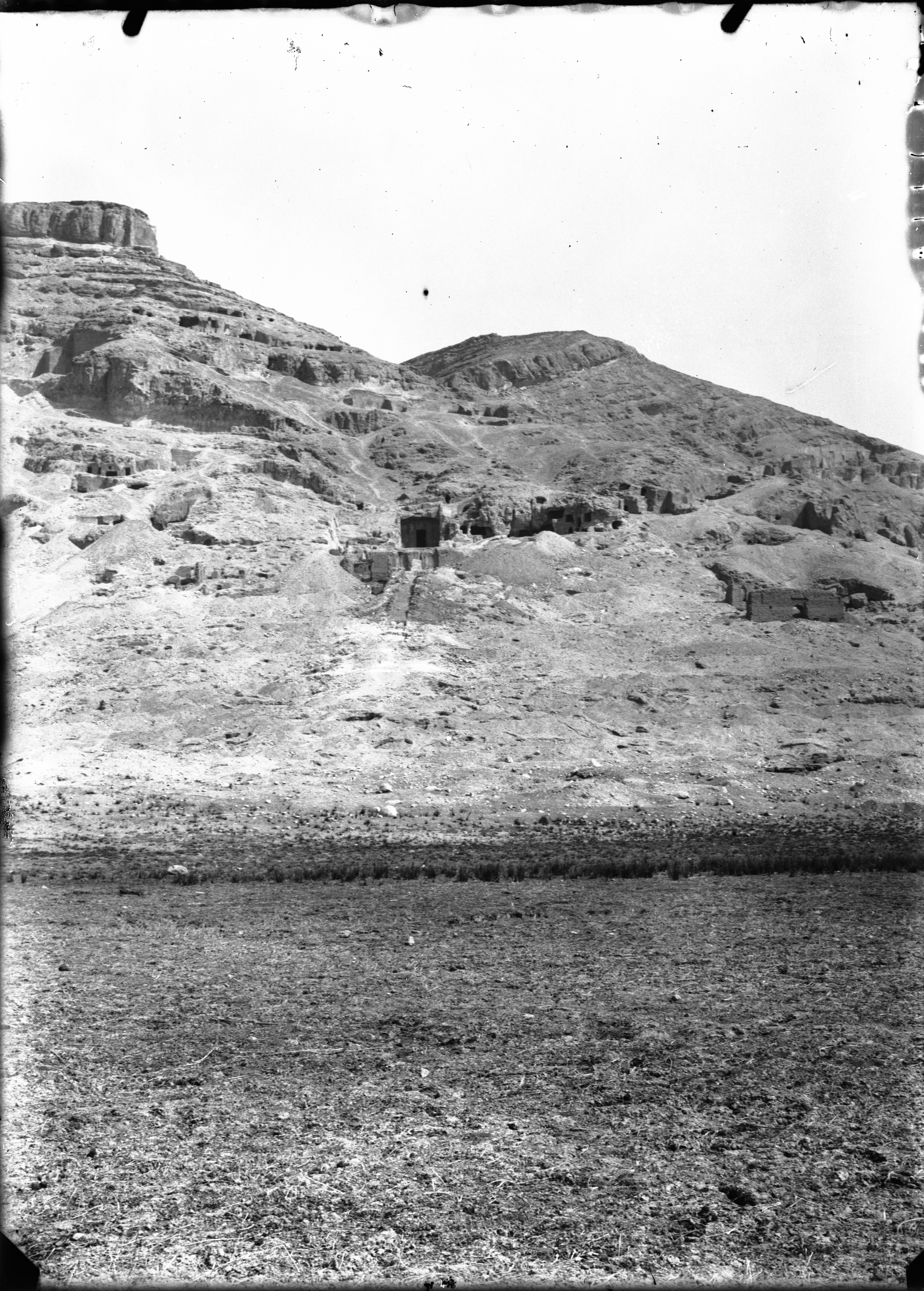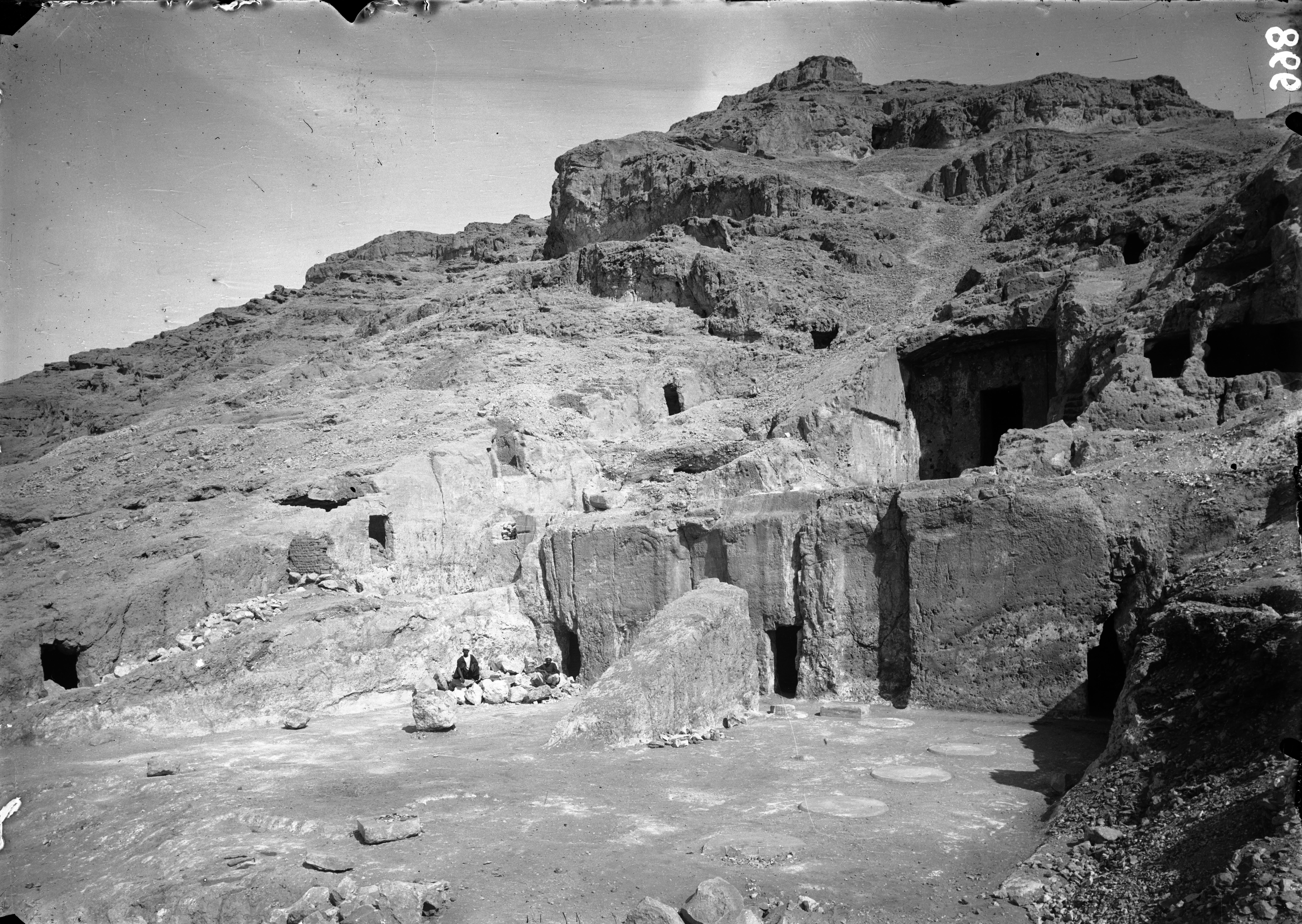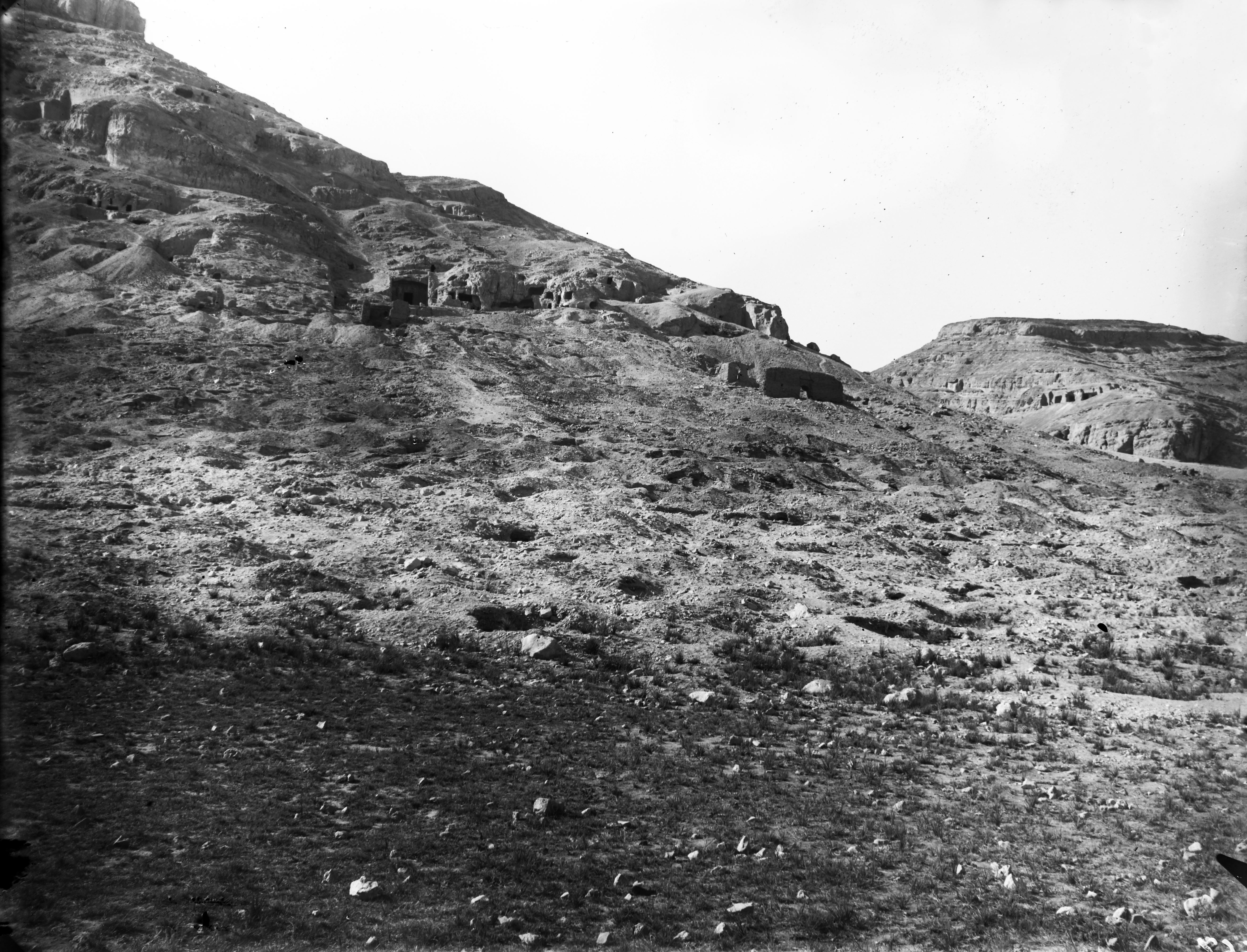 View of the rock-cut tombs, in the centre, the tomb of Wahka II. To the east (right), the so-called pylon followed by the chapel, and in the background the caves are visible. To the west (left) of the processional way, the remains of the so-called Greek tomb are recognisable. The photograph was presumably taken at the beginning of the excavation. Schiaparelli excavations.