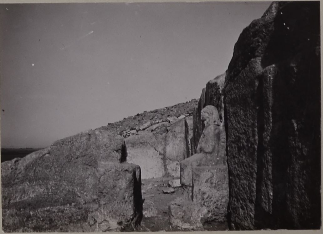 Tomb of Wahka I, lower courtyard. The statue of Wahka I is still in situ today, while the remains of a fluted column (S.04239) were brought to Turin. Schiaparelli excavations.