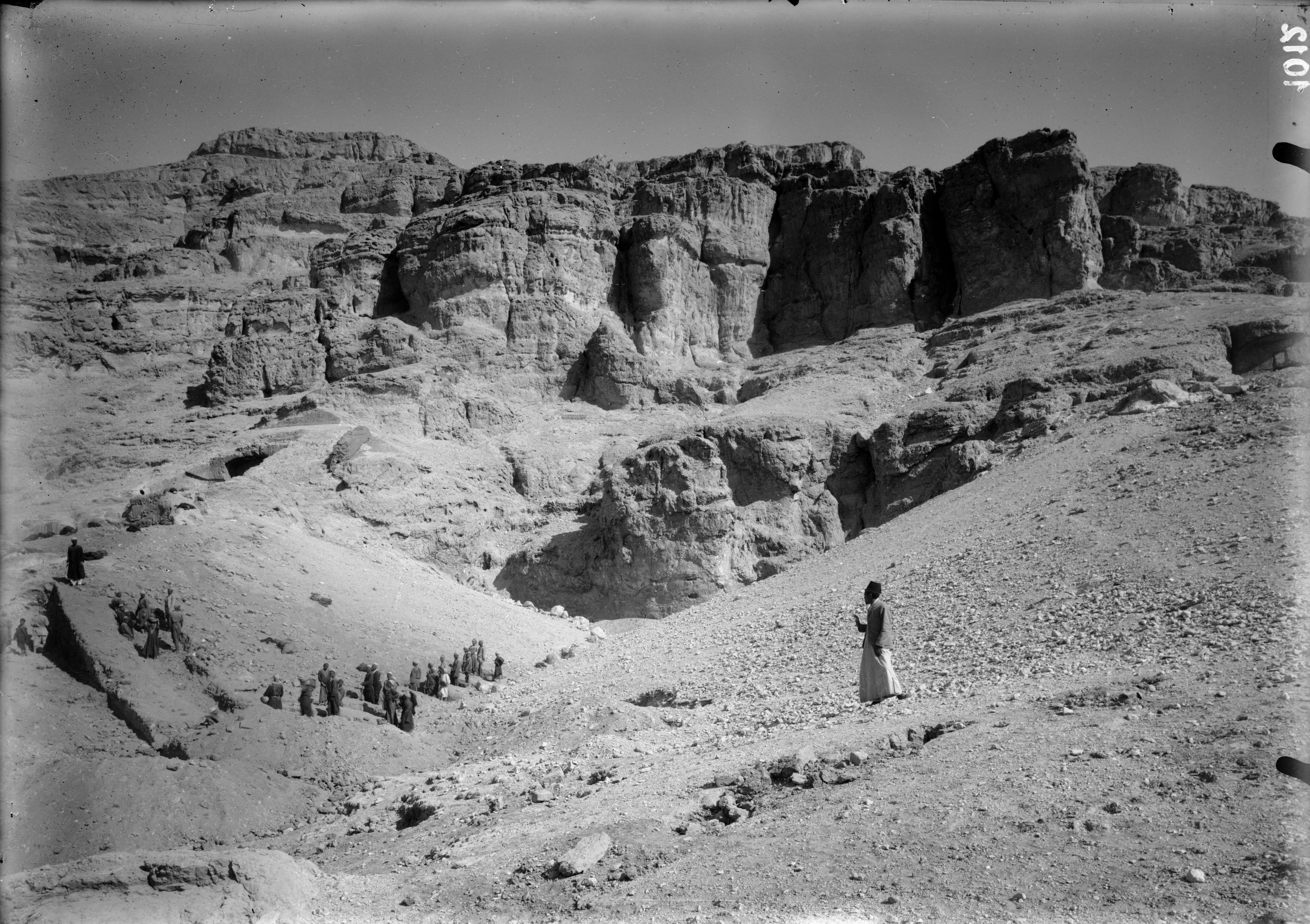 A small valley situated between the tomb of Wahka I to the west (left) and the tomb of Ibu to the east (right). The guide and interpreter Bolos Ghattas is visible at the centre. Photograph probably taken at the beginning of the excavation. Schiaparelli excavations.