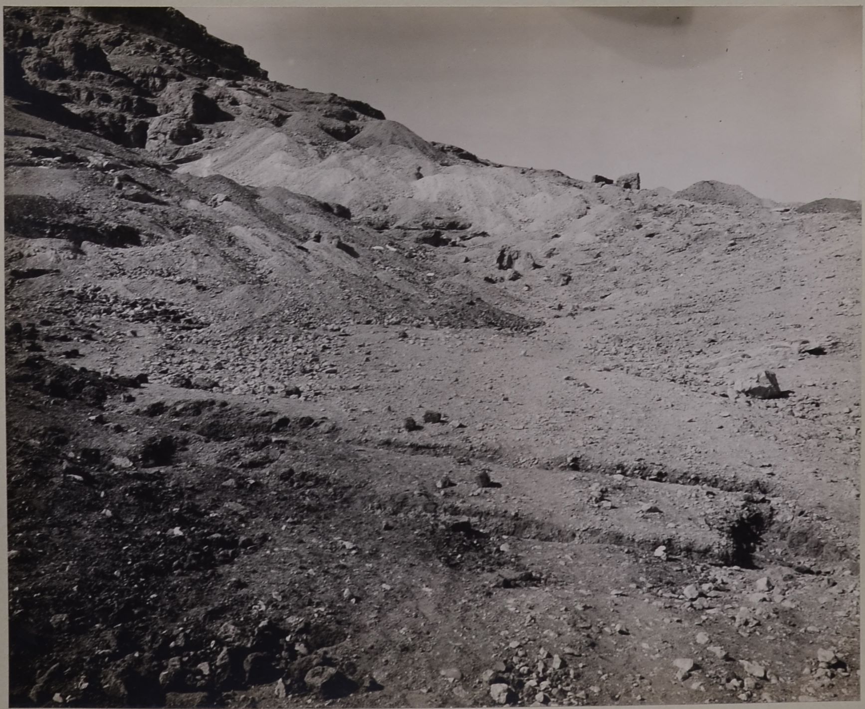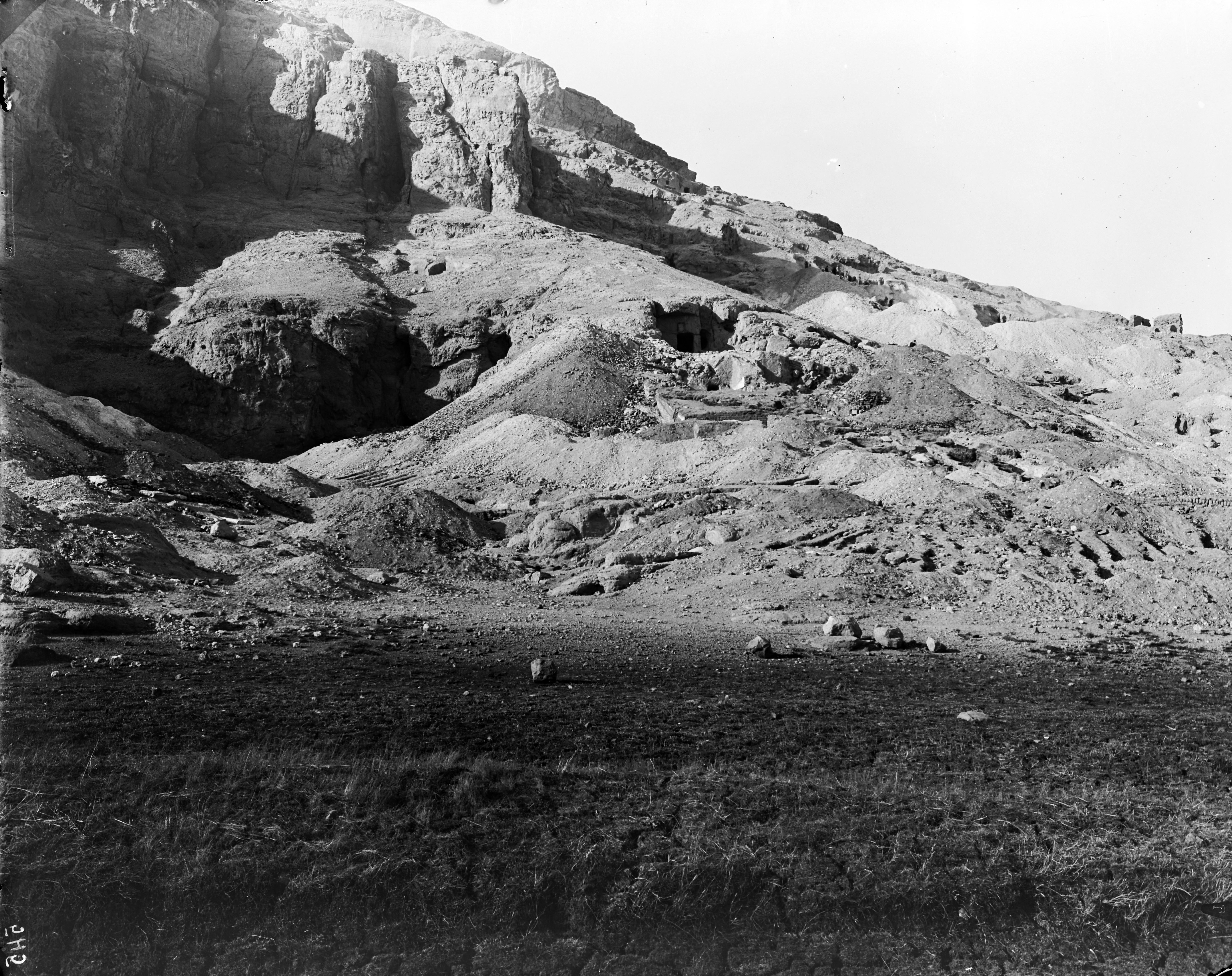 Excavations in a small depression just to the east (right) of the monumental tomb of Governor Ibu, not visible in this photo. In the upper right, behind the mountainside, the brick structures next to the tomb of Governor Wahka II can be seen. Photo album, Schiaparelli excavations.