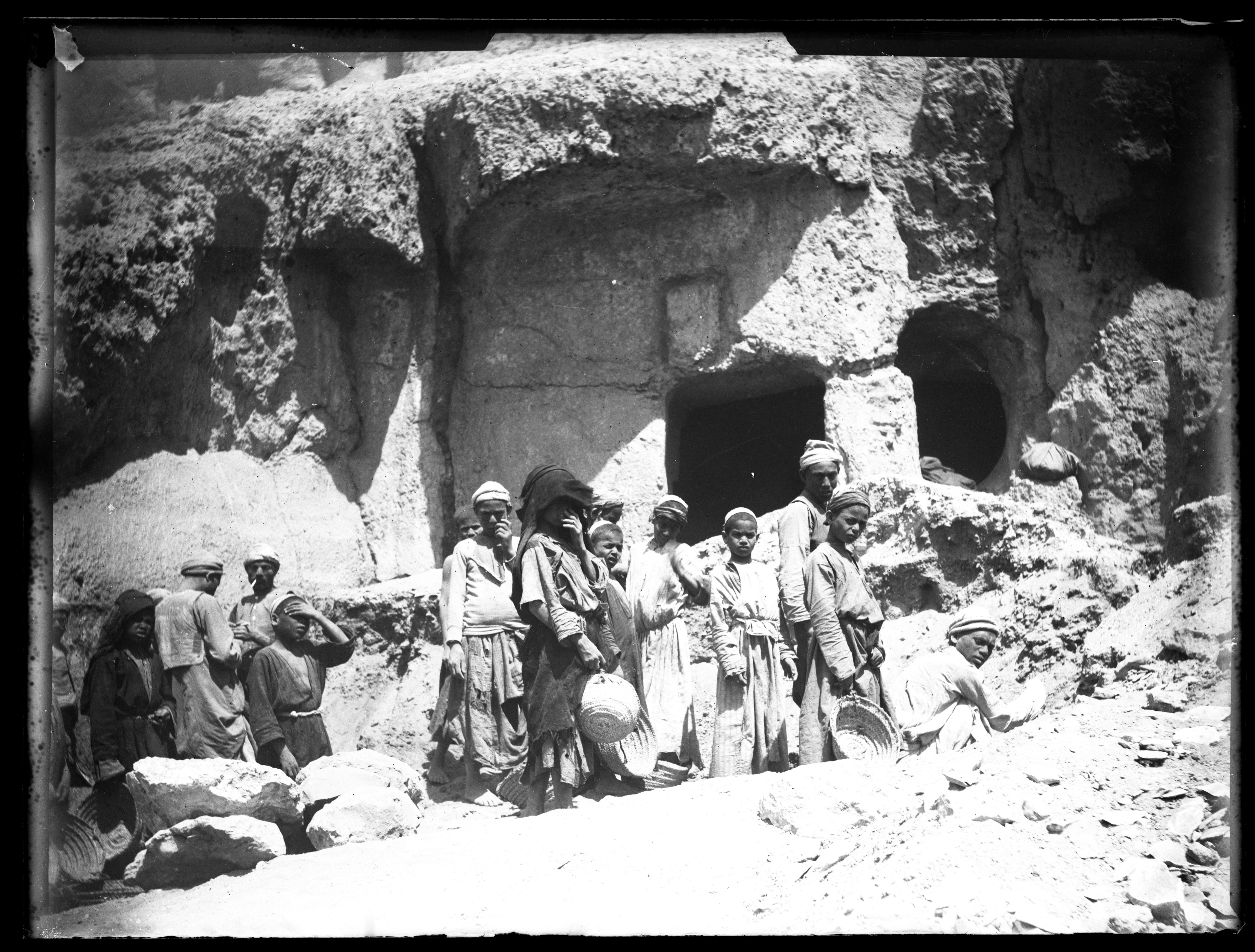 Group of young Egyptian workers on the excavation at Qau el-Kebir, in the Tomb of Ibu. Schiaparelli excavations.