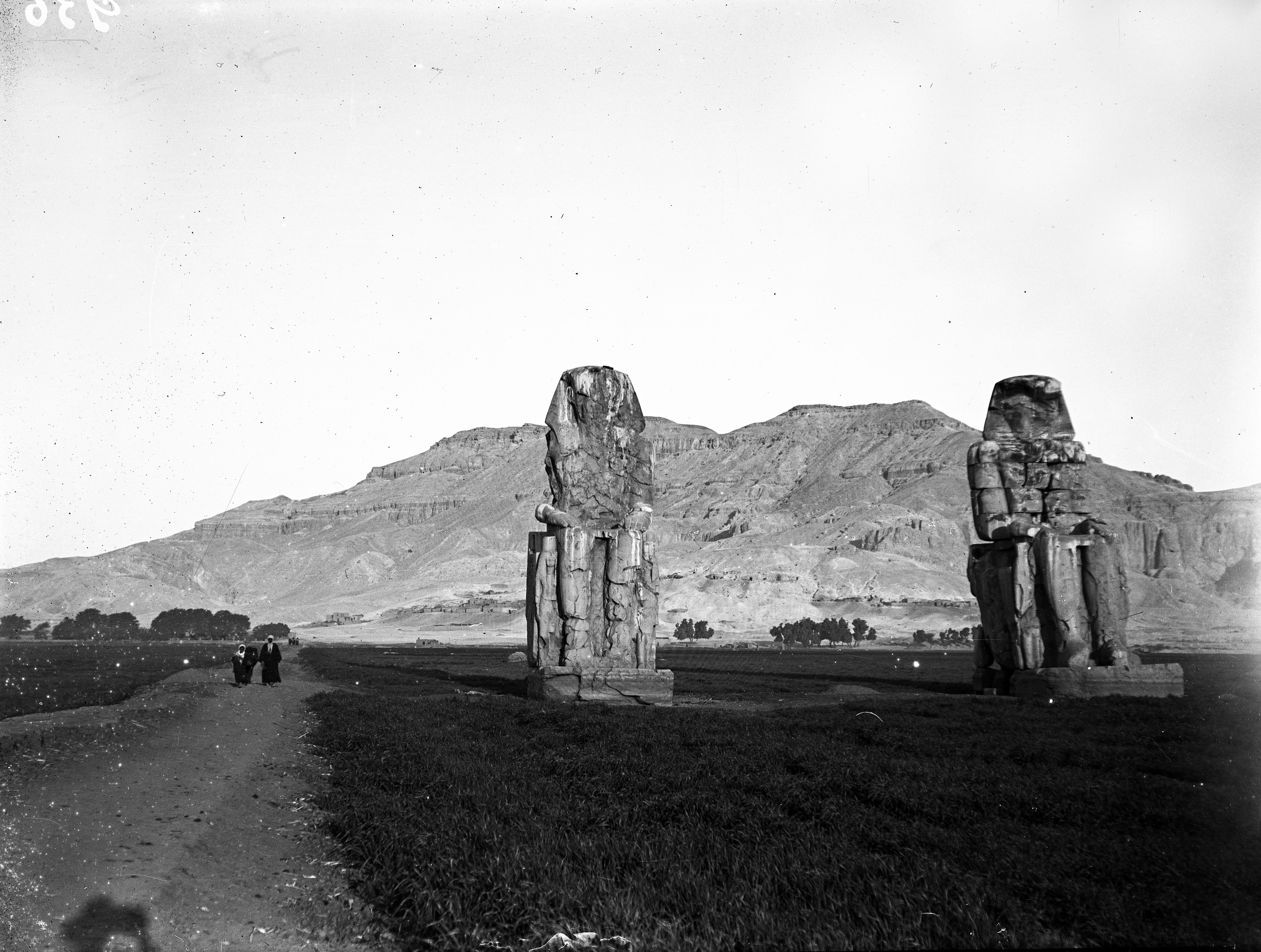 View of the so-called Colossi of Memnon. A pair of colossal statues depicting the pharaoh Amenhotep III seated on a throne. The Theban mountain is visible in the background.