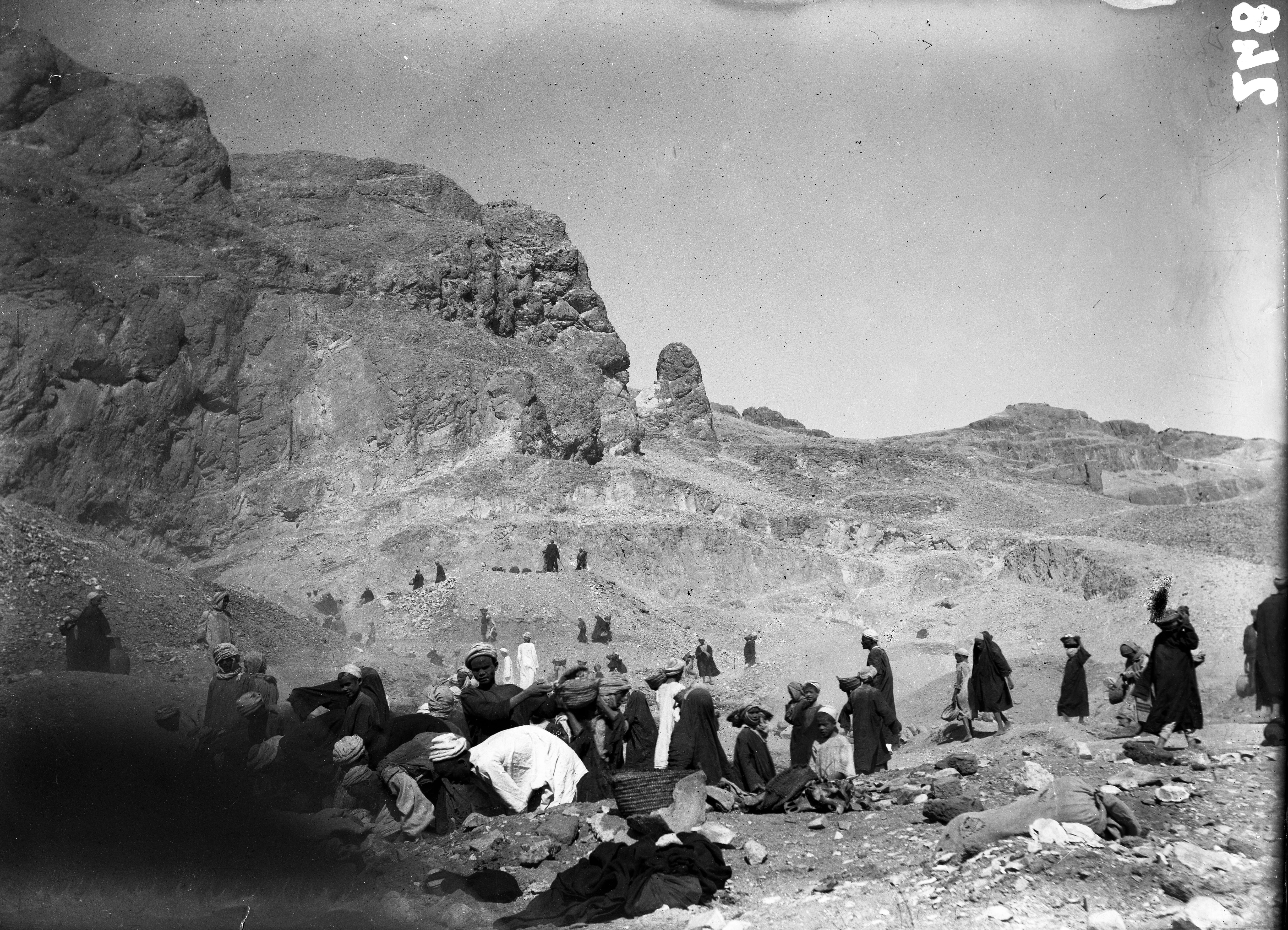 Excavations towards the northern end of the necropolis. The photograph shows teams of workmen working separately in different excavation areas. Schiaparelli excavations.