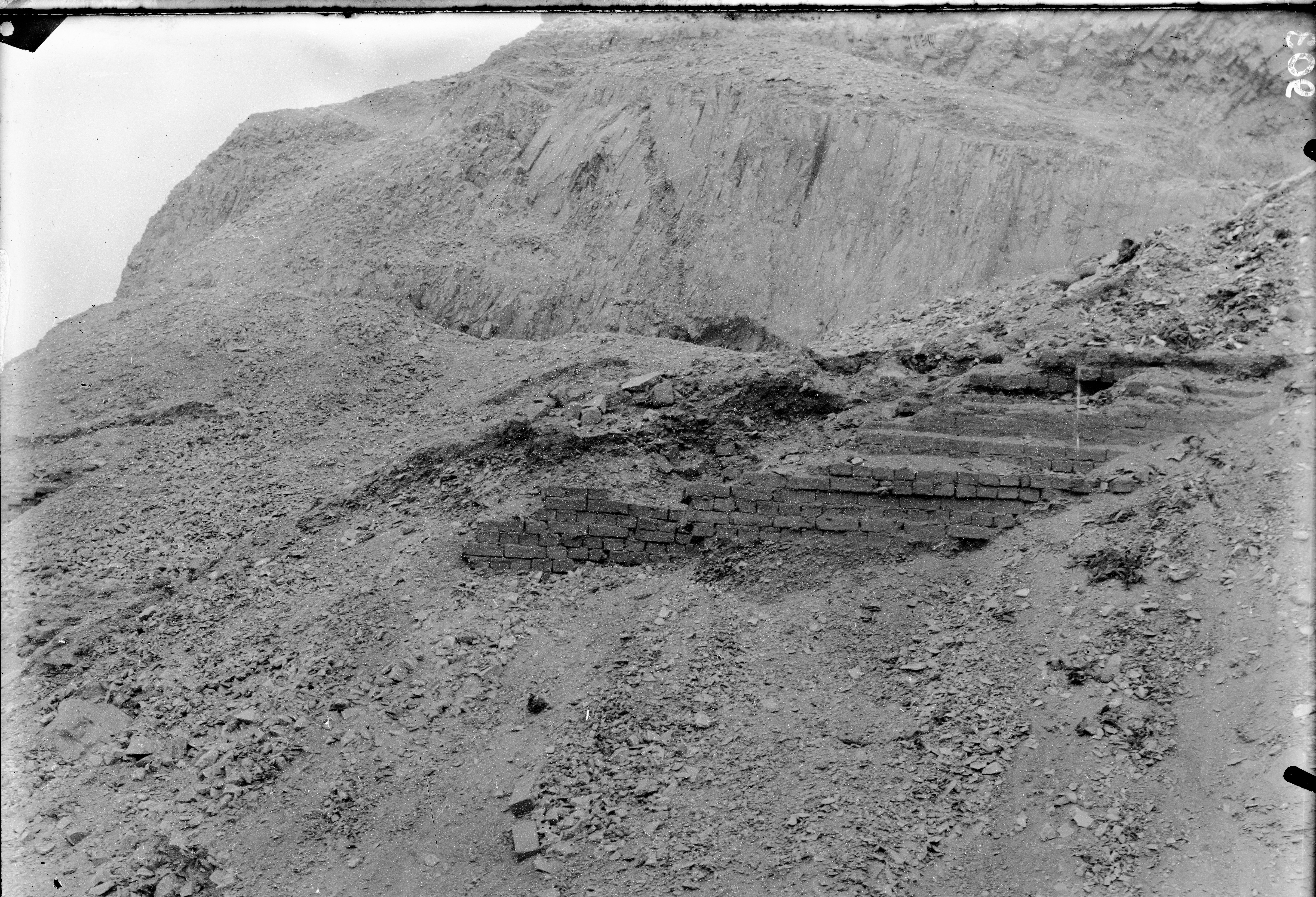 Excavations along the slope of the mountain, on the right side of the temple of the goddess Hathor. Stairs leading to a chapel G, with cartouches of Seti II. Schiaparelli excavations.